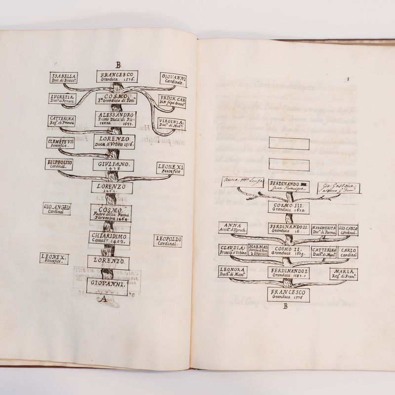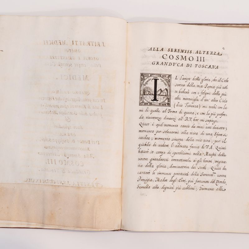 Elegante manoscritto cartaceo di 52 cc., numerate 1-48, formato in 4° 295 x 202 mm., vergato a Venezia, 1678 da Giuseppe Solari, elegante mano corsiva con specchio di scrittura di 202 x 125 circa, in antiporta finissimo disegno acquarellato monocromo con il trionfo della famiglia Medici, quattro capilettera finemente disegnati ad inchiostro, alle cc.7-8 tre alberi genealogici sintetici della famiglia Medici, SPLENDIDA LEGATURA BAROCCA IN MAROCCHINO ROSSO decorata in oro con coppia di cornici concentriche che racchiudono volute decorate a racemi, foglie, tralci di vite, fiori, con inserti in pelle scura, dorso a 5 nervi con scomparti finemente decorati in oro, tagli dorati, di probabile origine NAPOLETANA su modelli romani (segnatamente il cosiddetto "legatore emblematico").