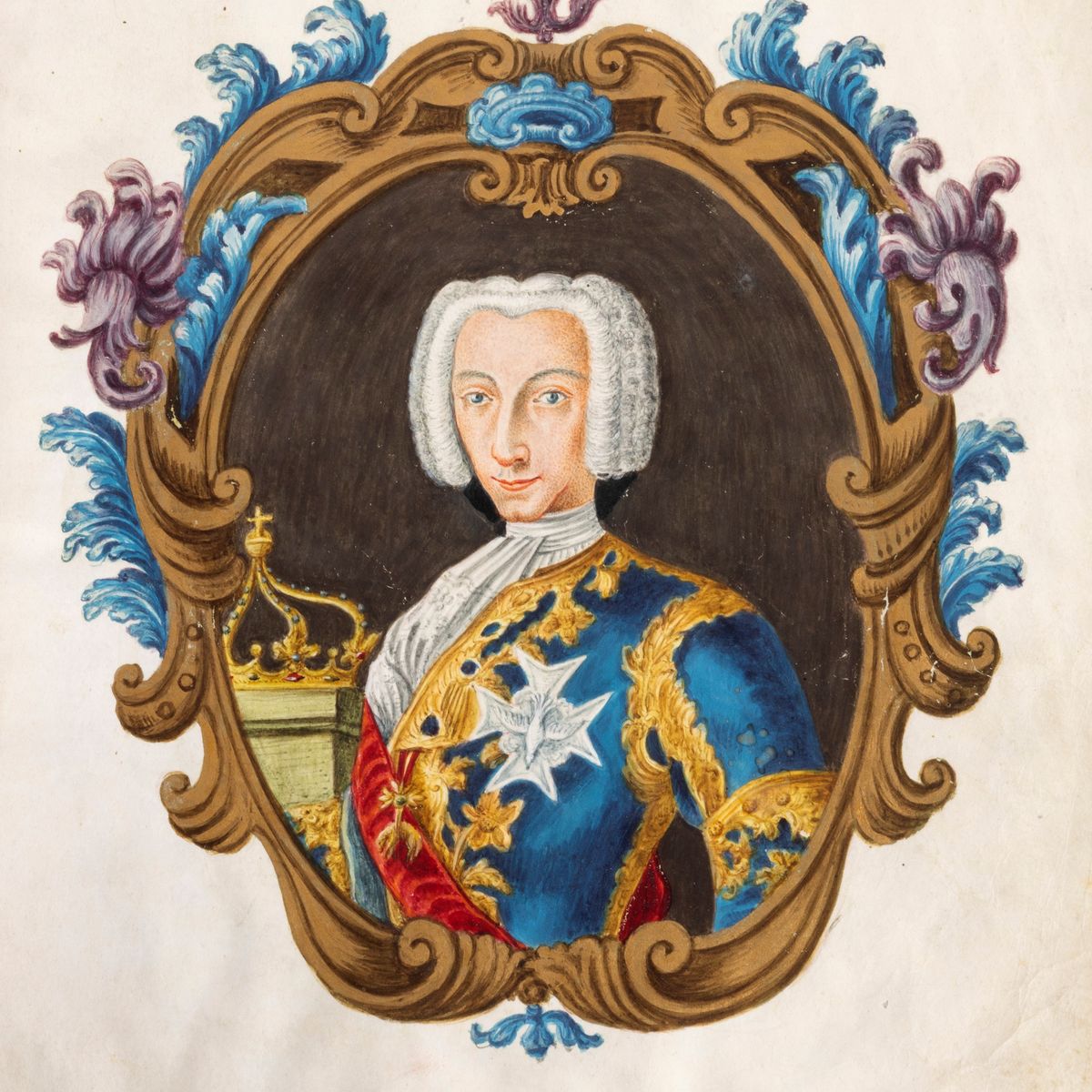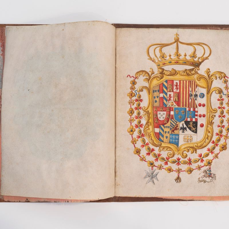 Splendido decreto su pergamena, 272 x 205 mm., composto da due pagine decorate ad acquarello con il ritratto di Carlo di Borbone e lo stemma del Regno di Napoli e Sicilia, tre pagine di atto elegantemente vergate con firma all'ultimo foglio "Yo el Rey", ogni pagina protetta da un foglio di seta rosa, timbro a secco con insegne reali e firma in calce al documento di Gaetano Maria Brancone (1697-1758), segretario della Città di Napoli. Legatura in vitello marrone con cornici dorate ai piatti e decorazioni in oro.