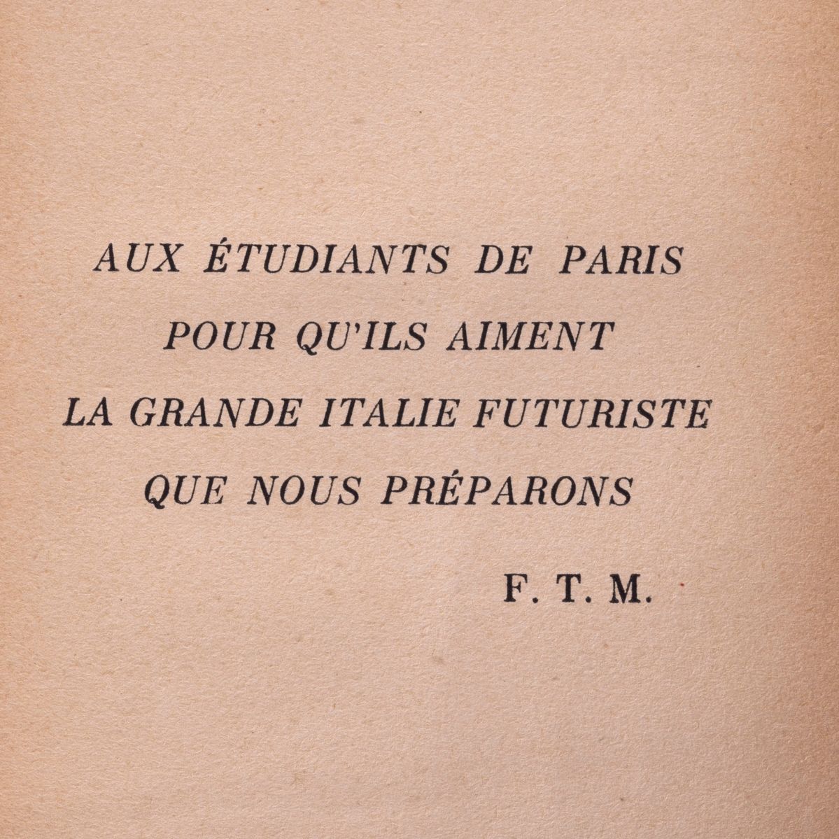 Prima edizione, pubblicata due anni dopo il celebre Manifesto. All'occhietto la dedica di Marinetti al pittore divisionista romano Pietro Mengarini.