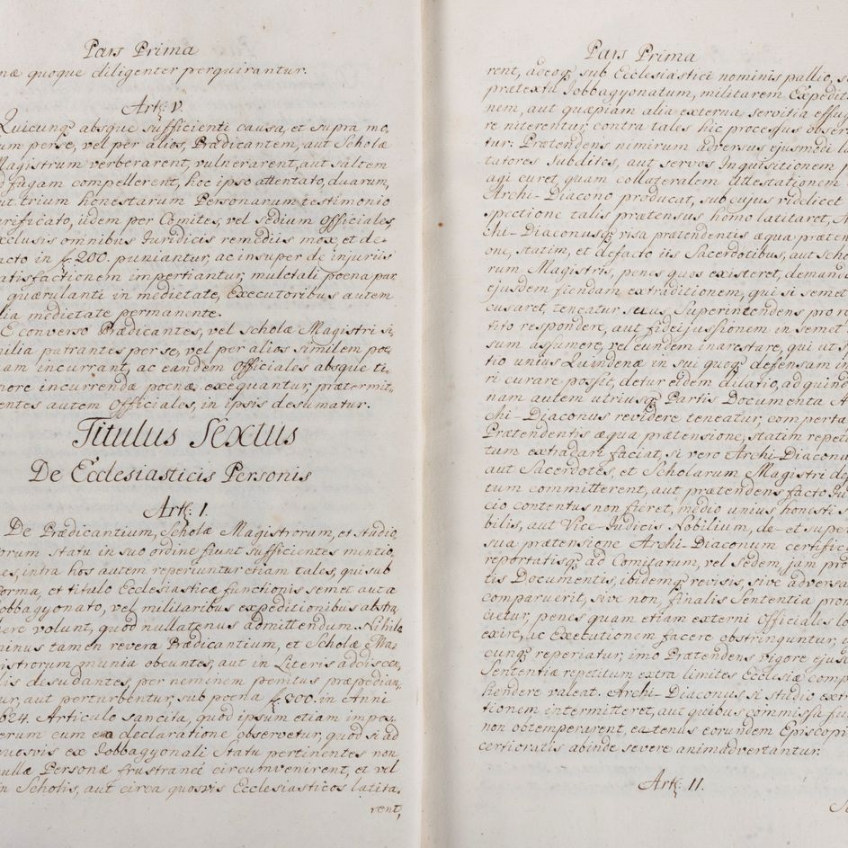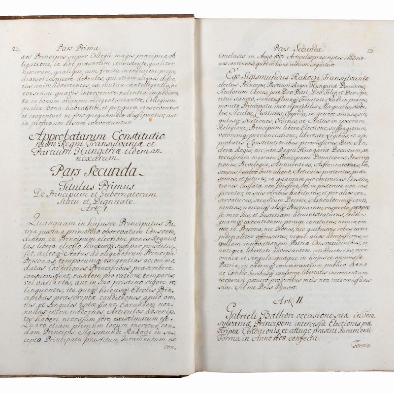 Le Constitutiones Approbatae sono una raccolta di decreti e pratiche legali codificate nel XVII secolo e pubblicate nel 1653 sotto il governo del Principe Gyorgy Rakoczi II (1648-1660). Raro e importante manoscritto di anonimo in bella grafia, perfettamente leggibile, della Costituzione del Principato della Transilvania, regione che tornò sotto il dominio asburgico a seguito della sconfitta turca nella Battaglia di Vienna nel 1683.
