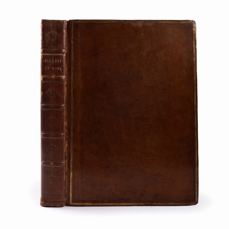 Rma, Gio. Giacomo Rossi, s.d [1655-1678]. In 2°. 2 parti in 1 vol ciascuna con proprio frontespizio su doppia pagina completamente inciso, con dediche al cardinal Barbero Camerlengo e Camillo Massimi Mecenate, la seconda parte intitolata "Nuovi disegni dell'Architetture, e piante dè palazzi di Roma dè più celebri architetti [...] Libro Secondo". Prima parte con 41 tavole, seconda con 60 tavole, tutte su doppia pagina incise all'acquaforte su carta vergellata, ciascuna con didascalia, restauri, qualche arrossatura e lieve fioritura, piccolo foro di tarlo al margine bianco di alcune carte, tracce di umidità alle ultime carte, legatura del XIX secolo in pelle, piatti inquadrati da cornice in oro e elegante cornice impressa a secco, titolo in oro al dorso, piccoli restauri al piatto posteriore, qualche abrasione, leggeri segni di usura. Tassello cartaceo del libraio inglese Alan G. Thomas, la cui biblioteca venne venduta a Londra da Sotheby's nel 1993, lotto 156.