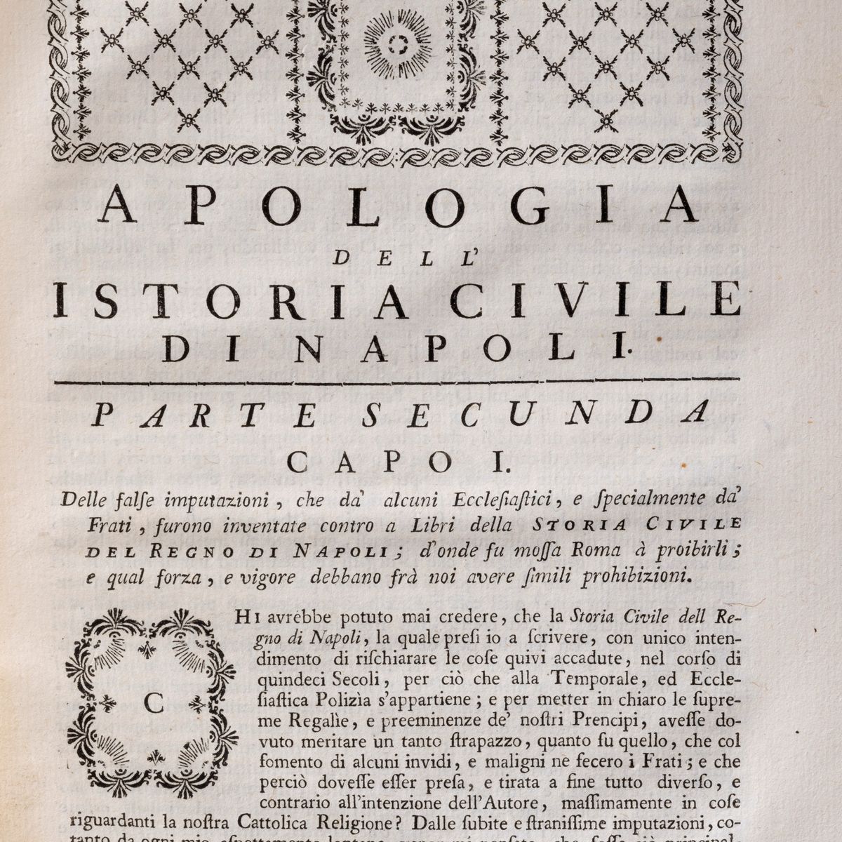 Losanna, a spese di Francesco Grasset, 1760. In 4°, pp. XII-300+96 (Annotazioni e risposta alle annotazioni critiche sopra il nono libro del tomo II della Storia Civile )+ 38 (Indice). Legatura coeva in pelle coeva, cordoni, titolo e fregi in oro al dorso.