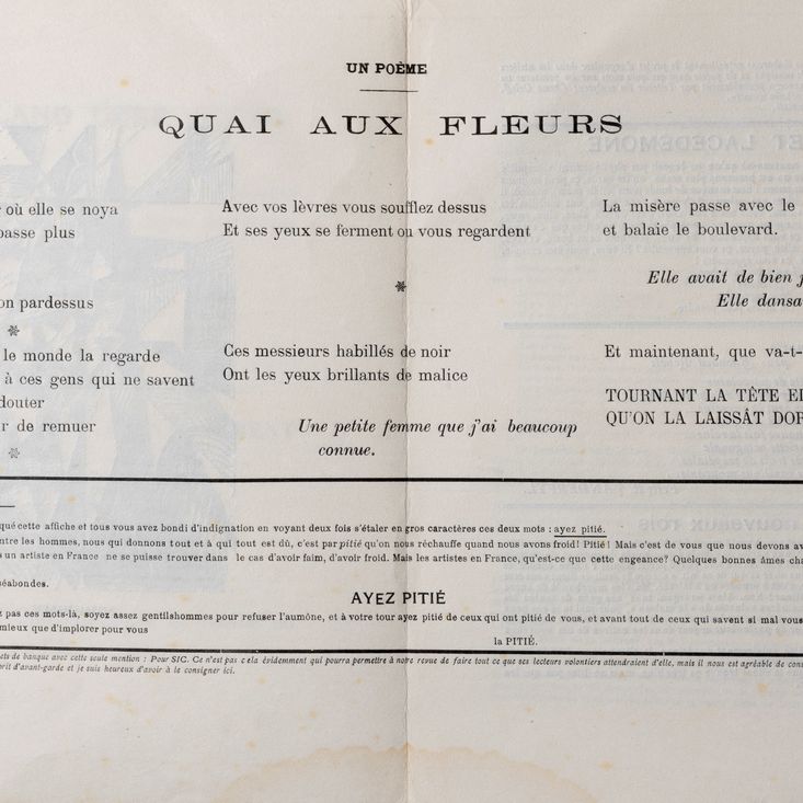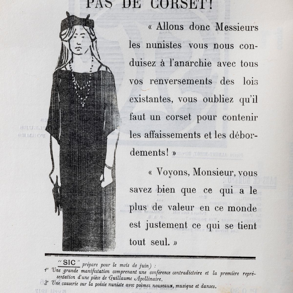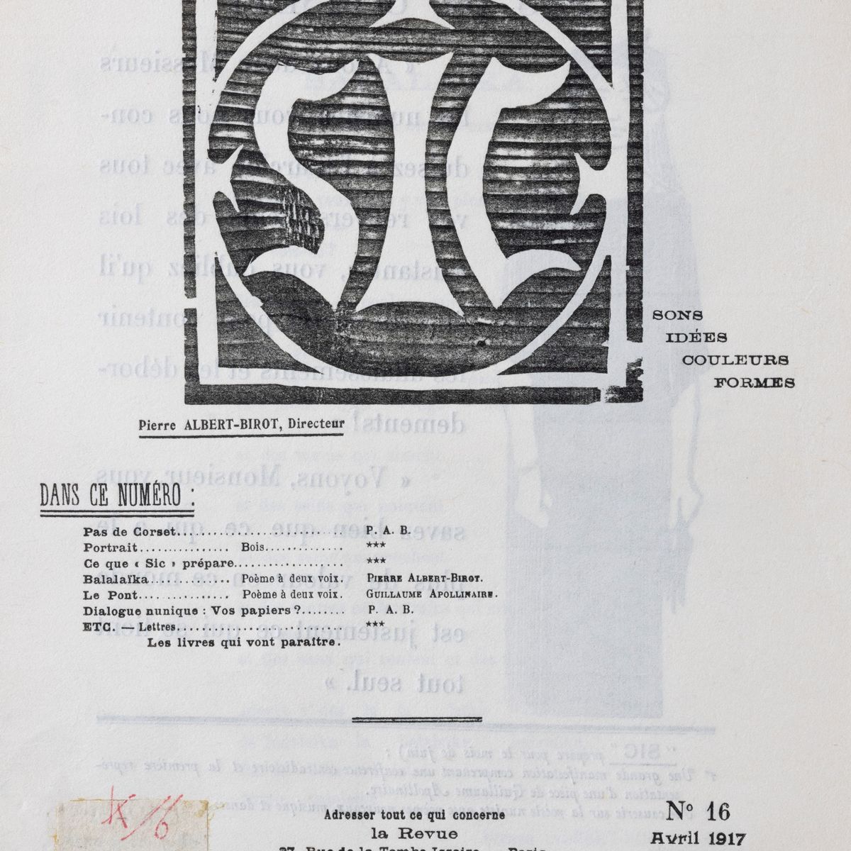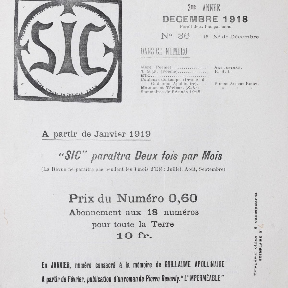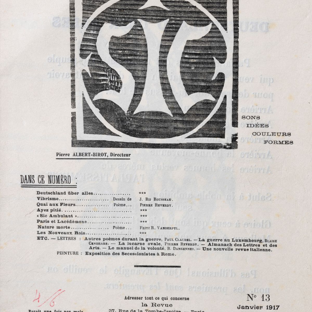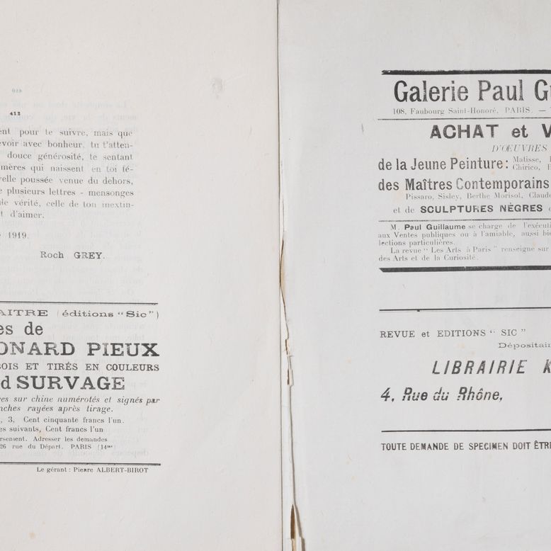 Parigi, da gennaio 1916 a dicembre 1919 (n.1-54). 54 numeri in 41 uscite, la maggior parte in fascicoli sciolti ripiegati, alcuni pinzati e con brossura, numerose tavole in bianco e nero nel testo, il fascicolo numerato 8-9-10 (agosto-settembre-ottobre 1916) contiene una tavola sciolta con disegno originale a colori, il fascicolo numerato 40-41 (febbraio-marzo 1919) contiene una riproduzione fotografica incollata sul foglio di una scultura di Ossip Zadkine, considerata la natura fragile della carta impiegata diversi fascicoli hanno strappi lungo la piegatura e i bordi con rare e piccole mancanze, fascicolo 37-38-39 con uno strappo con mancanza all'angolo esterno inferiore, leggera gora d'acqua su alcuni fascicoli, qualche fioritura e leggera brunitura. Al frontespizio il numero 12 riporta manoscritto a inchiostro rosso "1/10", dal numero 13 al 24 in inchiostro rosso sul frontespizio è segnato "4/6", dal numero 40-41 al 53-54 sul frontespizio la tiratura riporta "Tirace sur Chine_ 4 exemplaires. Exemplare n. 2."