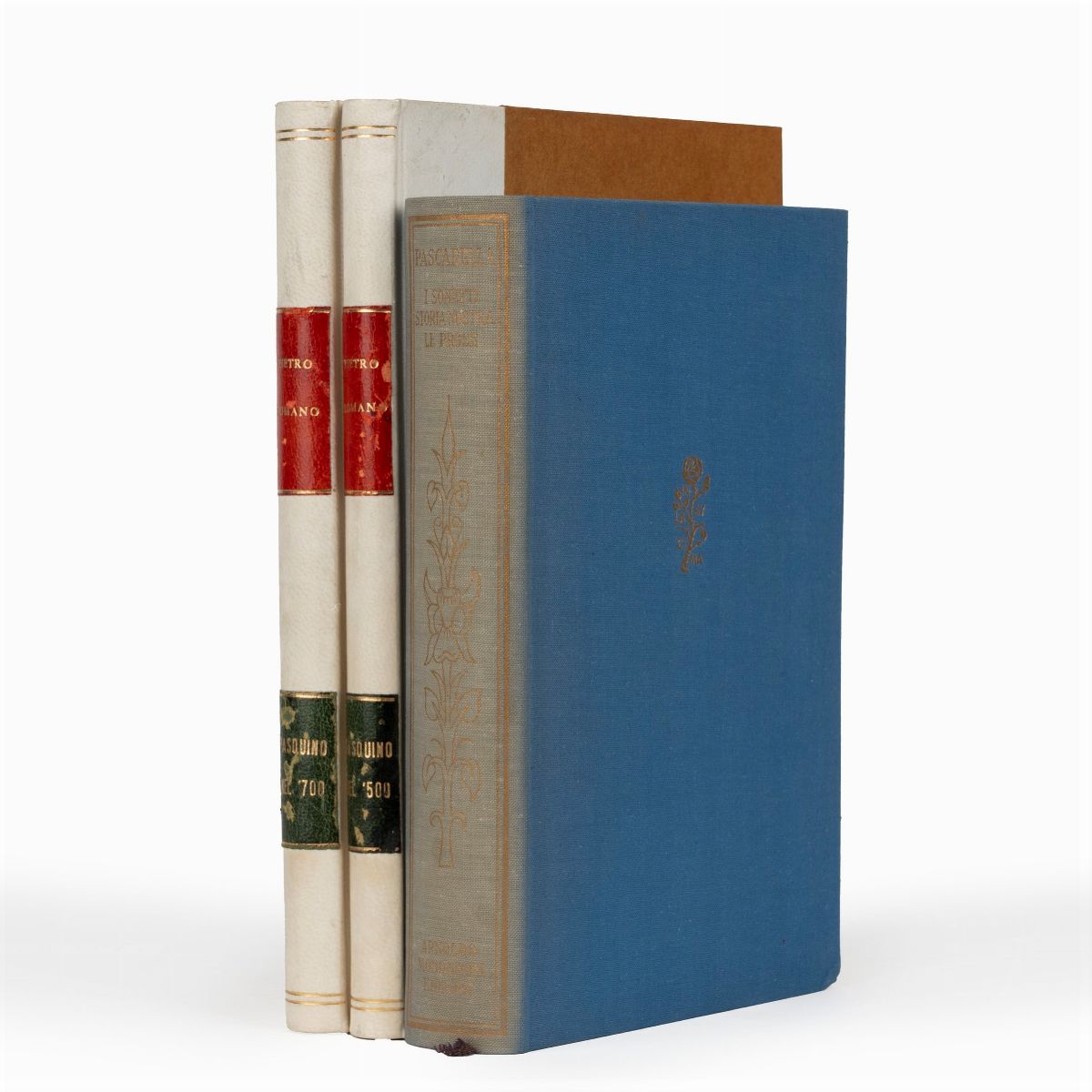 Arnoldo Mondadori, 1955. In ottavo. frontespizio stampato in rosso e nero ed entro cornice tipografica e firma dell'editore, ritratto dell'autore in ovale inciso in rame, illustrato con 16 disegni dell' autore stampati in rosso a piena pagina, legatura in tela azzurra con fregio in oro al piatto anteriore, dorso con fregi in oro, con custodia in cartonato illustrato a colori. § Nel lotto anche 2 opere di Pietro Romano, Pasquino nel settecento, Roma tipografia agostiniana, 1934 e 1936.