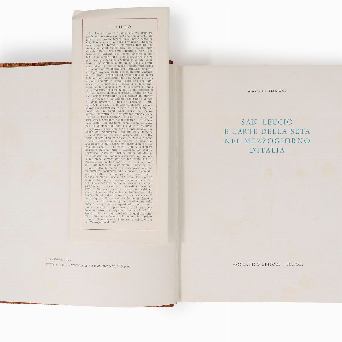 Edizione di soli 500 esemplari conservati in astuccio di tela con titolo in oro al dorso. In appendice ristampa della famosa opera: Origine della Popolazione di S. Leucio e suoi progressi fino al giorno d'oggi corrispondenti al buon governo di essa di Ferdinando IV Re delle Sicilie. Napoli, Stamperia Reale, 1799.