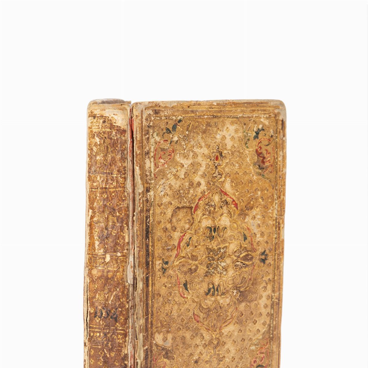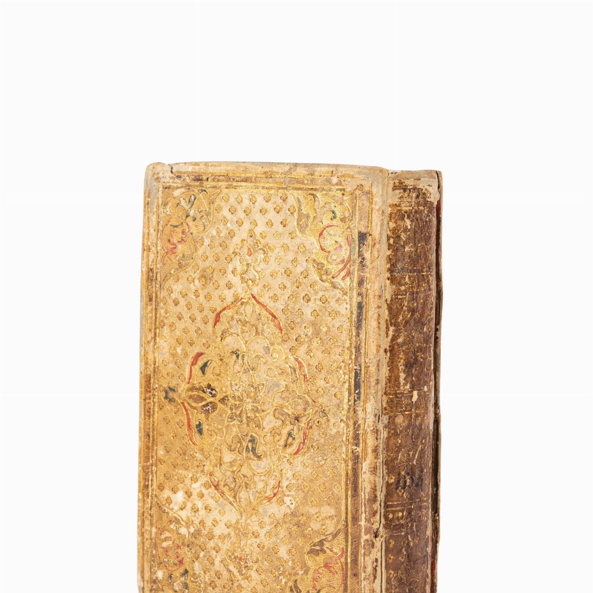 Lione, Sebastiano Grifo, 1554. In 12°. Marca tipografica del Grifo al frontespizio, esemplare reglée, prima carta leggermente staccata e con marginali strappetti, uniforme brunitura della copia, splendida legatura lionese in piena pergamena dipinta con cornice a duplice filetto, decorazioni fitomorfe, una grande losanga al centro dei piatti con colorazioni in rosso, verde, blu, tagli dorati e goffrati, perdite di colore, spellature, mancanze alla cuffia inferiore.