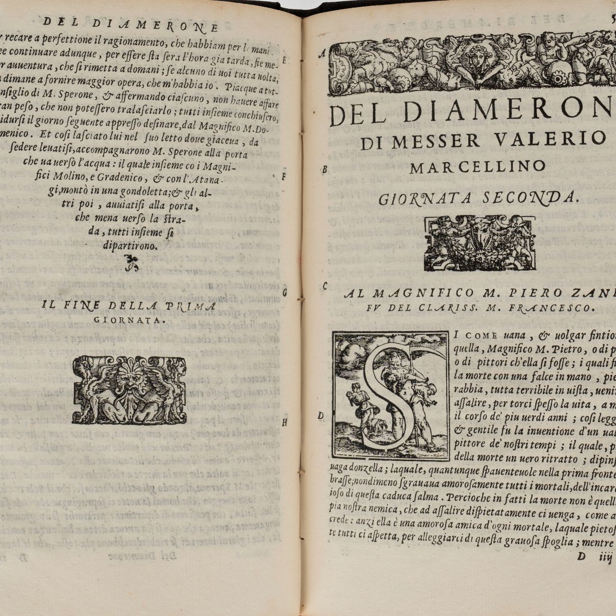 Venezia, Giolito, 1564. In 4°. Marca tipografica xilografica al frontespizio ed in fine, iniziali figurate, bei fregi incisi in legno, rare arrossature e fioriture, legatura moderna in pelle nera e fregi dorati al dorso a 5 nervi.