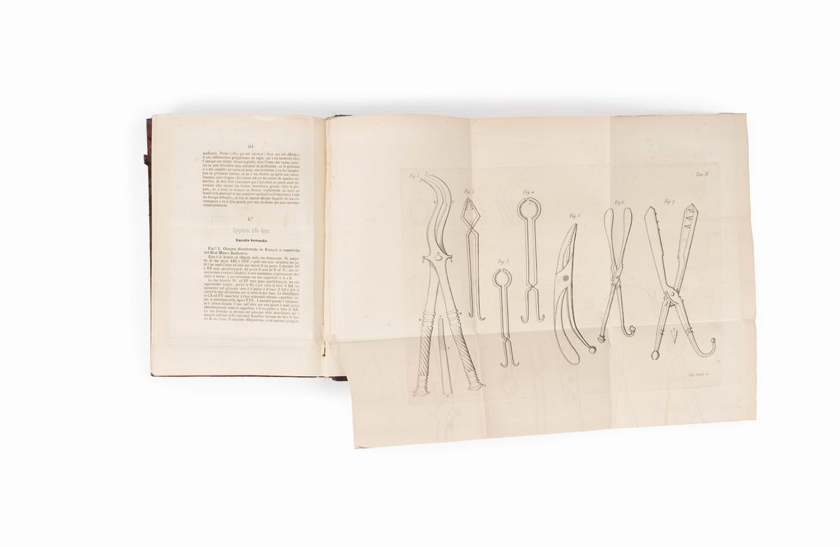 Napoli, 1858 - 1866. 8°, 4 voll. legati in due, Parte prima: Sul restringimento e la gangrena dell'intestino ernioso e su la diagnosi e cura delle emorragie uterine. Napoli, Gioja, 1858. pp. 248-(2), con una tavola incisa in rame più volte ripiegate f.t. Parte seconda: Sull'apparecchio amovo - inamovibile nella cura delle fratture, la cefalotrissia, l'uretomia e la paracentesi vescicale. Napoli, Gioja, 1860. pp. 222 con 4 tavole. incise su rame più volte ripiegate f.t. Parte terza: Sulle anchilosi. Napoli, Gioja, 1864. pp. 239 con 2 tavole più volte ripiegate f.t. Parte quarta: Per la neutralità dei feriti e l'aumento del personale sanitario militare in tempo di guerra. Napoli, Biraghi, 1866. pp. (4)-53-(3). Legatura coeva mz. pelle, titolo e fregi in oro al dorso.