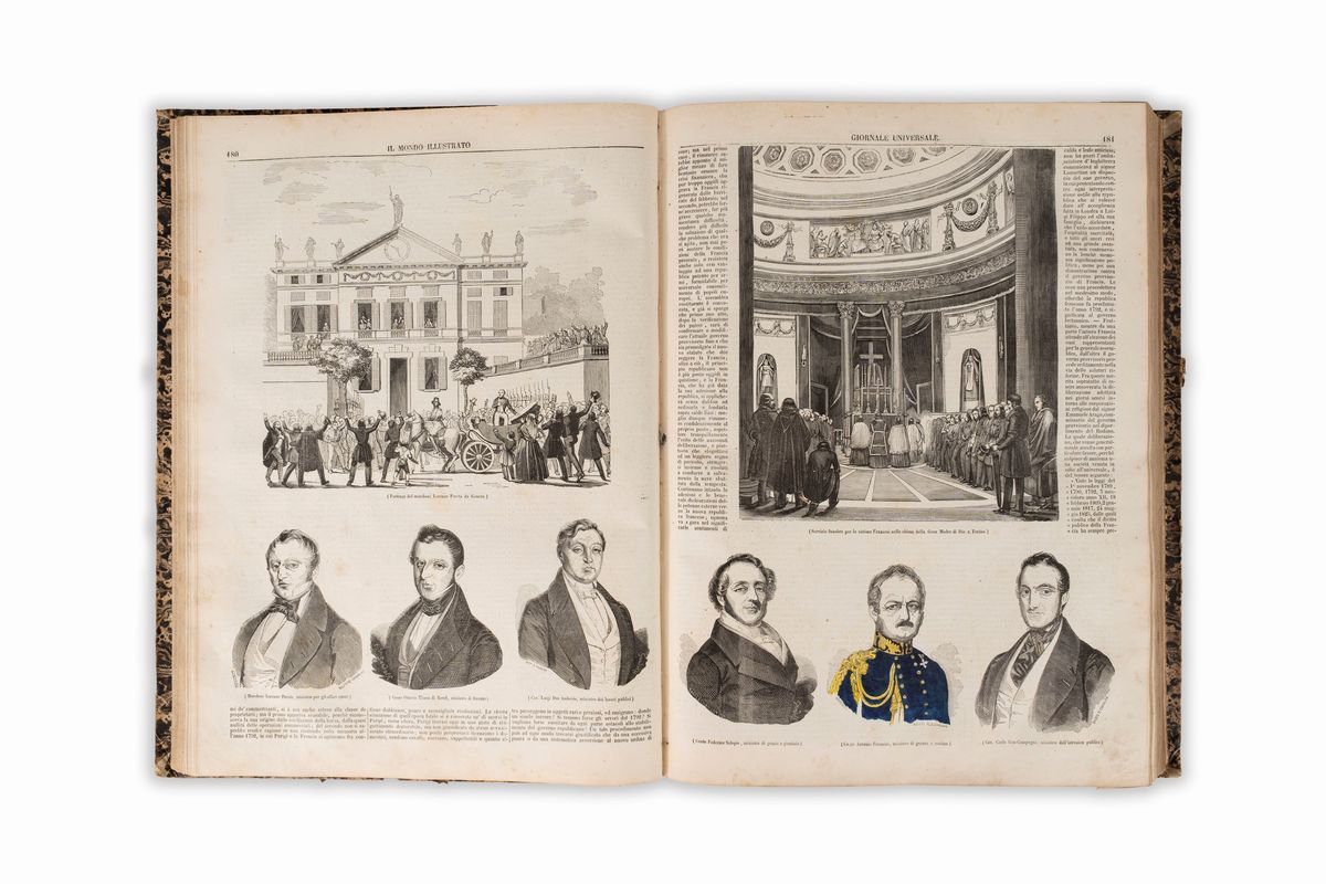 Torino, Giuseppe Pomba, 1847 -1848. Due volumi in folio. I giornali sono adorni di moltissime incisioni intercalate nel testo, anche a piena pagina ed alcune colorate, fioriture, macchie ed arrossature sparse, legatura in mezza pelle marrone, spellature.