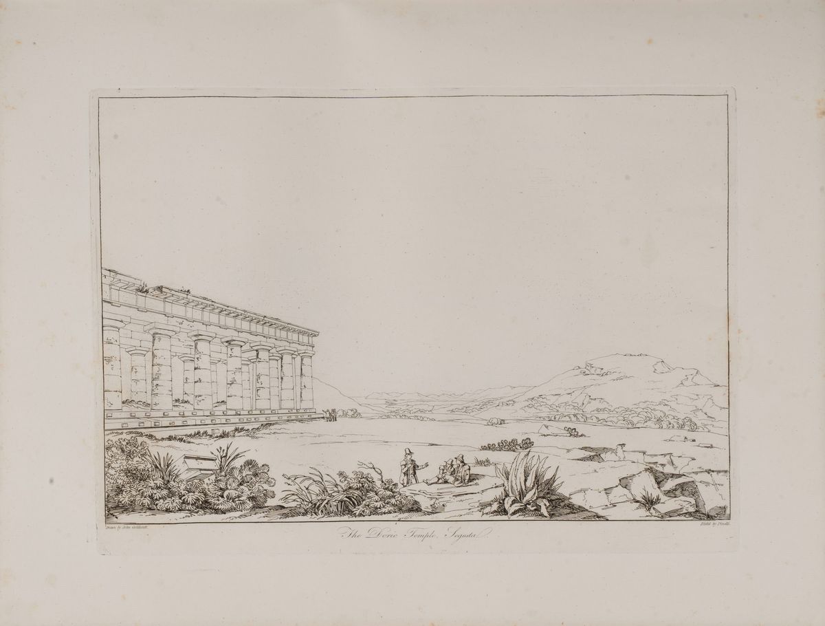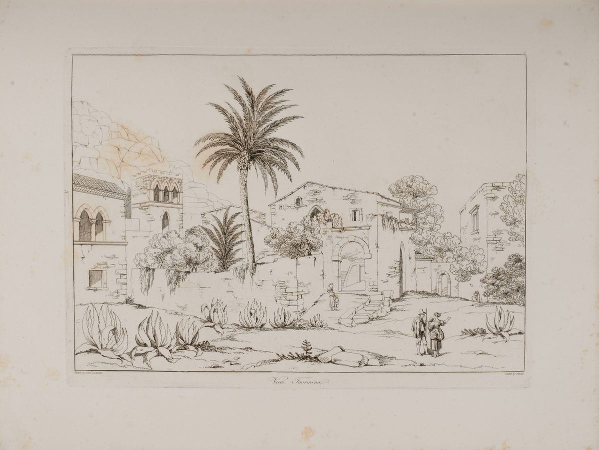 Folio, frontespizio inciso su rame con titolo inciso, in basso veduta di Catania, pp. (16) e 41 tavole incise su rame da Bartolomeo Pinelii, su disegno dell'autore, che offrono una bella e romantica visione delle Sicilia dell'epoca: Palermo e il suo lungomare, il teatro antico d Segeste, il castello di Aci, Messina e il suo porto ed altre vedute di località siciliane con le vestigia delle loro antiche civiltà. Lievi fioriture marginali. Legatura coeva mz. pelle con angoli, tassello, titolo e fregi in oro al dorso.