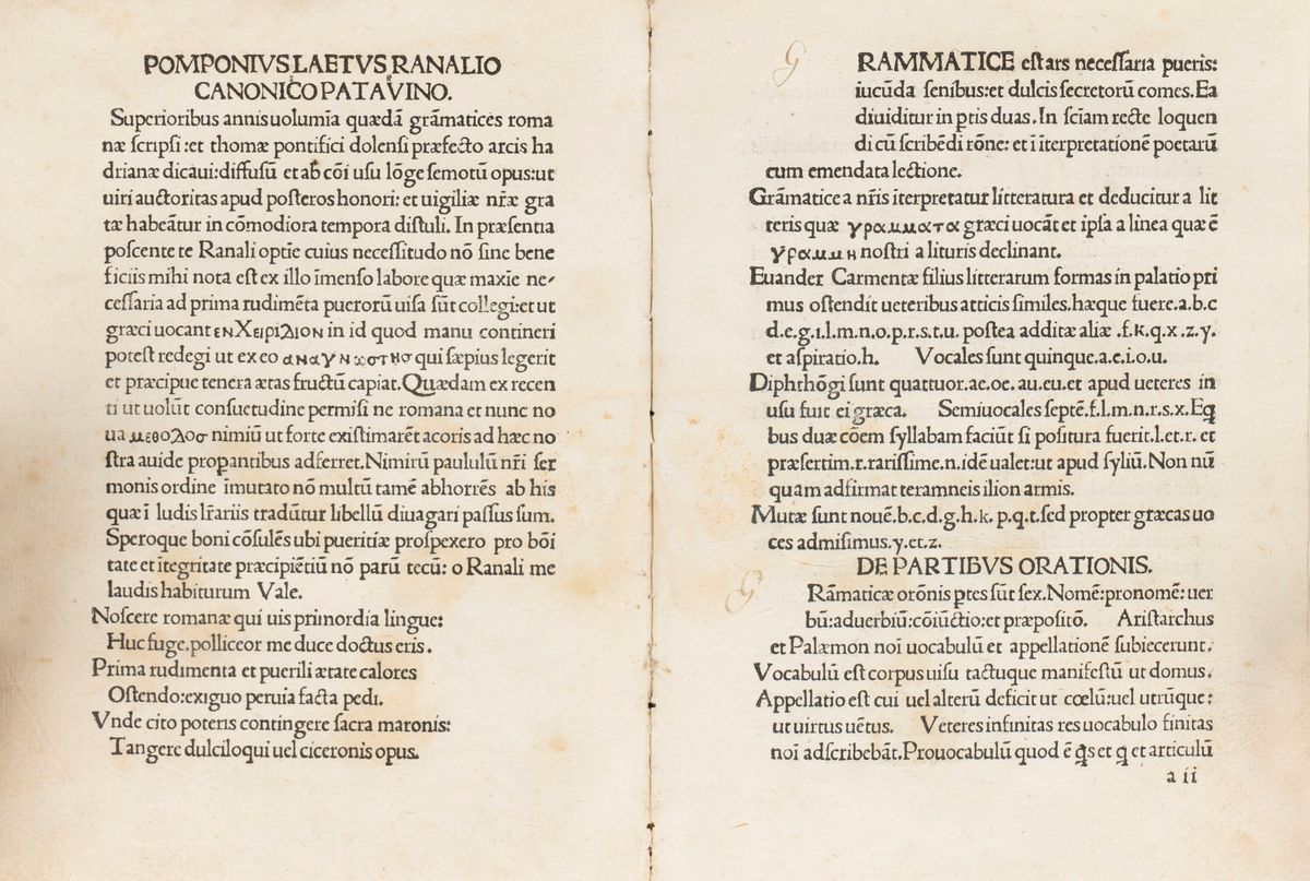 Professore dello Studium Urbis per quasi trent’anni, amante dell’antichità nel senso puro, vero e tenace inteso dall’Umanesimo, l’unica "colpa" di Pomponio è stata forse quella di vivere umilmente il ruolo a cui la sua indole lo aveva portato. Nessuna scoperta eclatante, nessuna opera destinata ad occupare intere pagine di manuali. Una vita semplice, con pochi viaggi volti a sedare la sete di cultura, un lavoro amato e fatto proprio conducendo l’esistenza tra le mura di casa e dell’Università. Poi certo, c’era l’Accademia Romana, quell’alta espressione della cultura umanistica che proprio lui aveva fortemente voluto. Un’umile casa sul Quirinale (la sua) bastava a far rinascere la grande antichità, riecheggiata nelle orazioni, negli spettacoli che l’honestissima frequentia della gioventù romana metteva in scena in quel luogo “sacro”. L’Accademia che innalzava Pomponio a «unico oracolo delle lettere», l’Accademia che attirò i sospetti del sommo Pontefice Paolo II. Ma Pomponio più che un umanista classico era soprattutto un insegnante. Amava i ragazzi, spendeva a sostegno loro tutta la sua cultura e immensa preparazione. Prova ne è la presente grammatica, dedicata al canonico patavino Ranalius. A cavallo tra il secondo (1480-84) e il terzo periodo della sua produzione, troviamo il famoso commento al De lingua Latina di Varrone (libri V-VII), frutto del corso tenuto nel 1484-'85 allo Studio, tramandato nei dictata originali degli allievi conservati nei codici Vat. lat. 3415 ed Escurialense g.III.27. Altri testimoni (sette) di corsi varroniani tenuti da Pomponio in anni accademici diversi sono accuratamente descritti da Virginia Brown (1980, pp. 467-474; Accame, 2008, pp. 124-146). L’opera di Varrone doveva attirare Pomponio, oltre che per i problemi connessi alla storia della lingua latina, anche per gli svariati interessi antiquari che prendevano in considerazione gli istituti, la società e la vita in genere del mondo romano. E forse la presente grammatica si colloca proprio a ridosso di tali corsi, pensata per essere destinata al pubblico di studenti - non solo romani - dei suoi corsi universitari.