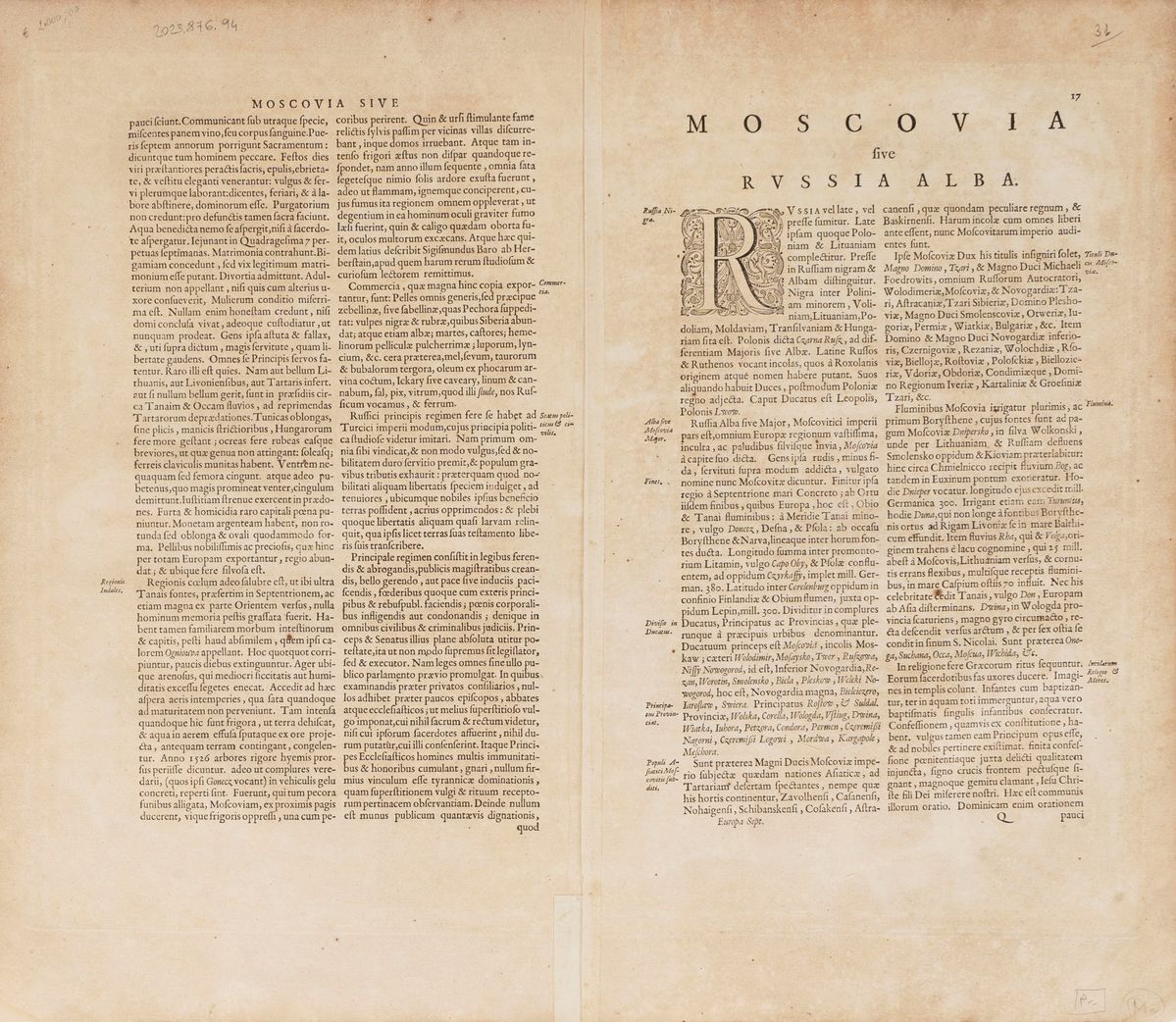 Ristampa di Blaeu della rara e influente mappa della Russia di Hessel Gerritsz. Questa bella mappa fu compilata sulla base di manoscritti riportati dalla Russia da Isaac Massa al quale si dice sia attribuita la grande pianta di Mosca inserita in un riquadro. La mappa fu pubblicata per la prima volta da Hessel Gerritsz nel 1613. Blaeu la pubblicò dopo aver acquisito la tavola dopo la morte di Gerritsz nel 1632. Questa superba mappa ha molte caratteristiche interessanti e decorative, tra cui; una pianta dettagliata di Mosca, completa di una legenda di diciassette richiami di importanti edifici pubblici e chiese; una rosa dei venti e un galeone nel Mar Caspio; una piccola veduta del porto settentrionale di Arcangelo; tre uomini russi in abiti locali e un magnifico titolo e dedica di una mappa. (31)