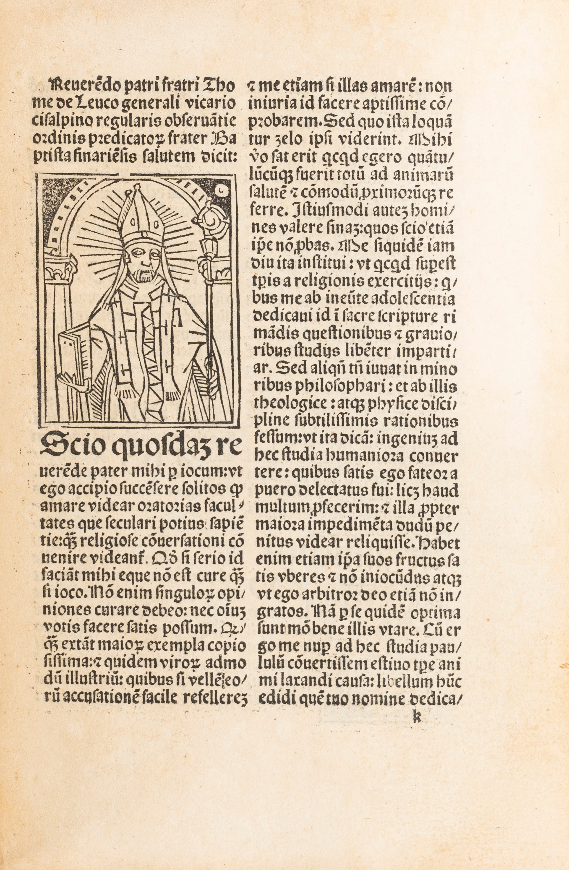 In hoc volumine continentur infrascripti tractatus. Primo deuotissimus trialogus beati Antonini archiepiscopi florentini ordinis predicatorum super euangelio de duobus discipulis euntibus in emaus. Secundo pulcherrimus trialogus de contemptu mundi fratris baptiste de finaria episcopi vintimiliensis ordinis eiusdem., 1495