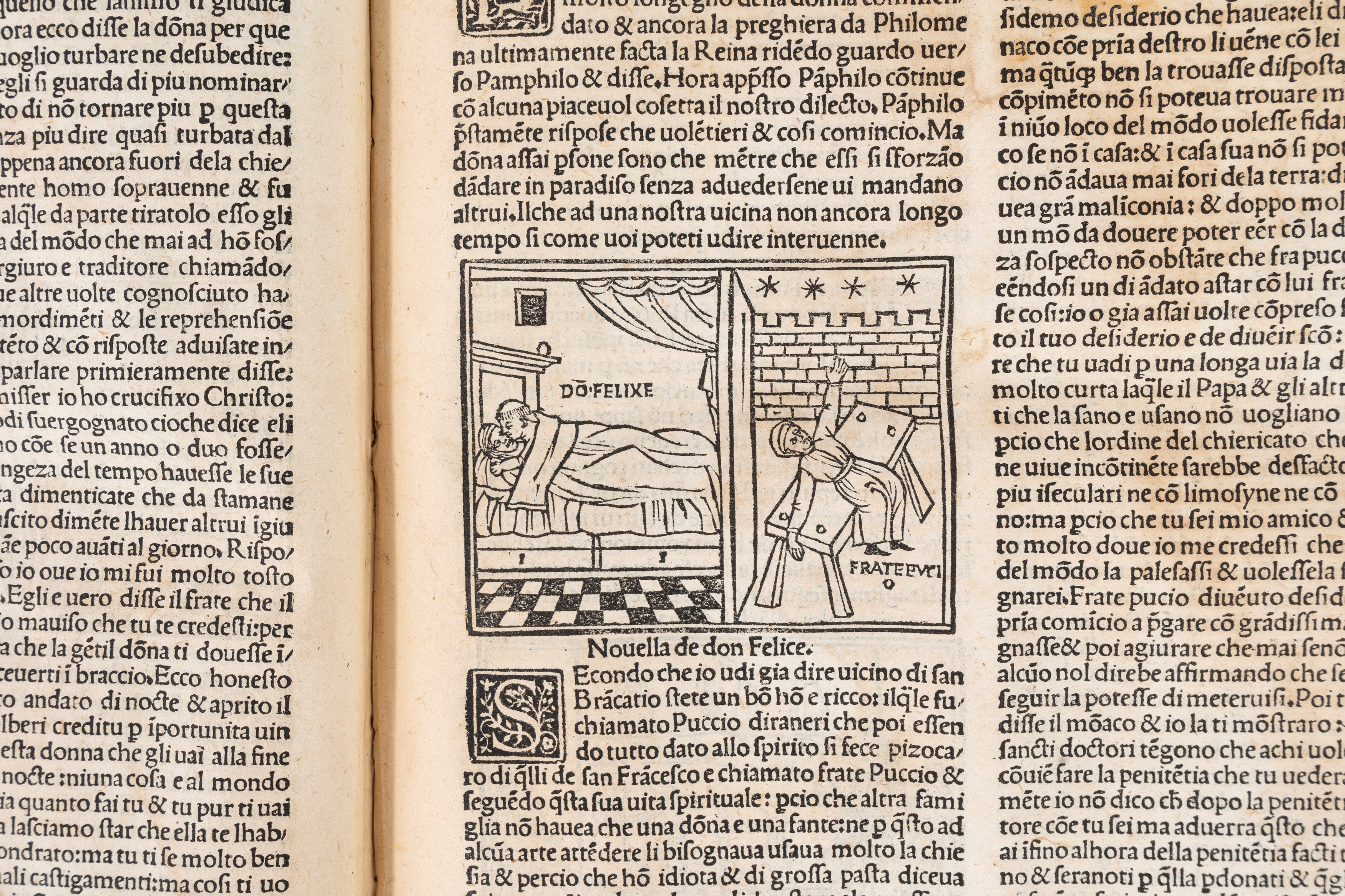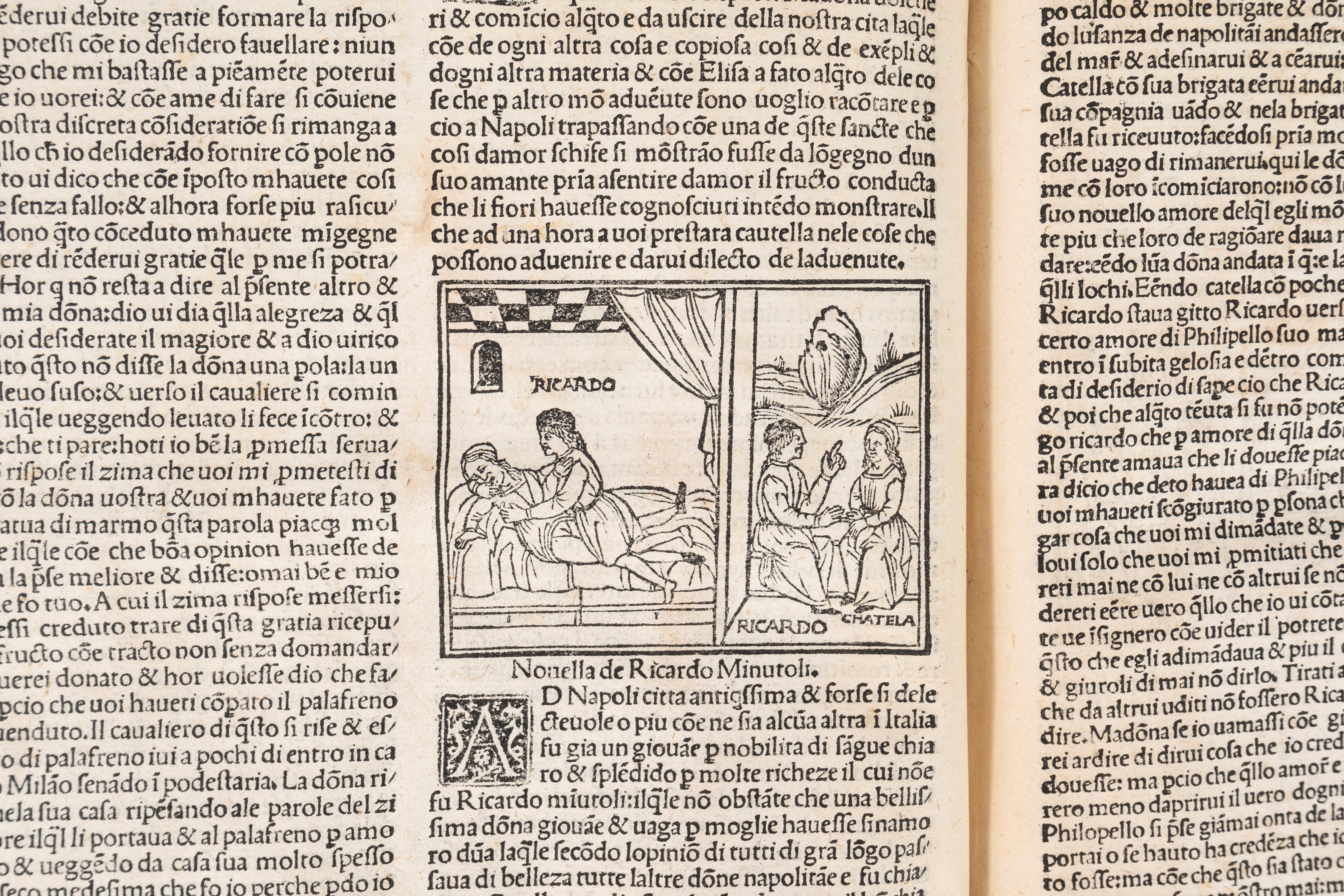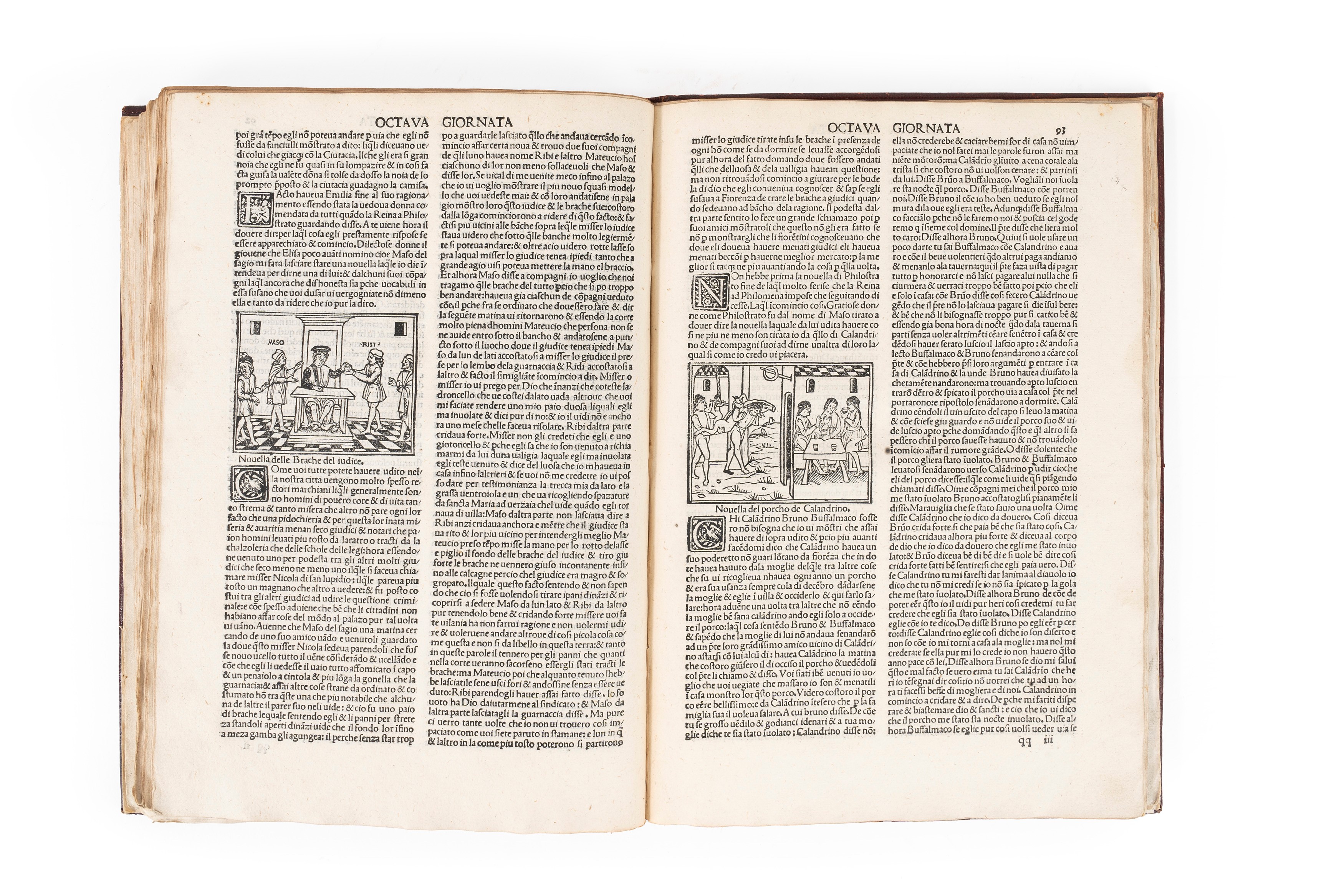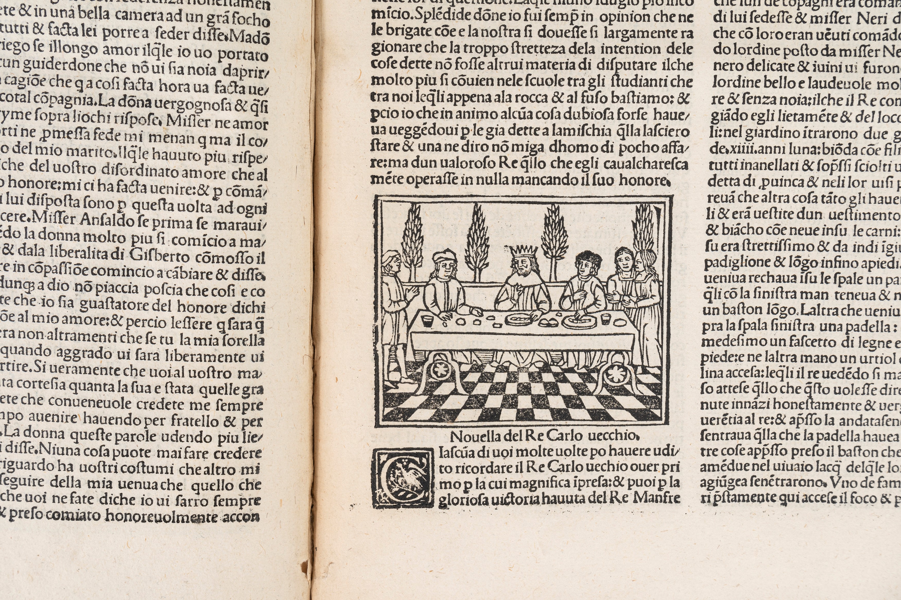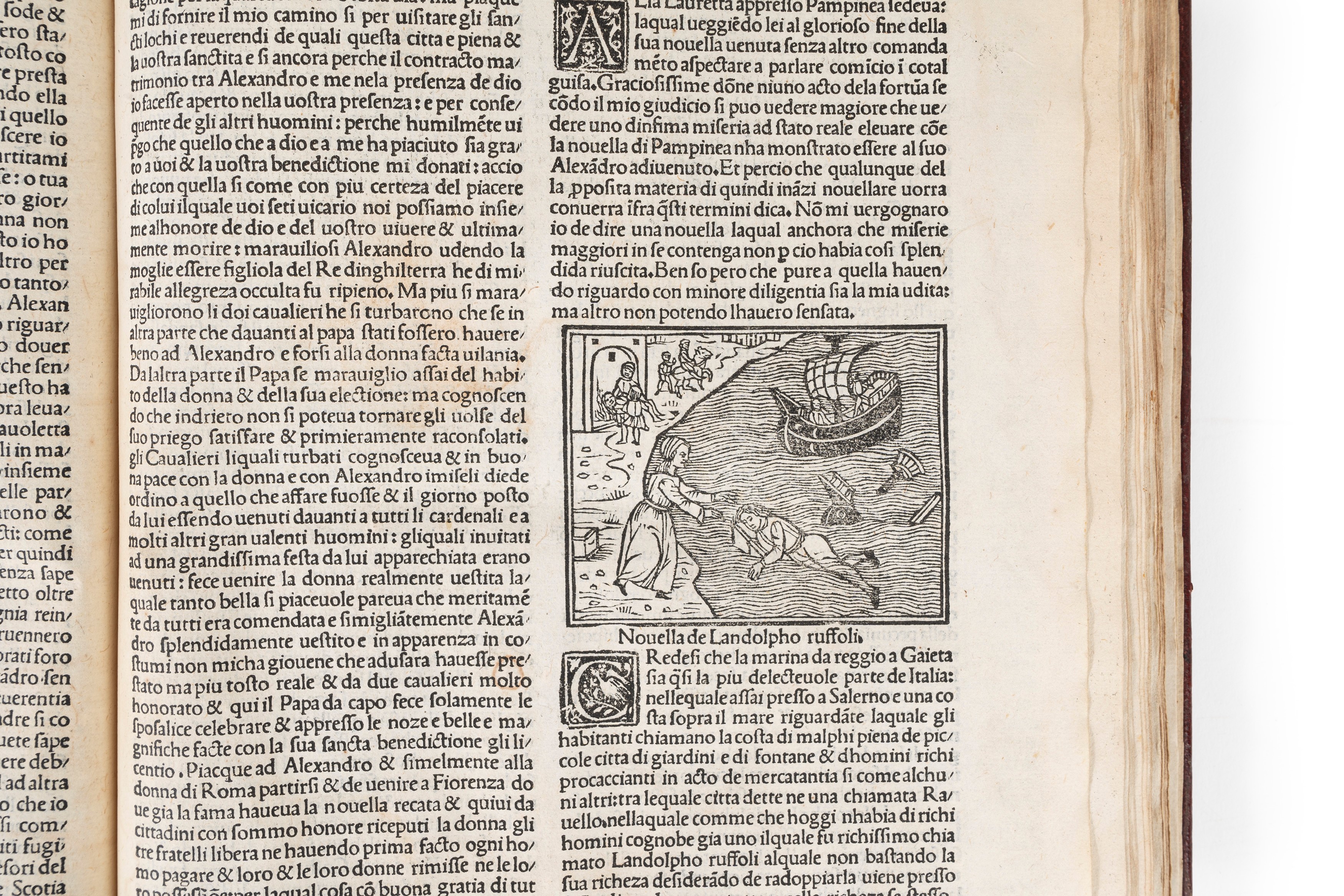 Venezia, Bartolomeo Zanni, 5 agosto 1510. In 2°, 295 x 210 mm. 125 carte numerate, testo su 2 colonne in carattere gotico, sopra il titolo elegante e celebre vignetta a due comparti copia inversa di quella che orna la IV Giornata nell'edizione del 20 giugno 1492, questa stessa incisione viene poi ripetuta in tutta l'edizione ad apertura di ciascuna Giornata, nel testo 97 vignette di cui molte ripetute ma la maggior parte originali, in alcune sono presenti monogrammi b, F, i e sono prese in prestito dall'edizione del Tito Livio del 1493 e da altre edizioni, piccoli iniziali ornate su fondo nero, frontespizio e prime 4 carte fortemente danneggiate e restaurate, le prime 40 carta presentano aloni di umidità e diversi restauri con perdite risarcite anche a penna, il resto della copia si presenta perfetta e dai grandi margini, legatura moderna in piena pelle amaranto con titolo in oro su tassello verde. Cartiglio all'interno del contropiatto, con indicazioni bibliografiche, di mano ottocentesca; duplicato del Museo Britannico [British Library] come indicato dal timbro al colphon: "Museum Britannicum Duplicate for sale 1769."
