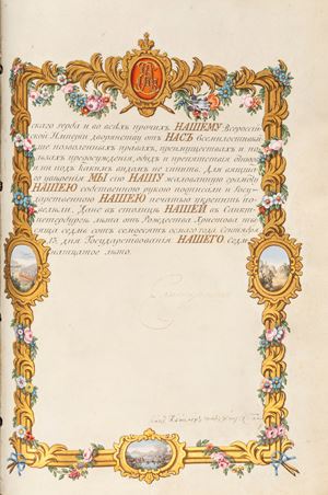 Documento pergamenaceo composto da 5 fogli per un totale di 10 pagine, 420 x 295 mm. Il testo è inquadrato in cornice fitomorfa, intersecata da cammei: quello in alto al centro reca le iniziali della zarina, EA (Ekaterina Alekseevna), tutti gli altri, invece, immagini di battaglie (si riferiscono probabilmente alle battaglie nelle quali si erano distinti i fratelli Zimmerman, che prestavano servizio nell’esercito russo sotto Caterina II), alla prima carta campeggia il ritratto di Caterina entro ovale che sovrasta San Giorgio e il drago, il tutto sopra l'aquila bicipite nera simbolo della Russia, al recto del quarto foglio lo stemma araldico concesso alla famiglia Zimmerman, firmato all'ultima carta da Caterina II (Ekaterina) e sottoscritto dal vice cancelliere; contiene anche la descrizione dello stemma: uno scudo intagliato in sei parti, tre dorate e tre azzurre, coronato da un elmo con sopra una testa di leopardo dal quale emergono tre piume di struzzo. Fogli di seta verde a proteggere ogni singola pagina, legatura ricoperta da fili di seta, molto rovinata, grande sigillo in ceralacca di 120 mm di diametro perfettamente conservato entro bossolo metallico. Il tutto raccolto in pregevole cofanetto di pelle verde.
