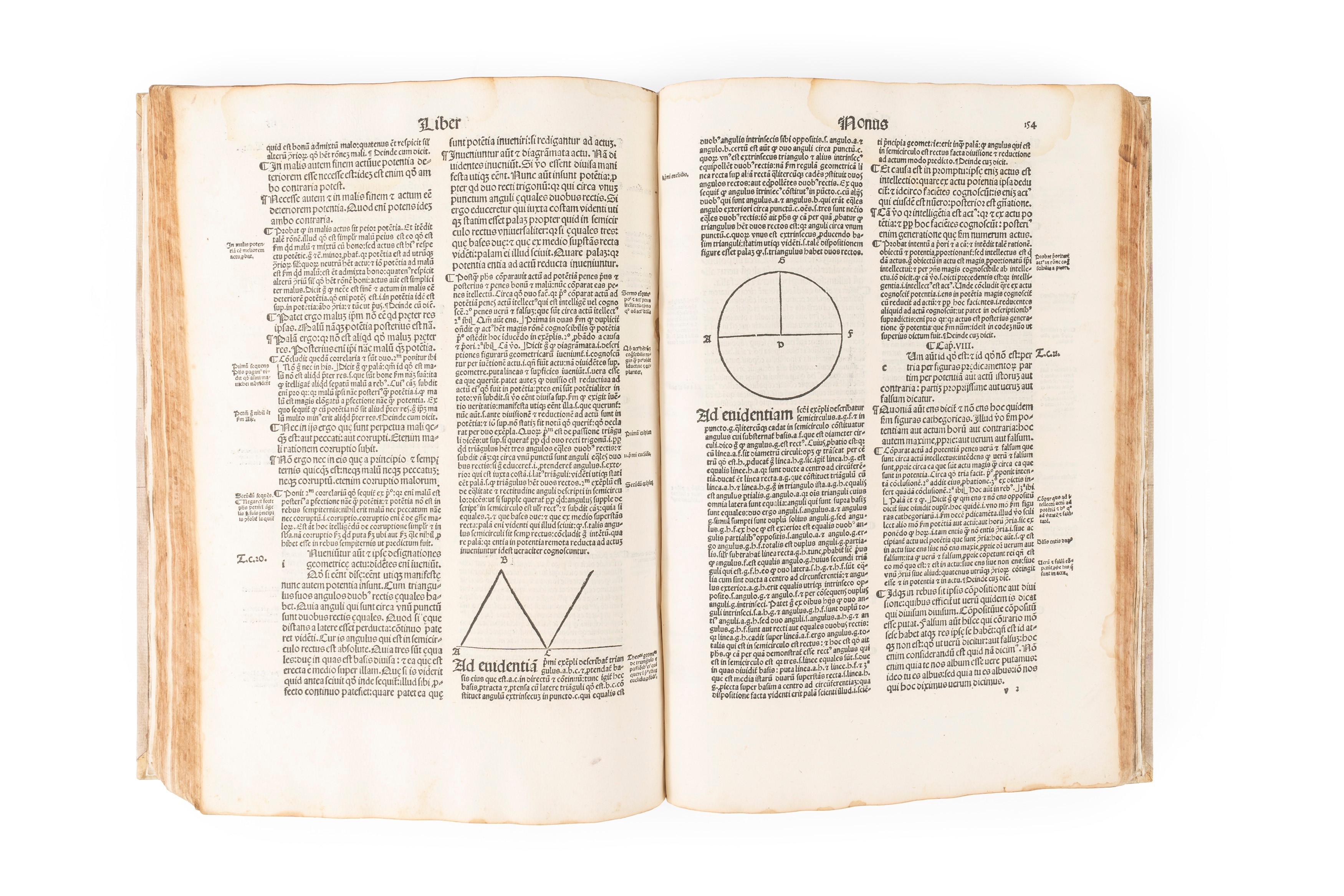 Venezia, Simonem de Luere iussu domini Andreae Torresani de Asula, 6 Maij 1503. In 2°. 2 parti in un volume. Carattere gotico, testo su due colonne, alcune figure incise in legno nel testo, numerose glosse di mano antica, restauri (in particolare alle prime e ultime carte), qualche lieve gora d'acqua e fioritura, mancante l'ultima carta bianca, legatura di epoca successiva in mezza pergamena, titolo entro tassello cartaceo, lievi difetti.