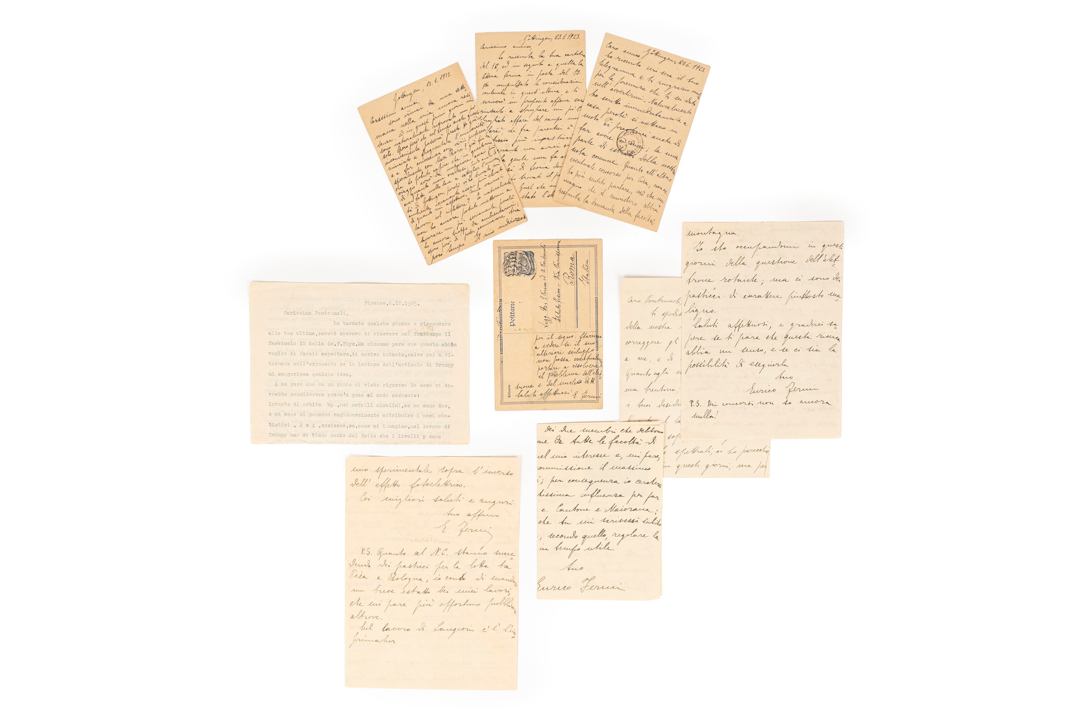 “Carissimi amici sono ormai da una settimana nella mia nuova residenza, ed in questi primi giorni mi sono naturalmente ritrovato un po’ solo. Spero però che col tempo anche questo inconveniente passerà presto. Ho già cominciato a frequentare l’università e a far conoscenza coi vari professori, specialmente con Max Born. E già fina da ora ho potuto capire che in queso mio viaggio avrò da imparare assai più di quanto non credessi. (…) Come vanno i lavori col riflettore? (…) Saluti affettuosi a voi, con preghiera di estenderli a tutti all'Istituto, da questo elettrone ionizzato che un tempo apparteneva ad un atomo neutro di Litio.”Gottingen, 14.1.1923 Pontremoli:Spedisce le bozze di un suo intervento con preghiera di correggere gli errori e di stampare gli estratti, chiedendogliene una trentina. Lo aggiorna sul lavoro “sopra l’effetto della pressione sopra l’allargamento delle righe spettrali”, sui dubbi che ha, “senza contare naturalmente il sempre più che misterioso mistero del campo molecolare così grande”.Gottingen, 23.1.1923 a Pontremoli:Parla di nuovo dell’ “imbrogliato affare del campo molecolare”. “Qui la gente non fa altro che occuparsi di teoria dei quanti, così che ho trovato il posto adatto per me. Quel che mi ha molto colpito è stato l’elevato grado della cultura media degli studenti di Scienze. Speriamo che col tempo lo si possa un po’ migliorare anche in Italia! (…)”Gottingen, 16.5.1923 a Pontremoli:“Carissimo amico, ho letto sopra l’ultimo fascicolo dei Lincei qui arrivato le vostre note, e me ne congratulo. In questi giorni io ho mandato al N.C. non una ma tre note una meno priva di interesse dell’altre. E così vedrò di sporcare un po’ di carta da presentare per il concorso che credo sarà bandito prossimamente. In questi ultimi giorni è uscita una memoria di Einstein sopra una teoria “generalissima” della relatività; interessante specialmente perché è la prima teoria nella quale l’elettricità positiva e quella negativa non differiscono soltanto per il segno. Staremo a vedere se il suo ulteriore sviluppo non possa eventualmente portare a risolvere il problema dell’elettrone e del nucleo di H. Saluti affettuosi. E. Fermi”Gottingen, 22.6.1923 a Pontremoli:Gli comunica probabilmente - via telegramma - che è stato indetto un concorso per un posto universitario a Firenze-Roma (?).Firenze, 6.12.1925 a Pontremoli, lettera dattiloscritta firmata:Entra nel merito di questioni fisiche serrate, relative a orbite dei metalli alcalini etc. Alla fine si parla di concorsi universitari a Roma, Cagliari e Firenze, dove si trova.Firenze, 14.2.1926 lettera a Pontremoli:Si parla di concorsi universitari, di manovre baronali e di delusioni. “Io ho fatto un lavoro teorico sopra l’apparire di righe proibite in un campo magnetico intenso, e ne sto facendo, insieme con Carrara, uno sperimentale sopra l’inverso dell’effetto fotoelettrico. (…)”Firenze, 11.5.1926, lettera a Pontremoli:“Caro Pontremoli, ho pensato alla questione sopra la possibilità di fare qualche esperienza al Monte Rosa. Idee veramente sensate non me ne sono venute; una ricerca che sarebbe bella ma non è, secondo me, di esecuzione possibile, sarebbe uno studio della radiazione corpuscolare secondaria. Una ricerca invece, di esecuzione relativamente facile, ma non particolarmente significativa, sarebbe la seguente. Studiare la velocità di scarica di uno spettroscopio situato in un crepaccio di ghiacciaio, nella sua dipendenza dalla inclinazione del ghiacciaio; se si riuscisse a mettere in evidenza una tale dipendenza, essa potrebbe servire a determinare elementi della direzione da cui la radiazione proviene. (…)”Firenze, 9.6.1926 – Lettera a Pontremoli:Lettera personale in cui comunica che è stato bandito sulla Gazzetta Ufficiale il concorso di Fisica Teorica per Roma e gli domanda il suo parere sull'opportunità di “avere nella commissione il massimo possibile di fisici”. Propone i nomi di Cantone e Maiorana.
