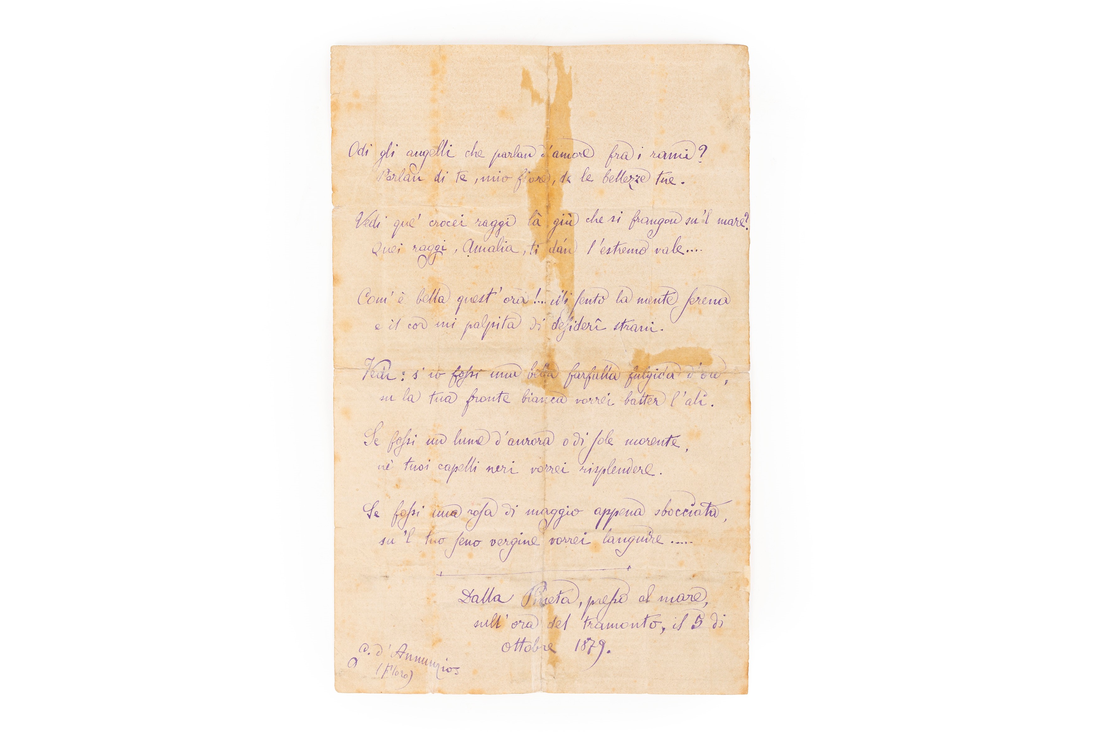 Poesia autografa e firmata su un foglio in 8° recto/verso, 208 x 133 mm. Inchiostro viola, tracce di piegature del foglio e aloni, due versi cancellati. Sottoscritto in fine: "Dalla Pineta, presso al mare, nell'ora del tramonto, il 5 di ottobre 1879.", a sinistra nell'angolo inferiore, "G. d'Annunzio (Floro)".