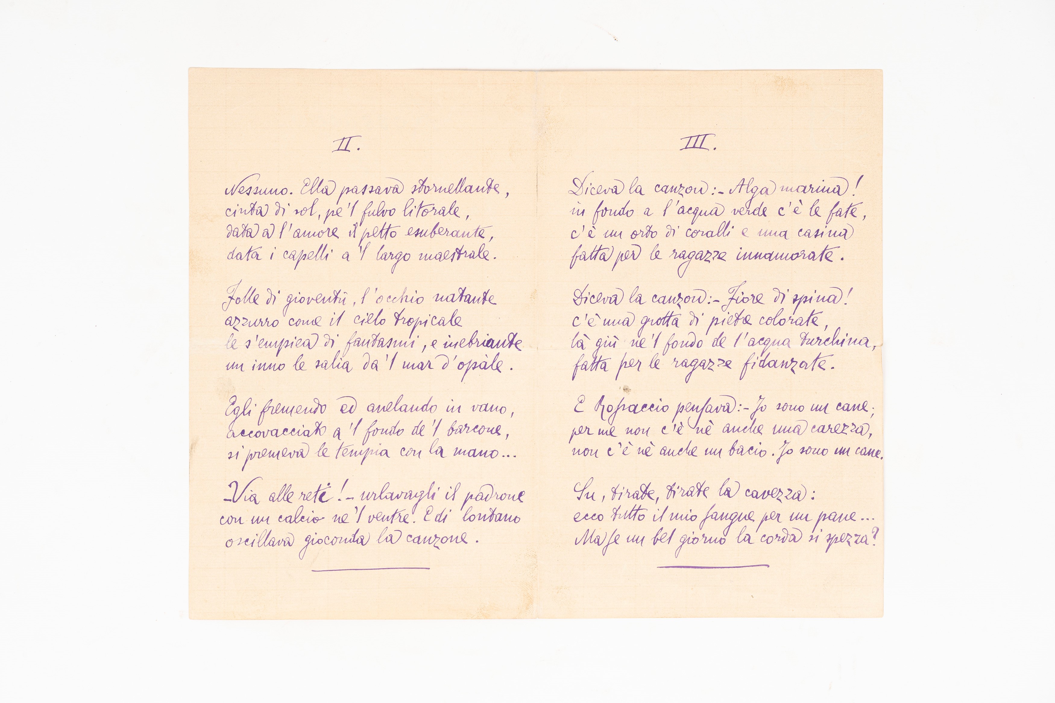 Poesia autografa firmata in 8°, 4 pagine, 213 x 134 mm., inchiostro viola, in quartine.