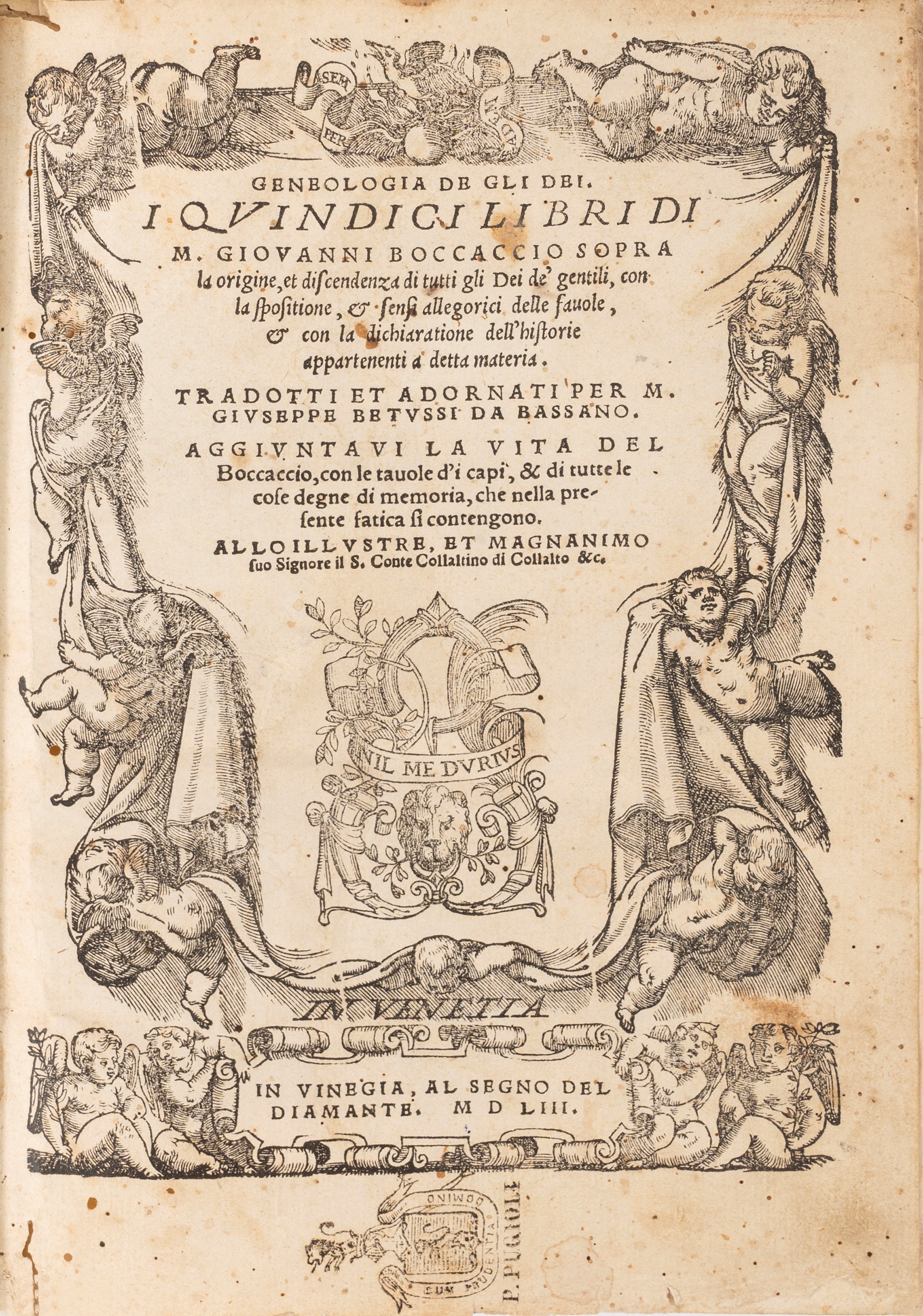 Venezia, appresso Pietro Maria Bertano, 1638. In 8°. Legatura ottocentesca in mezza pergamena con piatti in cartone, timbro di appartenenza al frontespizio. Tracce di tarlo che interessano tutta l'opera. Corto di margini. § Genealogia de gli dei. Venezia, al segno del diamante, 1553. In 8°. Legatura ottocentesca in mezza pergamena con tassello in pelle. Timbro di appartenenza al frontespizio e al recto della carta a2. Estese tracce di tarlo che interessano tutta l'opera.