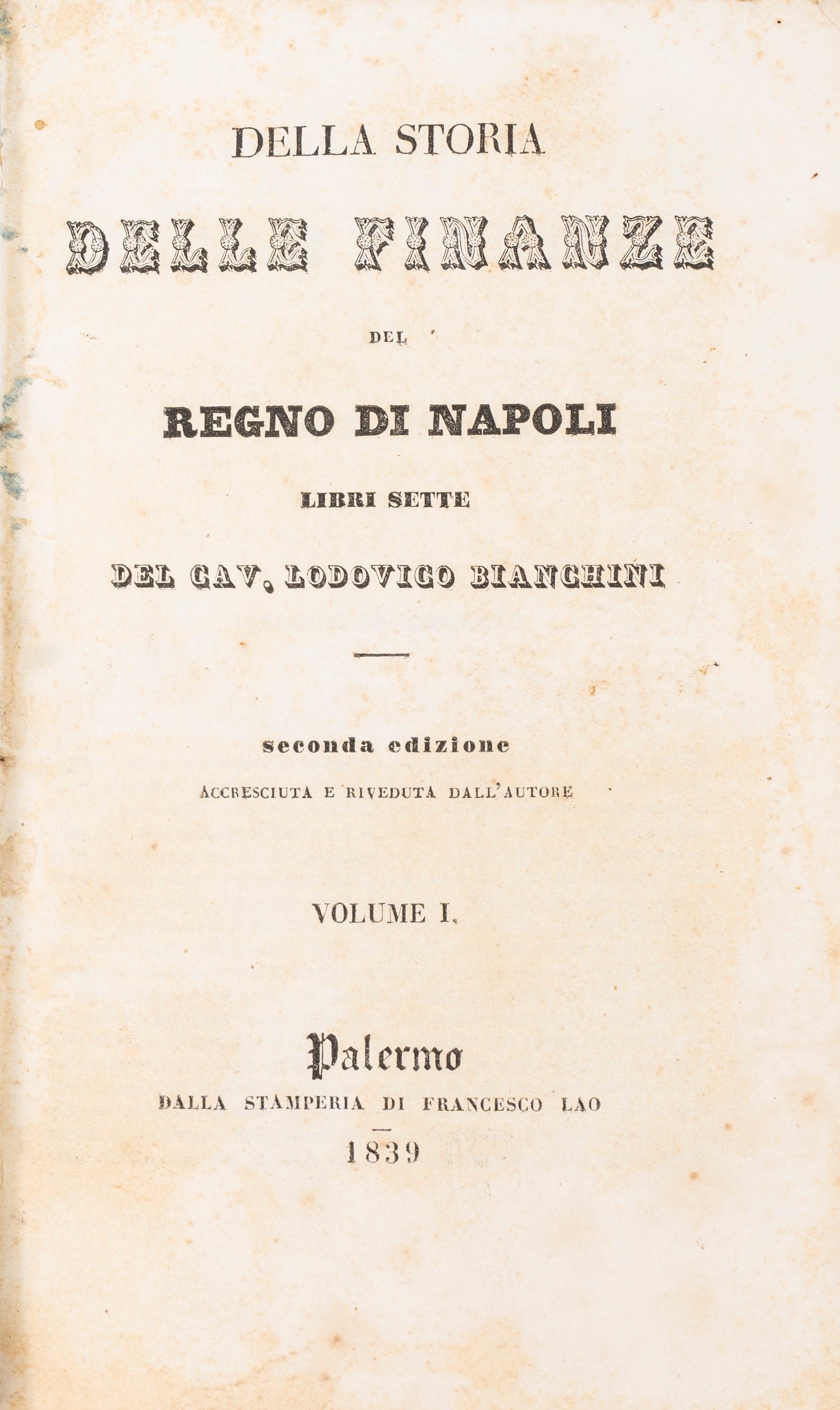 Palermo, dalla Stamperia di Francesco Lao, 1839. In 8°, tre parti in un volume, pp. complessive 645. Testo su due colonne. Legatura coeva in mezza pelle, titolo e fregi in oro al corso, mancanze ai piatti. Arrossature sparse.