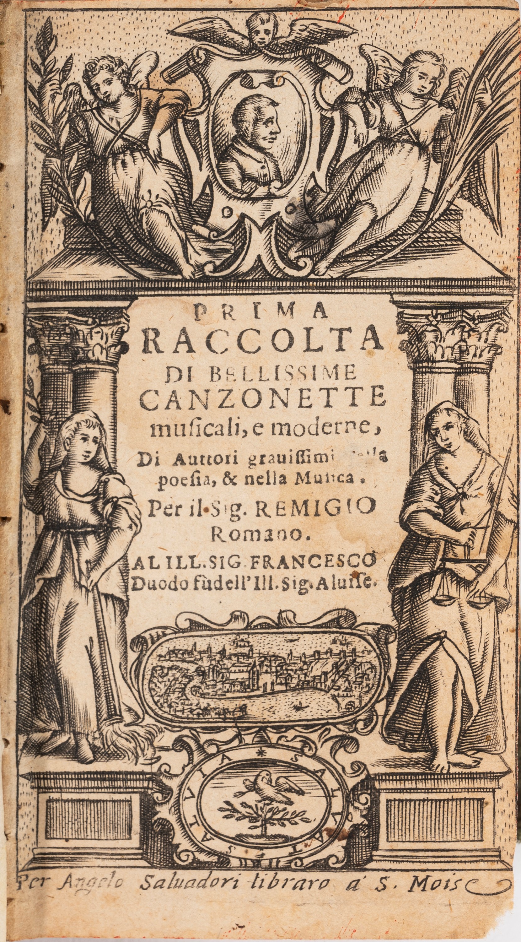 [Venezia], per Angelo Saluadori libraro a S. Moise (In Vicenza, appresso Angelo Saluadori libraro in Venezia a S. Moise, 1622). In 12°, 130 x 80 mm. Marca al frontespizio della Colomba ferita su un ramoscello di salvia, motto: Salvia salvat, alcune canzoni sono accompagnate dall'intavolatura per chitarra, arrossature. Legato con. Seconda raccolta di canzonette musicali; bellissime per cantare, & suonare, sopra aria (!) moderne . Vicenza, per Angelo Salvadori, 1620. Al frontespizio marca con Una colomba, con una ferita da cui sgorga un getto di sangue, posata su un albero di ulivo; paesaggio sullo sfondo, in una cornice ovale, motto: Salvia salvat, arrossature. Legato con. Terza raccolta di bellissime canzoni alla romanesca. Per suonare, e cantare nella chitarra alla Spagnuola, con la sua intavolatura. Vicenza, per Angelo Saluadori libraro ; in Venetia : a San Moise, 1622. Vignetta xilografica sul frontespizio, arrossature. Legato con. Nuova raccolta di bellissime Canzonette musicali e moderne, di auttori gravissimi nella poesia, et nella musica. Venezia, A. Salvadori, 1625. Marca tipografica al frontespizio, strappo con perdita di alcune lettere all'angolo inferiore della seconda carta, arrossature. Legatura in mezza pelle verde del sec.XVIII con decori in oro al dorso e titolo a lettere dorate su tassello rosso, tagli a spruzzo rossi.