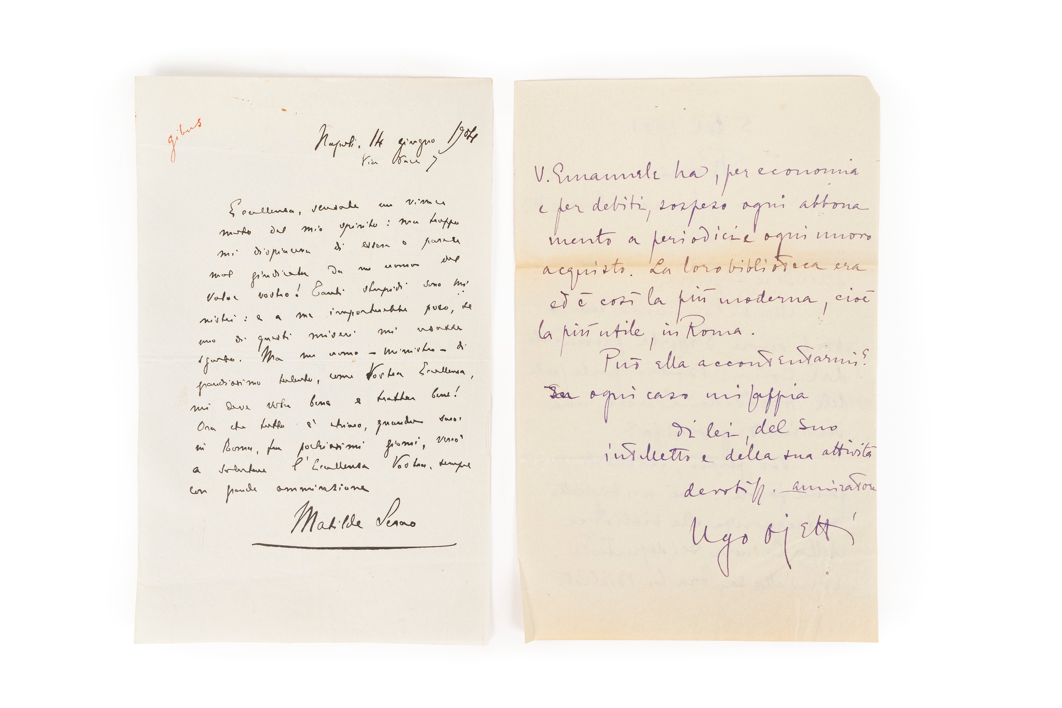 Bella lettera di una pagina in 8°, 212 x 132 mm., datata Napoli 14 giugno 1904 e indirizzata a Luigi Luzzatti; insieme nel lotto una letterina di Ugo Ojetti del dicembre del 1900, dove chiede l'accesso alla Biblioteca della Camera.