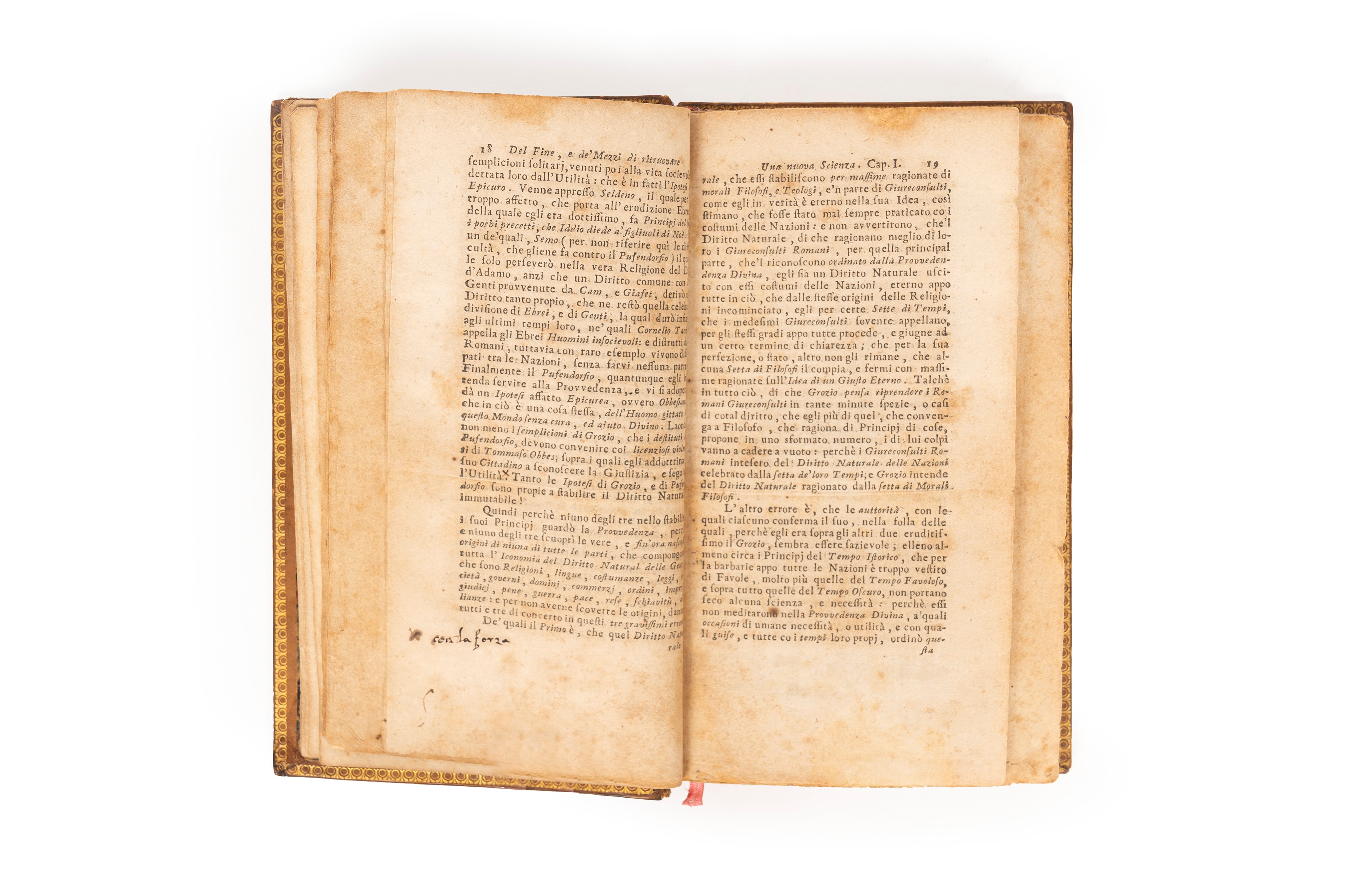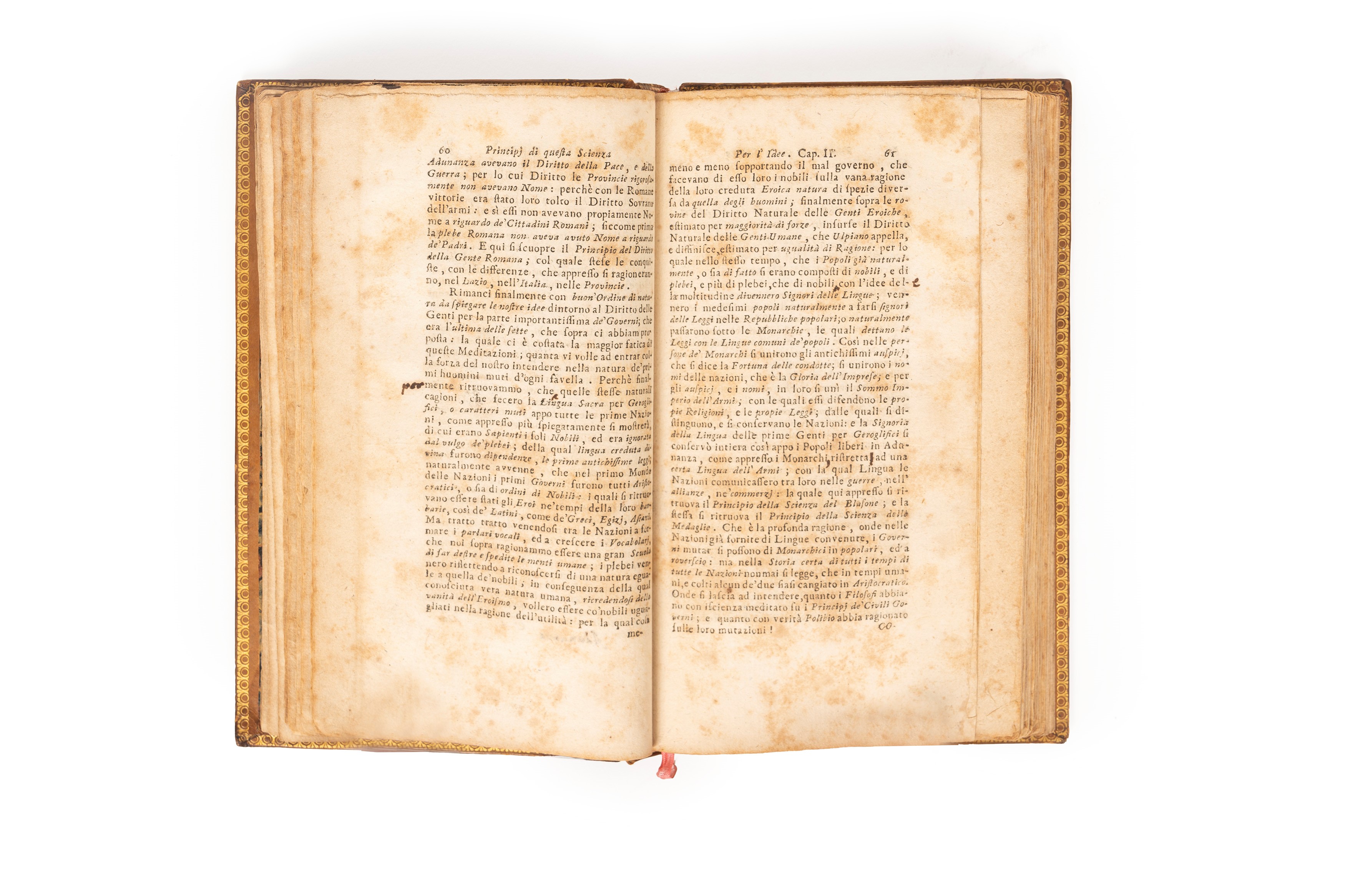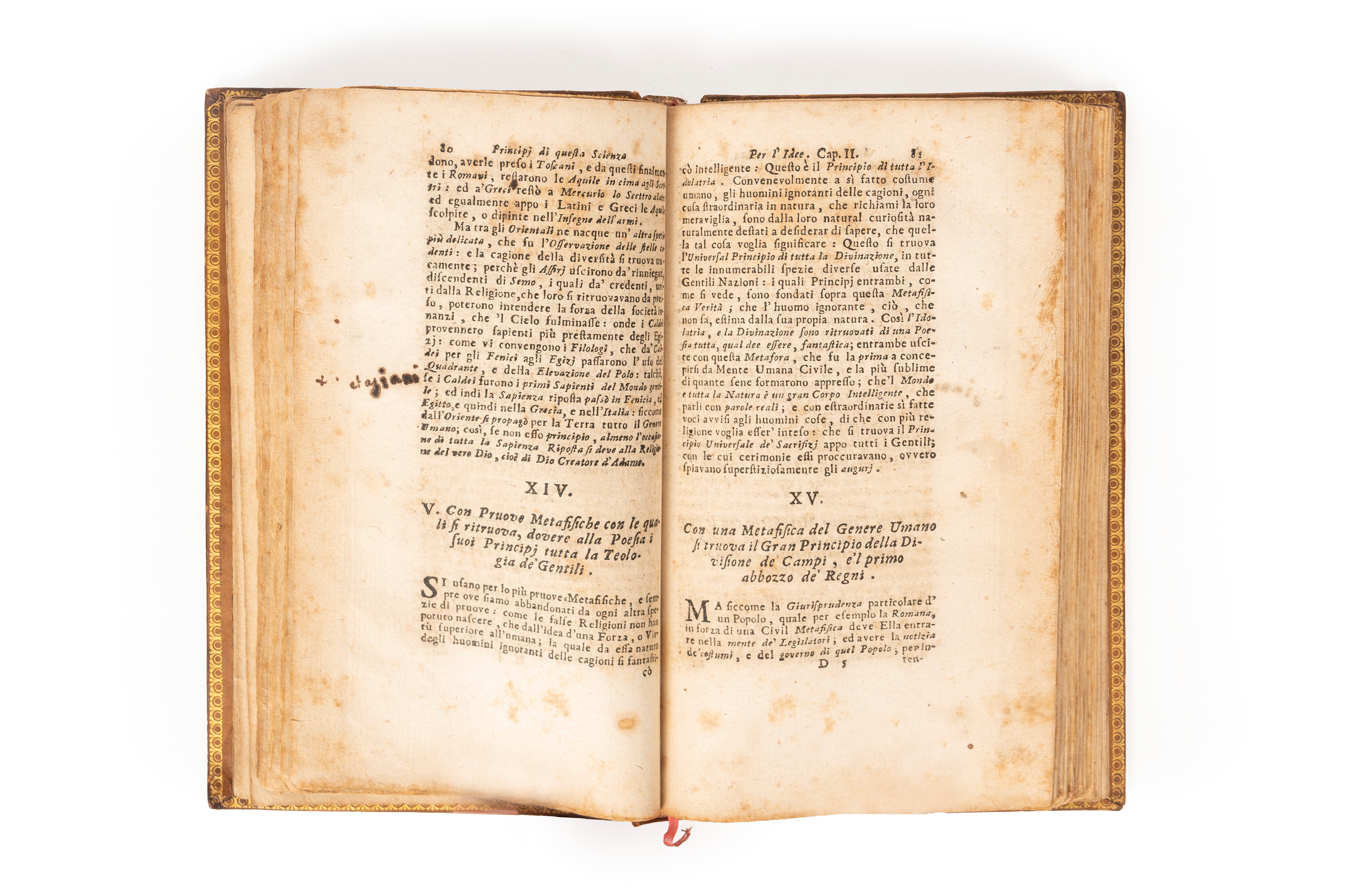 Napoli, Felice Mosca, 1725. In 12°, 161 x 95 mm. Fregio calcografico al frontespizio, capilettera e titoli correnti, ESEMPLARE IN BARBE, consuete bruniture della carta, legatura coeva in pieno vitello biondo con impressioni a secco ai piatti, cornice dorata ad unico filetto, al dorso 5 nervi a separare sei comparti con decorazioni in oro, titolo su tassello in pelle nera, mancanze alla cuffia superiore e difetti a quella inferiore e alle cerniere. Esemplare Marzorati, n.915 del suo catalogo. ECCEZIONALE COPIA RECANTE CORREZIONI AUTOGRAFE DI VICO alle pp.35, 46, 59, 60, 61, 108, 142, 173, 249, 267, cartouche di 3 righe incollato sul verso dell'ultima pagina del testo ad emendarlo. Altre pagine recano integrazioni e revisioni di testo probabilmente attribuibili a lettori vicini a Vico, essendo risaputo l'invio che Vico stesso farà di diversi esemplari (circa 30) della presente edizione ad amici a lui vicini.
