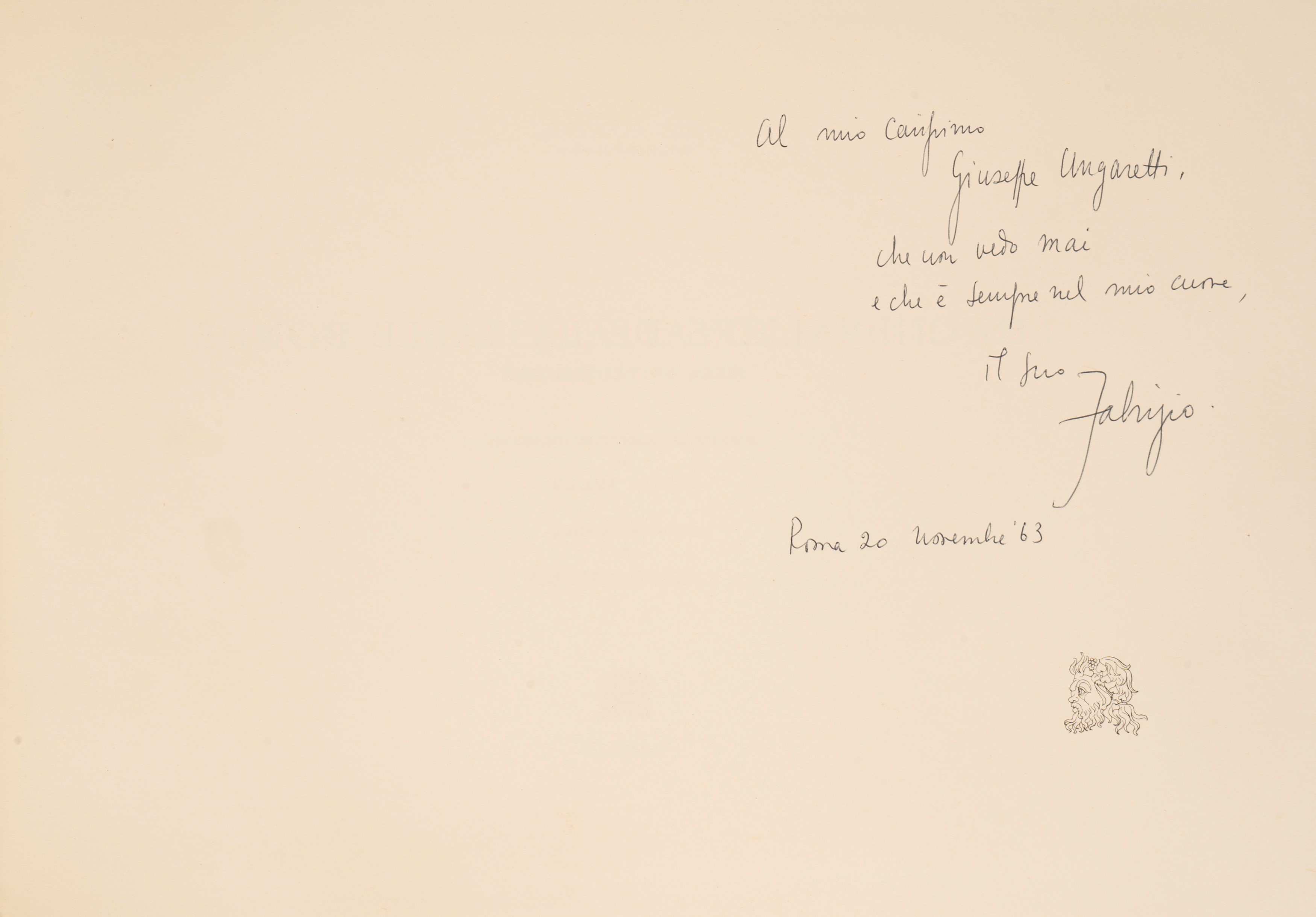 Tiratura limitata di 700 copie numerate, il nostro esemplare è il n. 484. Dedica di Fabrizio Clerici a Giuseppe Ungaretti datata 20 novembre 1963.