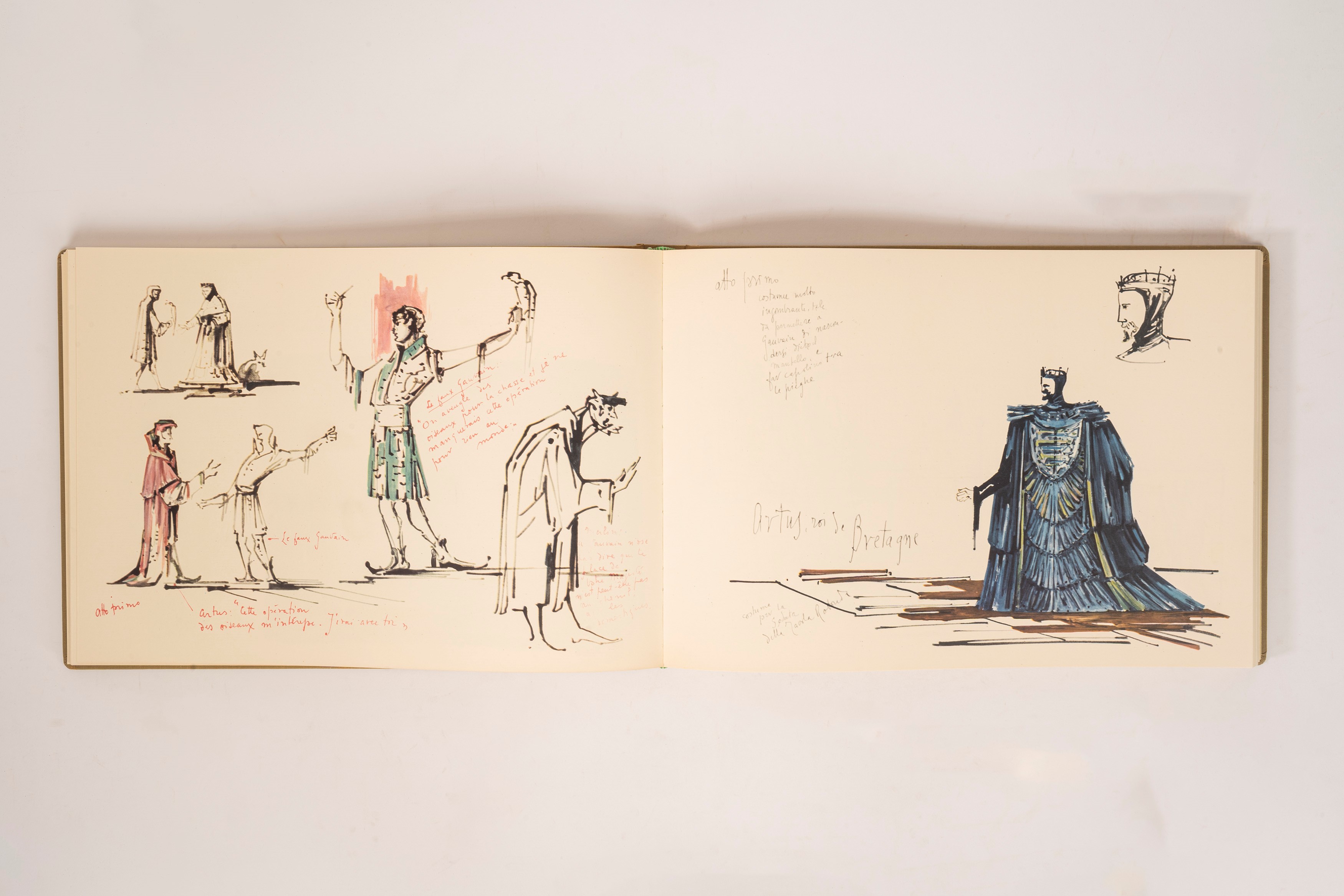 Roma, Canesi, 1963. Album in folio oblungo. BELLISSIMA E SENTITA DEDICA DI CLERICI A UNGARETTI. Con numerose illustrazioni a colori che che riproducono appunti, disegni e tempere di Fabrizio Clerici per le scene e i costumi di "Les Chevaliers de la Table Ronde" di Jean Cocteau, testo italiano e francese. Legatura in tutta tela con disegno in verde al piatto anteriore, custodia in cartonato con illustrazioni a colori, piccoli strappi al dorso della legatura.