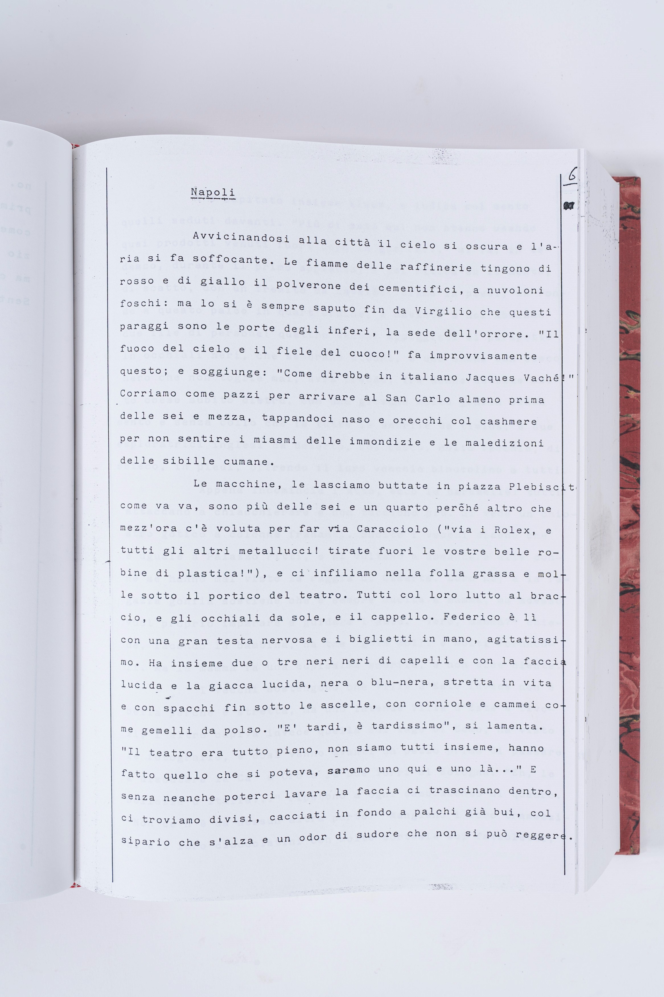Fotocopie del dattiloscritto (si vedono ai lati i bordi originari dei fogli) eseguito su macchina da scrivere elettrica (da qui varie tipologie di caratteri). 1993-2020, mm. 294x215; 4 v., v. 1: [3] - 451 c.; v. 2: 452-726; v. 3: 727-1282; v. 4: 1283-1770 c. Ciascun volume è rilegato con piatti in cartoncino rigido con decorazione in carta marmorizzata moderna, dorsi in tela color rosso, blu, grigio, verdolino recanti la scritta “Alberto Arbasino | Fratelli d’Italia”. Nella copia doppia del secondo volume troviamo interventi a penna e striscioline con testo dattiloscritto applicate alle seguenti carte: 455-461, 464, 466, 468, 472, 474, 475, 478, 481-485, 494, 497, 499, 511, 521, 523, 525, 527-528, 533, 536, 538, 543, 547, 548, 551, 556, 564, 570, 574, 577, 583, 586, 588, 589-598, 600-601, 603, 604, 605, 606, 609, 613, 621-622, 630, 644, 649-651, 657, 666, 669, 674, 692, 695, 700, 702, 703, 705, 711, 713, 715-719, 724.