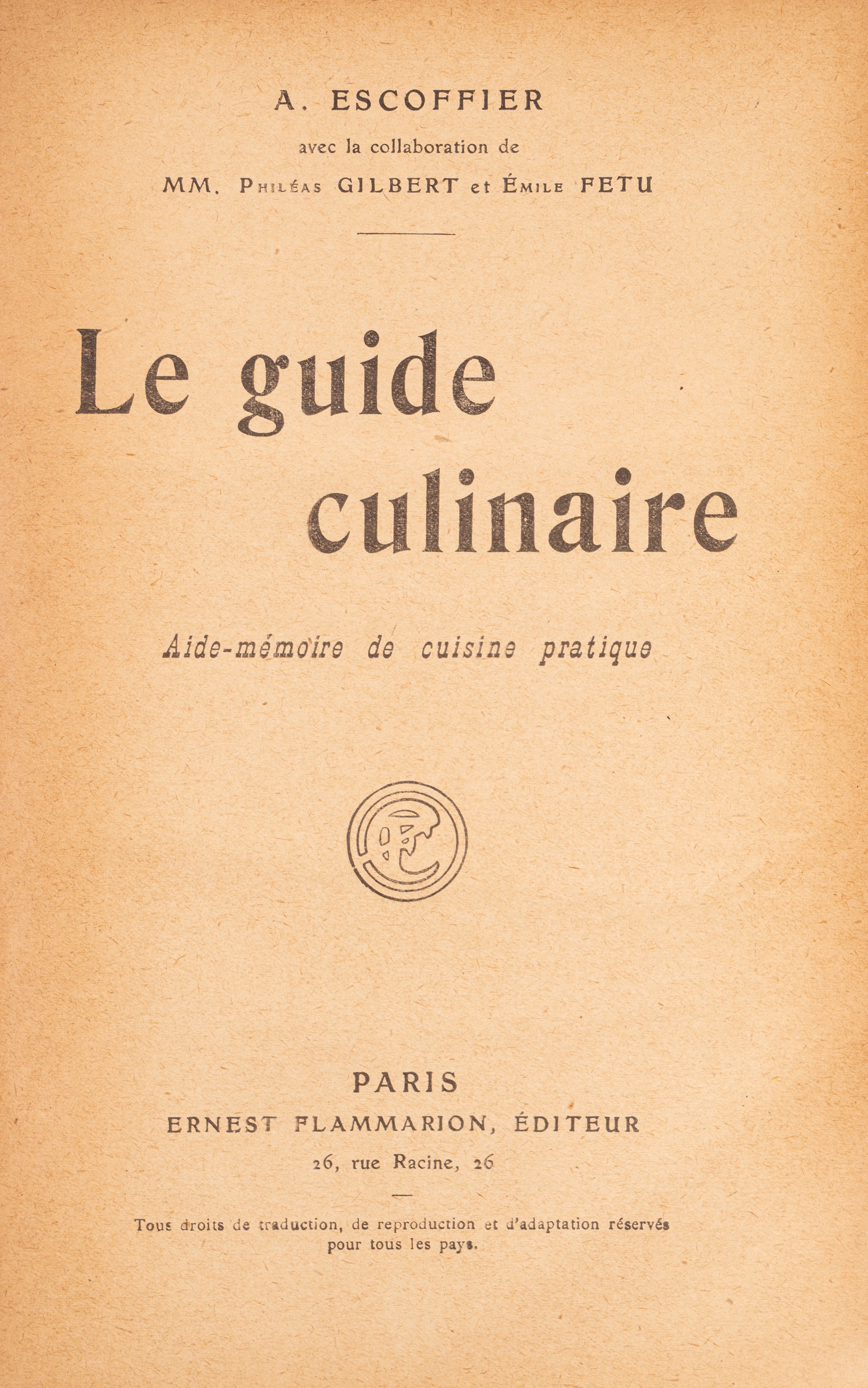 Le guide culinaire. Aide-mémoire de cuisine pratique. e Le livre des menus. Complément indispensable du Guide Culinaire. Avec la collaboration de M.N. Philéas Gilbert et Emile Fetu. Paris, Flammarion (al colophon E. Grevin Imprimerie de Lagny), 1926 e 1924.