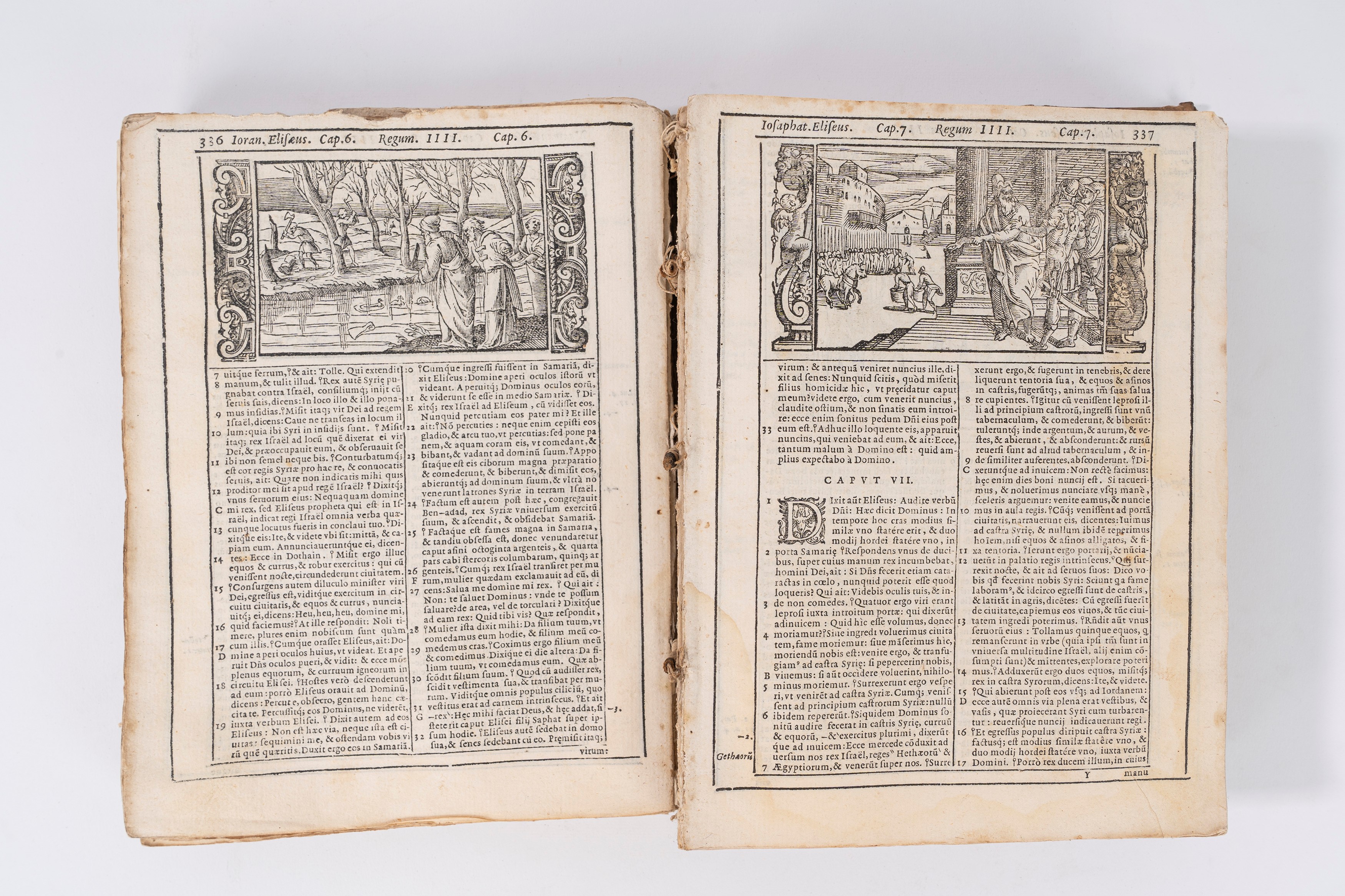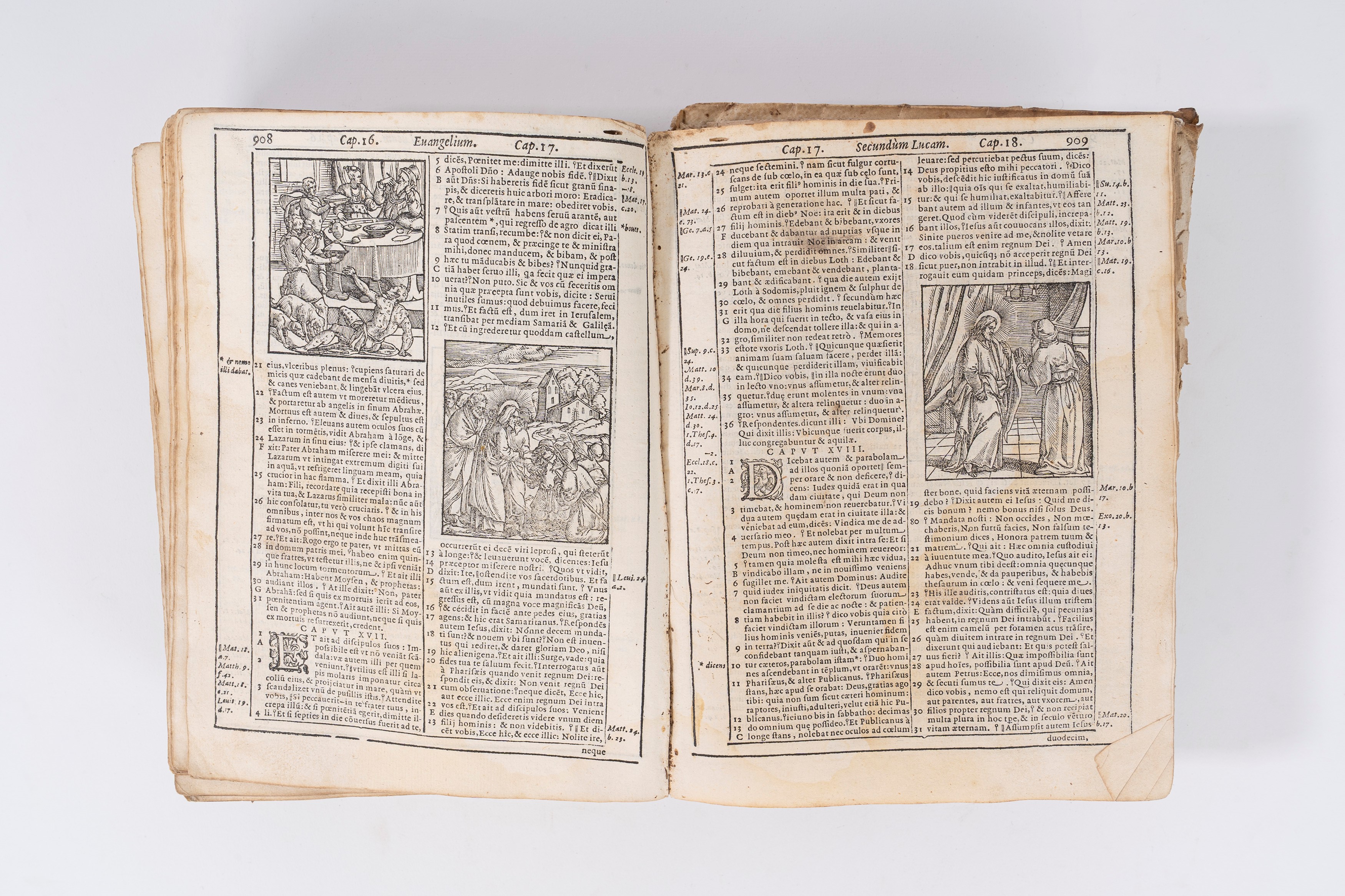 Bibbia del 1592, con 600 xilografie. Legatura in piena pergamena coeva, dorso mancante e fascicoli sfaldati. Collazionata e completa.