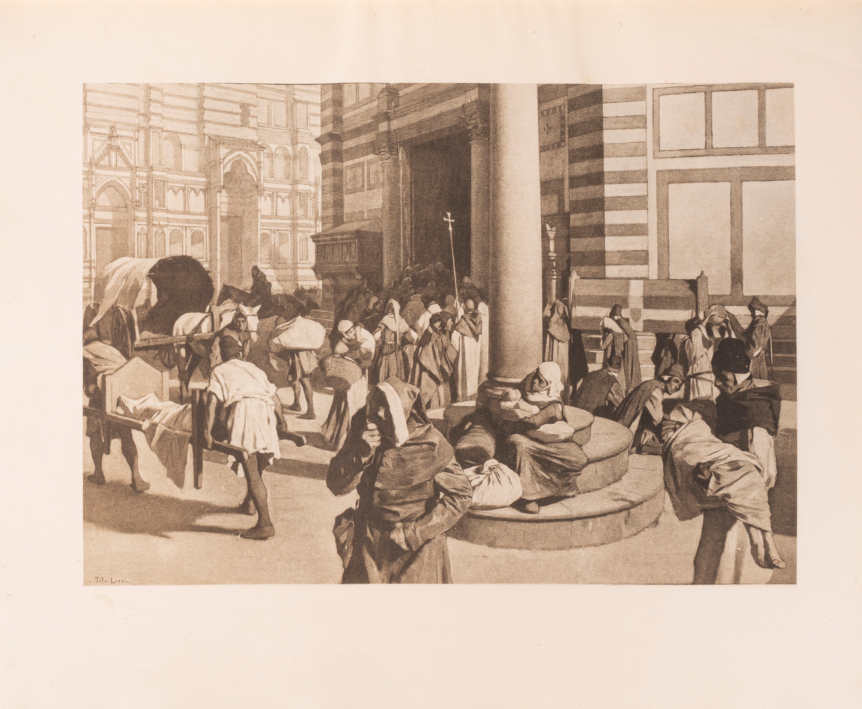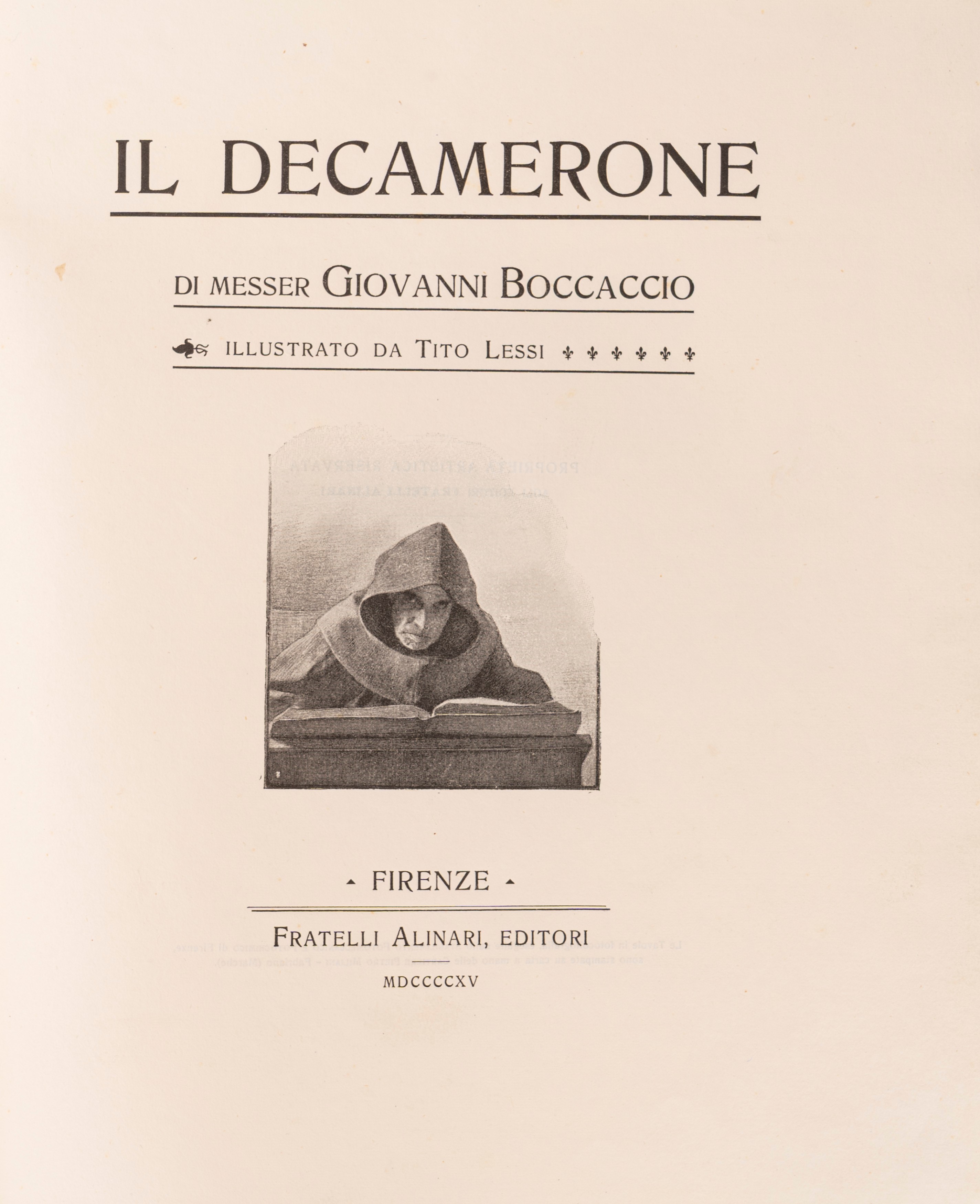 Firenze, Fratelli Alinari Editori, 1925. In 4°. Rilegatura in mezza pelle con piatti marmorizzati e rifiniture in oro. Dorso con 4 nervi e con autore, titolo, anno e fregi in oro. Copertina e dorso originali conservati. Sguardie marmorizzate. Taglio superiore in oro. Edizione illustrata da Tito Lessi. Esemplare in ottimo stato di conservazione, ad eccezione del difetto al dorso.