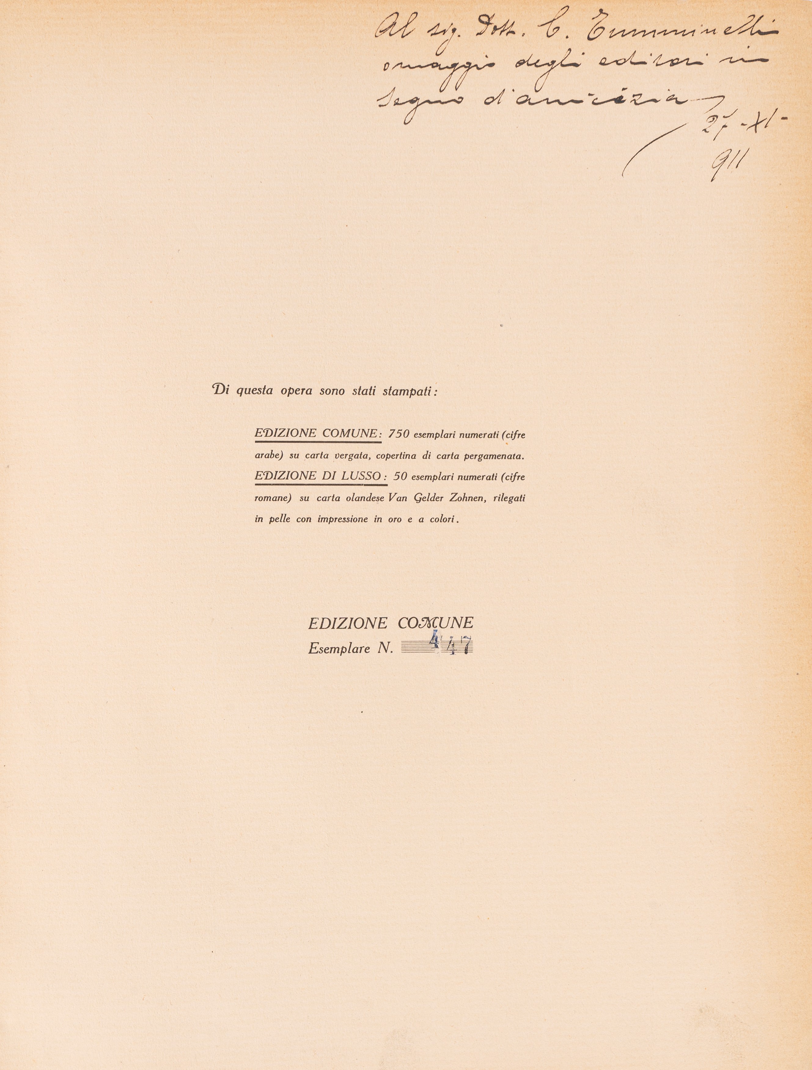 Milano, Alfieri e Lacroix Editori, 1911. In 8° grande. Copertina rigida in cartonato rivestito da carta pergamena. Esemplare su carta vergata e copertina in carta pergamena n. 447 di una tiratura limitata di 800 volumi. Dedica manoscritta degli editori. Presente ritratto dell'autore su foglio semimobile alla carta antecedente la IX. Edizione riccamente illustrata. Leggero ingiallimento delle pagine. Legatura allentata.