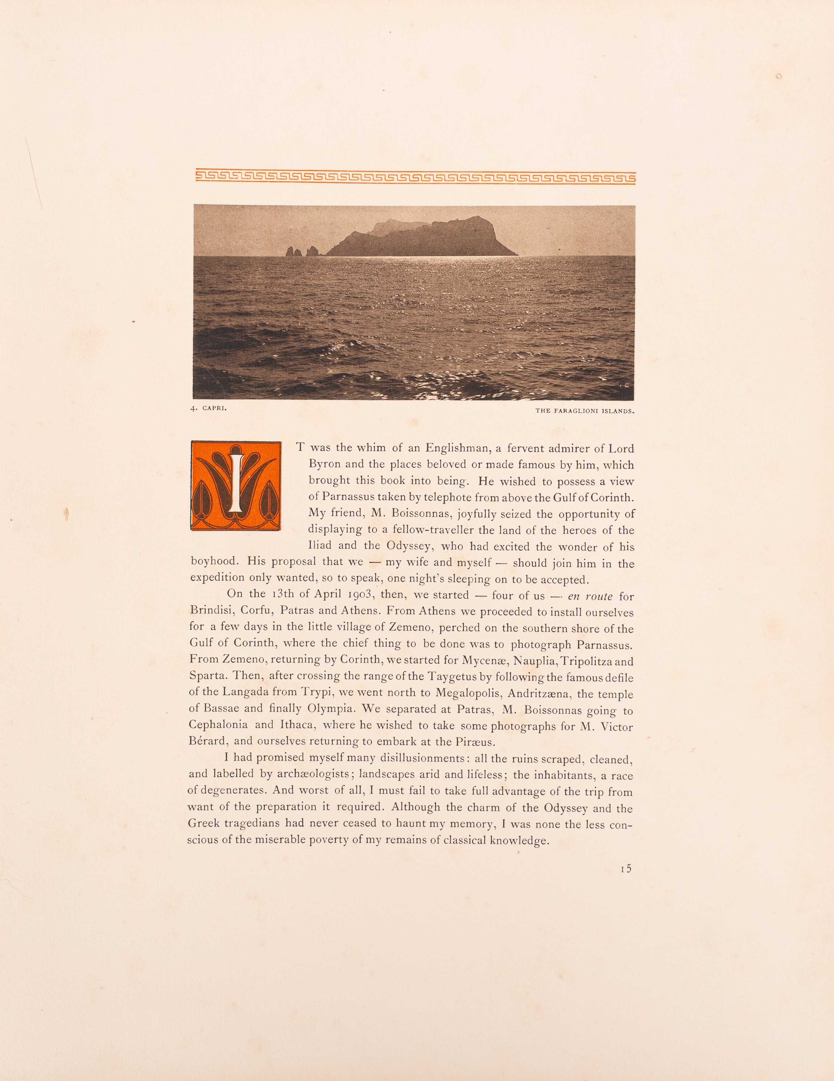 Ginevra, éditions d'art Fred. Boissonnas, 1909. In 4° grande. Brossura editoriale con titolo impresso al piatto anteriore e al dorso e decorazioni in arancione e oro. Esemplare n. 5 di una tiratura limitata di 300 volumi. Testo in inglese. 40 tavole fuori testo a piena pagina corredate di velina protettiva numerate I-XL. Numerose illustrazioni anche entro il testo. Leggero ingiallimento delle pagine e macchie sparse. Legatura leggermente allentata. Segni d'uso.