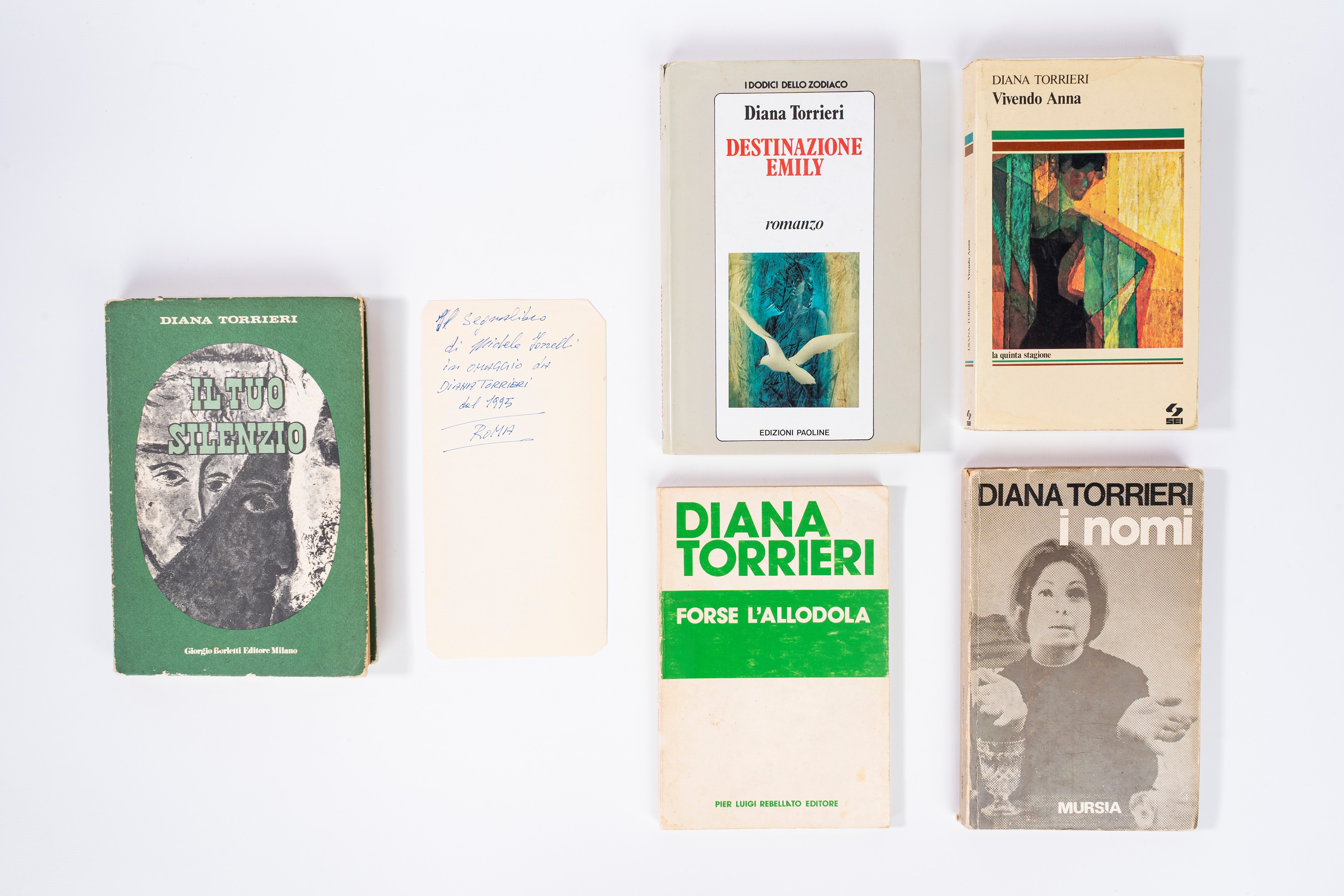 Il tuo silenzio, Prima edizione del 1973, casa editrice Giorgio Borletti. Brossura editoriale. Opera prima. Presente nel volume segnalibro dato in omaggio dall'autrice a Michele Torrelli (con indicazione autografa di Torrelli anche sul frontespizio), seguono nel lotto: