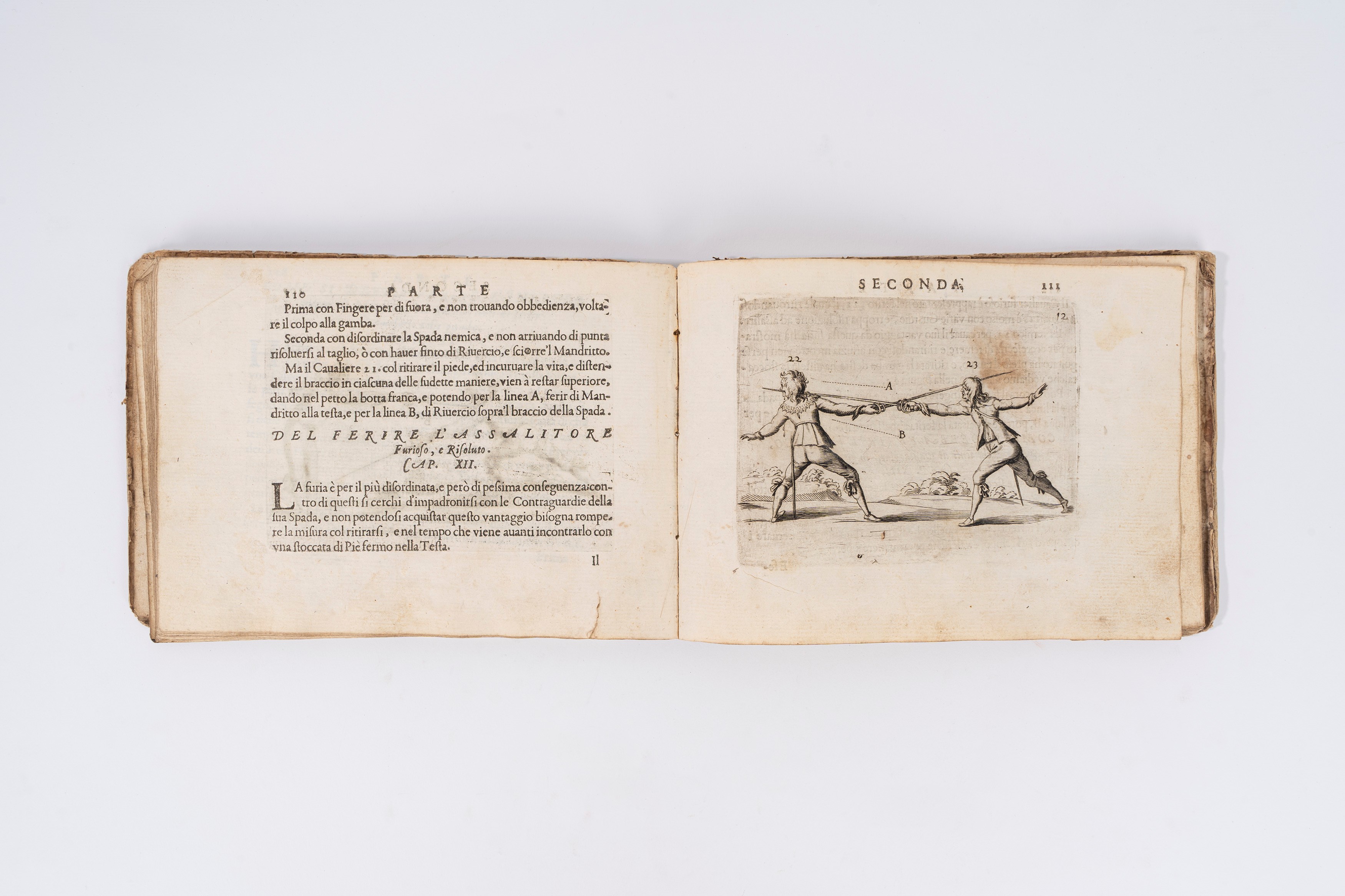 La Scherma di Francesco Fer.o Alfieri Maestro d'Armi dell'Ill.ma Accademia Delia in Padova. Dove con nove ragioni e con figure si mostra la perfezione di quest'Arte, e in che modo secondo l'arme e l'sito possa il Cavaliere restar al suo nemico superiore”, edito a Padova per Sebastiano Sardi, 1640. Legatura in mezza pelle con titoli e ricchi fregi in oro al dorso, ma stanca e con difetti. In 4° formato oblungo, due parti in unico volume. Con 35 illustrazioni calcografiche a piena pagina n.t. la cui numerazione all’interno dell’opera è errata secondo tutte le copie consultate, infatti la numerazione delle pagine è corretta mentre per quella delle tavole si va dalla nr. 19 alla nr. 21 e dalla nr. 31 alla nr. 33. Tavola nr.2 in coloritura d’epoca. Ultima carta bianca staccata. Opera rarissima del secolo d’oro della scherma.