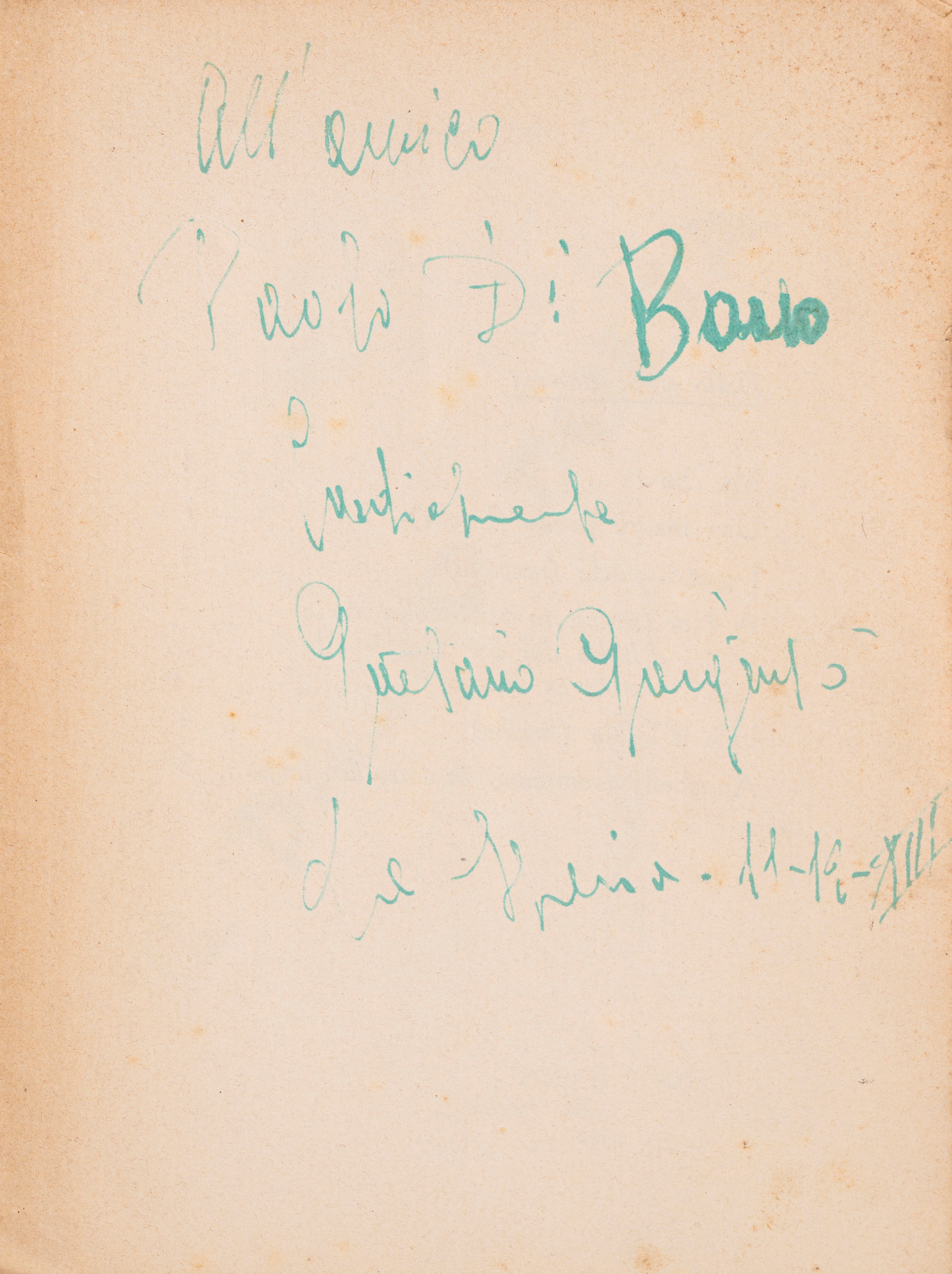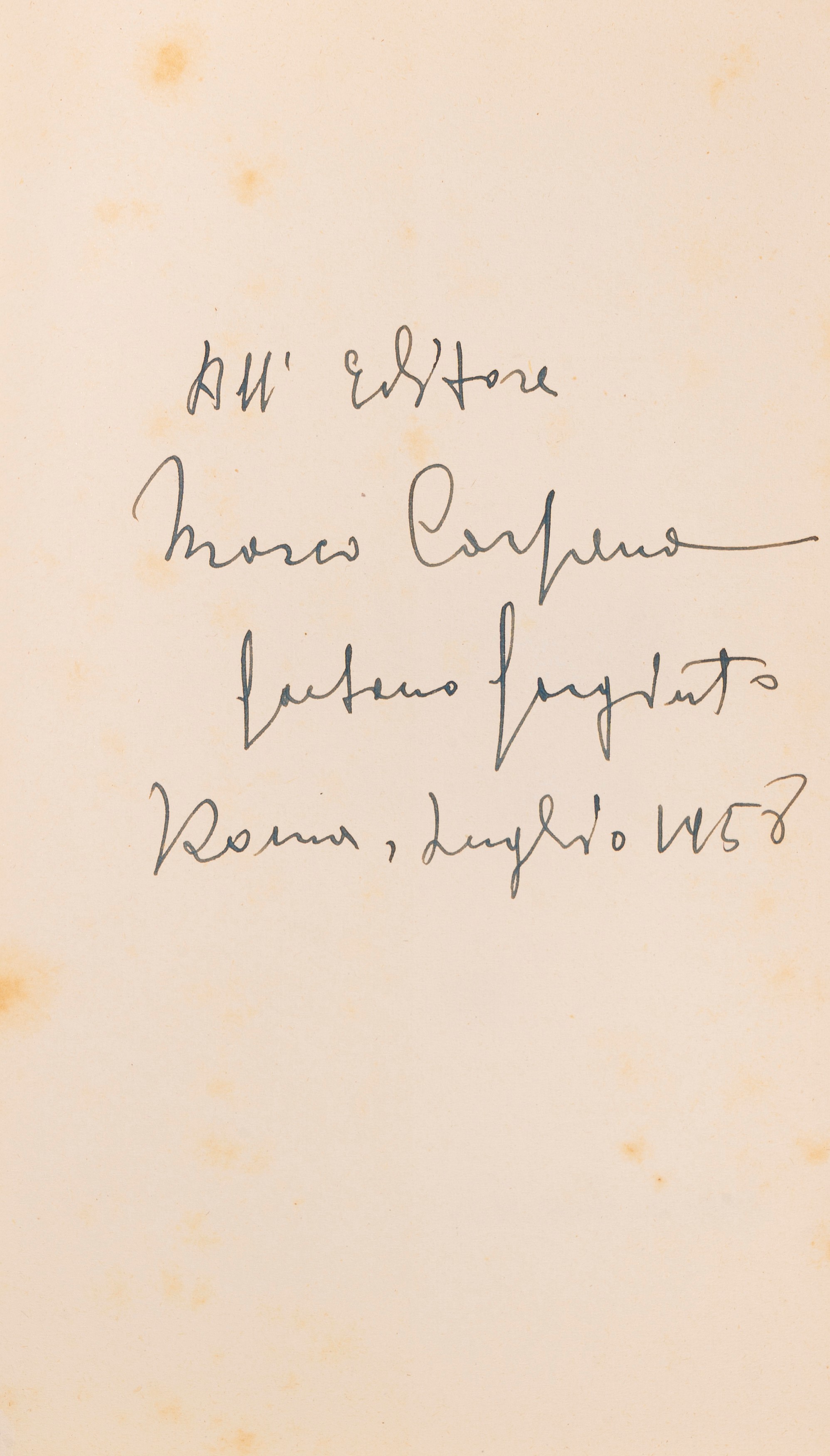 Prima edizione, 1958, casa editrice MIT, Corigliano Calabro. Brossura editoriale. Copia impreziosita da dedica autografa dell’autore all’editore Marco Carpena.