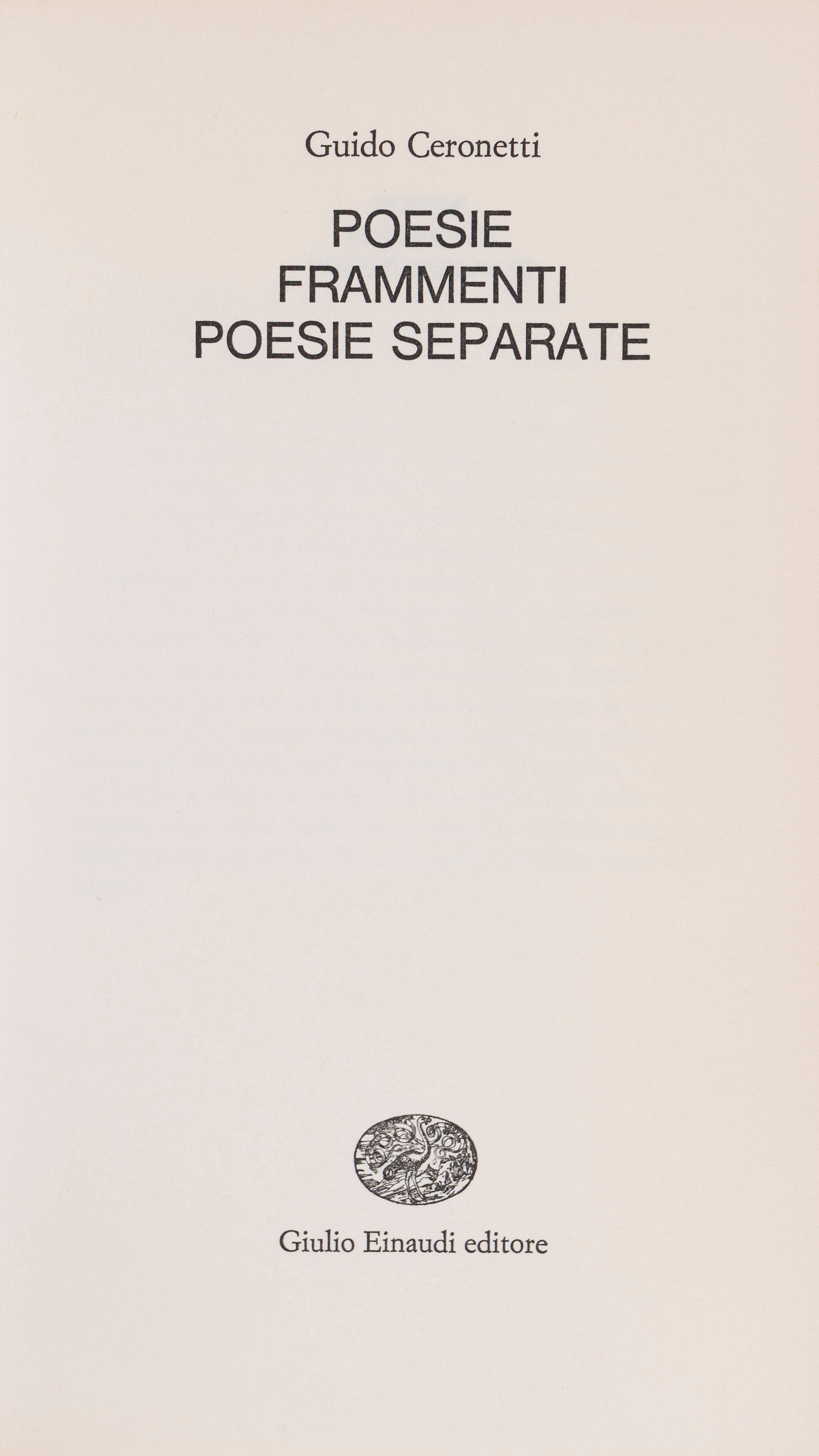 Prima edizione, 1968, casa editrice Einaudi. Brossura editoriale. Opera Terza. Con la presente raccolta di liriche, l’autore vinse il Premio Viareggio 1969. Amico di Roberto Calasso, fondatore della casa editrice Adelphi, Ceronetti fu una personalità eclettica di alto rango intellettuale. Tradusse dal latino, dall’ebraico antico, ma anche la poesia a lui contemporanea. Introdusse in Italia le opere di Emil M. Cioran. A tratti anche irriverente: nel 2014 propose in un articolo su la Repubblica, ispirandosi al fenomeno delle assistenti sessuali per disabili e alle proposte sull'affettività dei detenuti, l'istituzione di un "servizio erotico volontario" rivolto agli anziani senza che dovessero rivolgersi a prostitute, per evitare "la barbarie di una vecchiaia senza sesso".