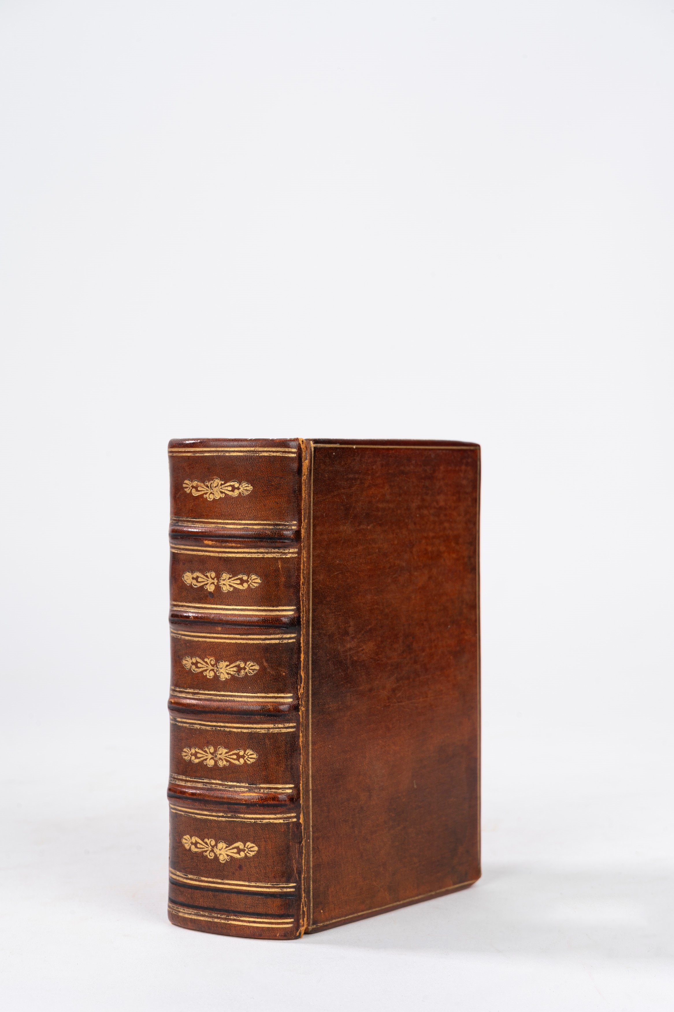 Piccolo volume 12,5 x 8 cm, 544 pagg. in splendida legatura muta recente, piena pelle con nervetti, fregi e cornici dorate ai piatti.