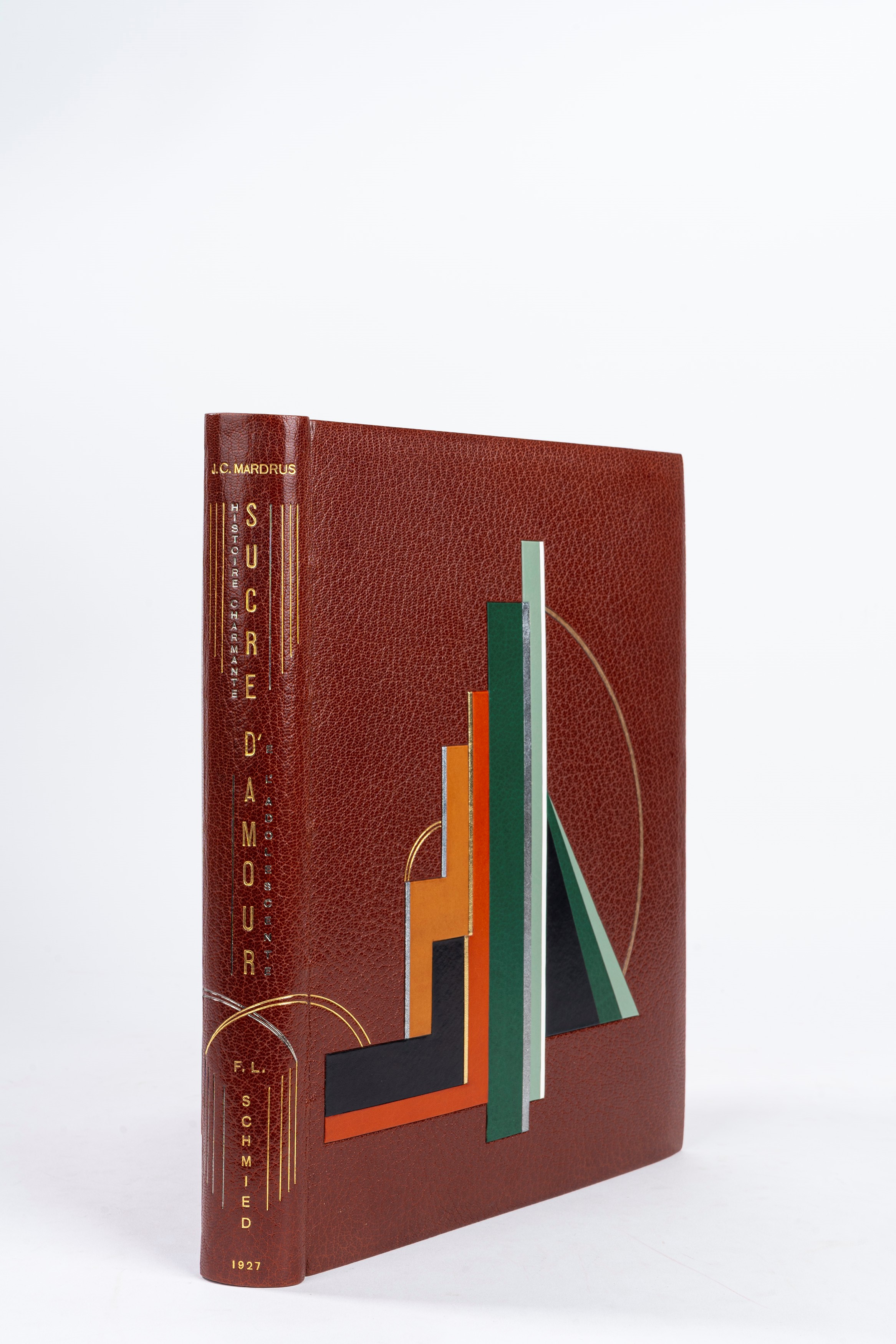 Paris: F.L. Schmied, 1927. In 4°, 305 x 253mm., numero 48 di 170 copie, firmate dall'artista, decorazione a pochoir e illustrazioni di Schmied, sciolte come da edizione in fascicoli originali stampati, SPLENDIDA LEGATURA FIRMATA ALIX, celebre legatore di rue Saint-André des Arts, attivo dal 1948 ed eletto “meilleur ouvrier de France” nel 1949, marocchino bruno con intarsi geometrici di pelle in vari colori, dorso finemente e riccamente decorato.