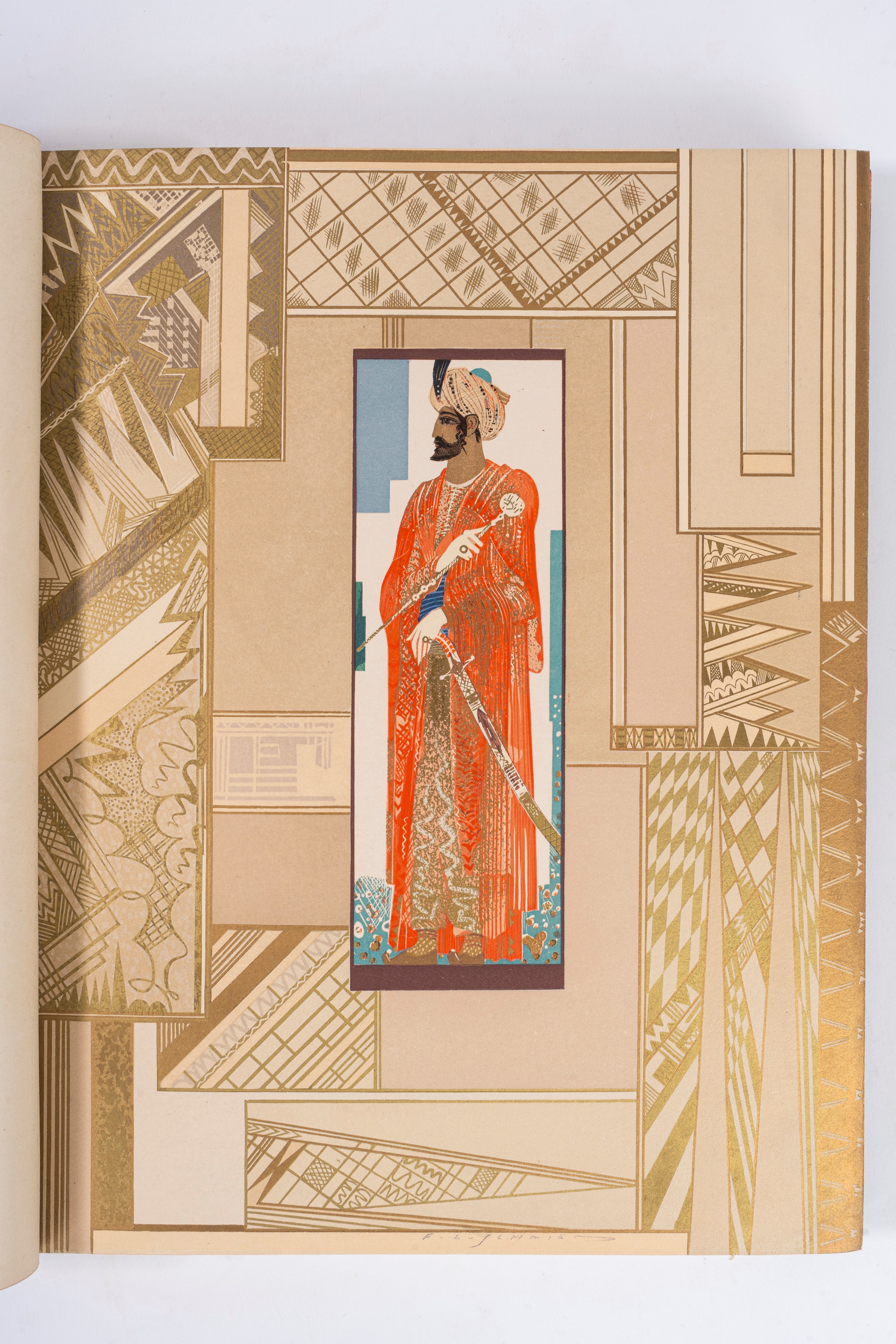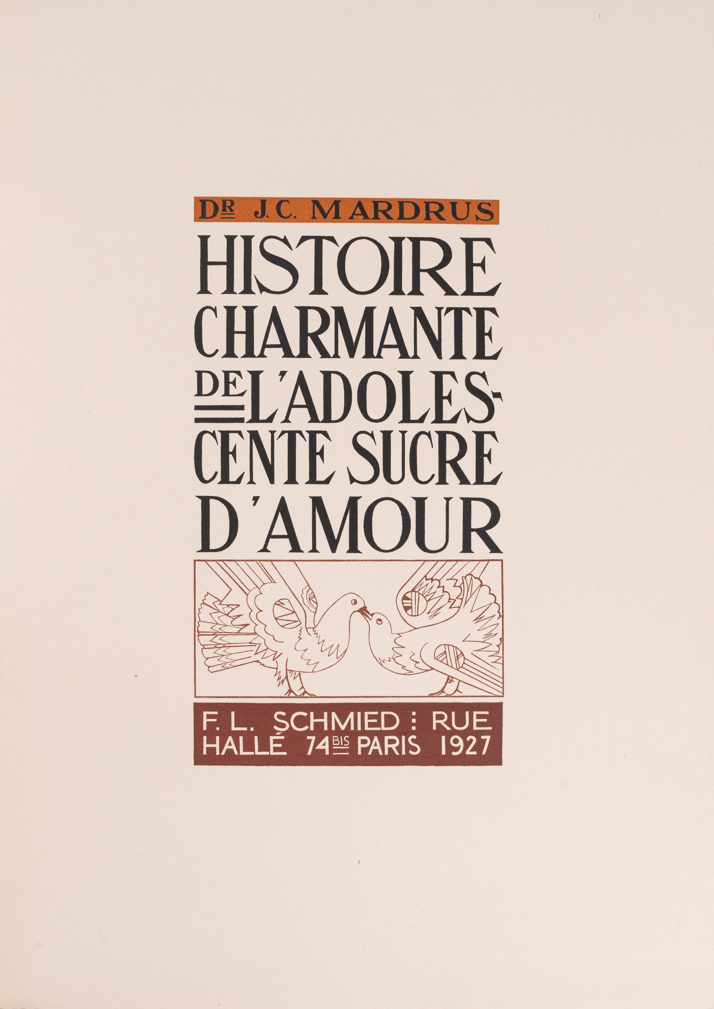 Il punto culminante della produzione libraria art déco di uno dei più importanti artisti del libro del secolo. Mardrus (1868-1949), francese nato al Cairo, tradusse in francese molte opere arabe, tra cui le più famose Mille e una notte; questo testo in particolare fu composto da Mardrus in stile orientale e corredato da belle illustrazioni di Schmied.
