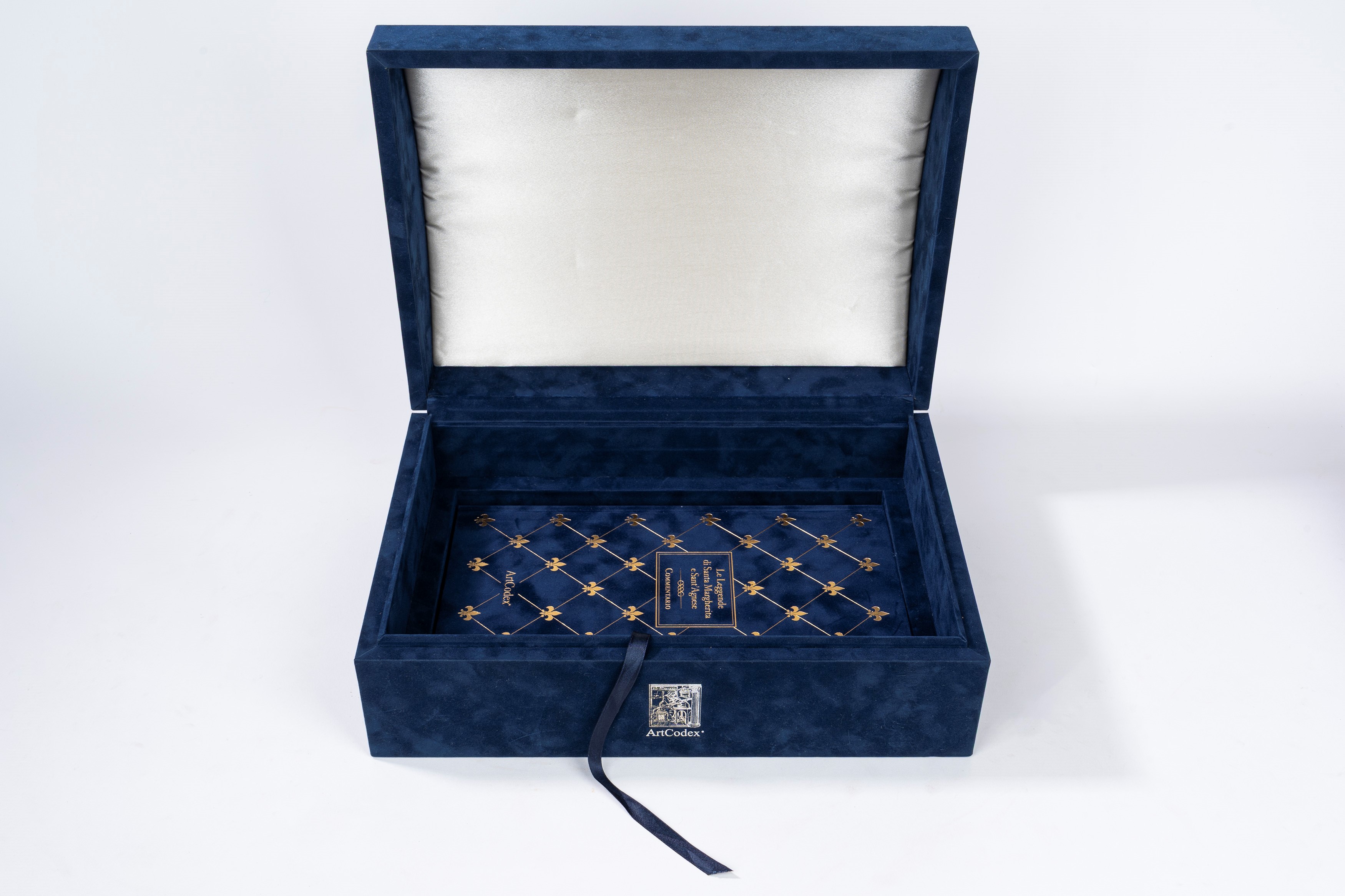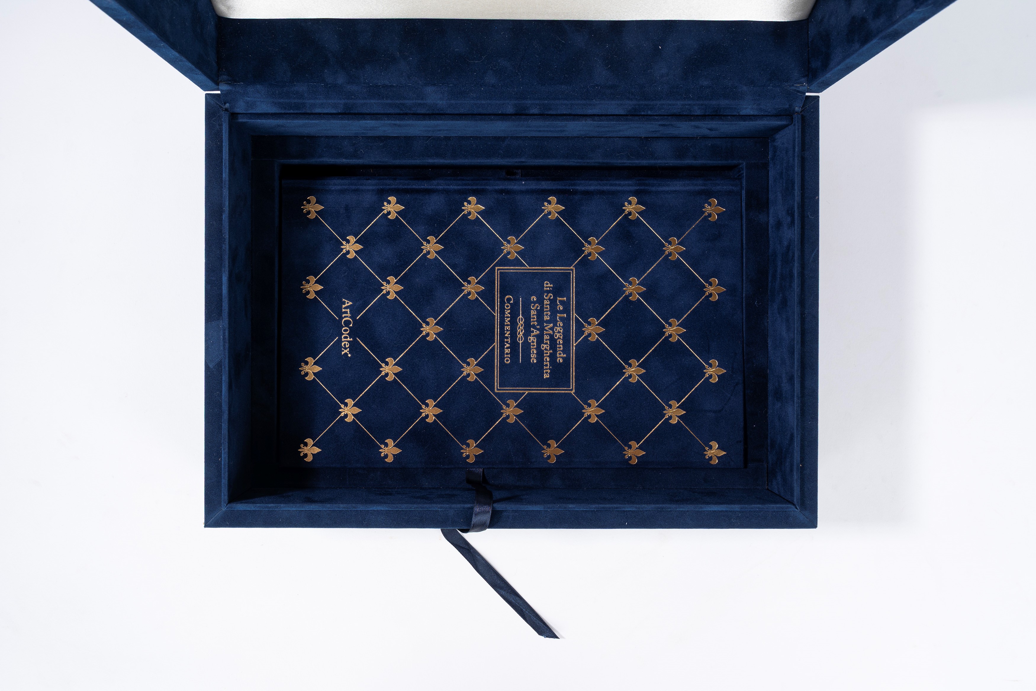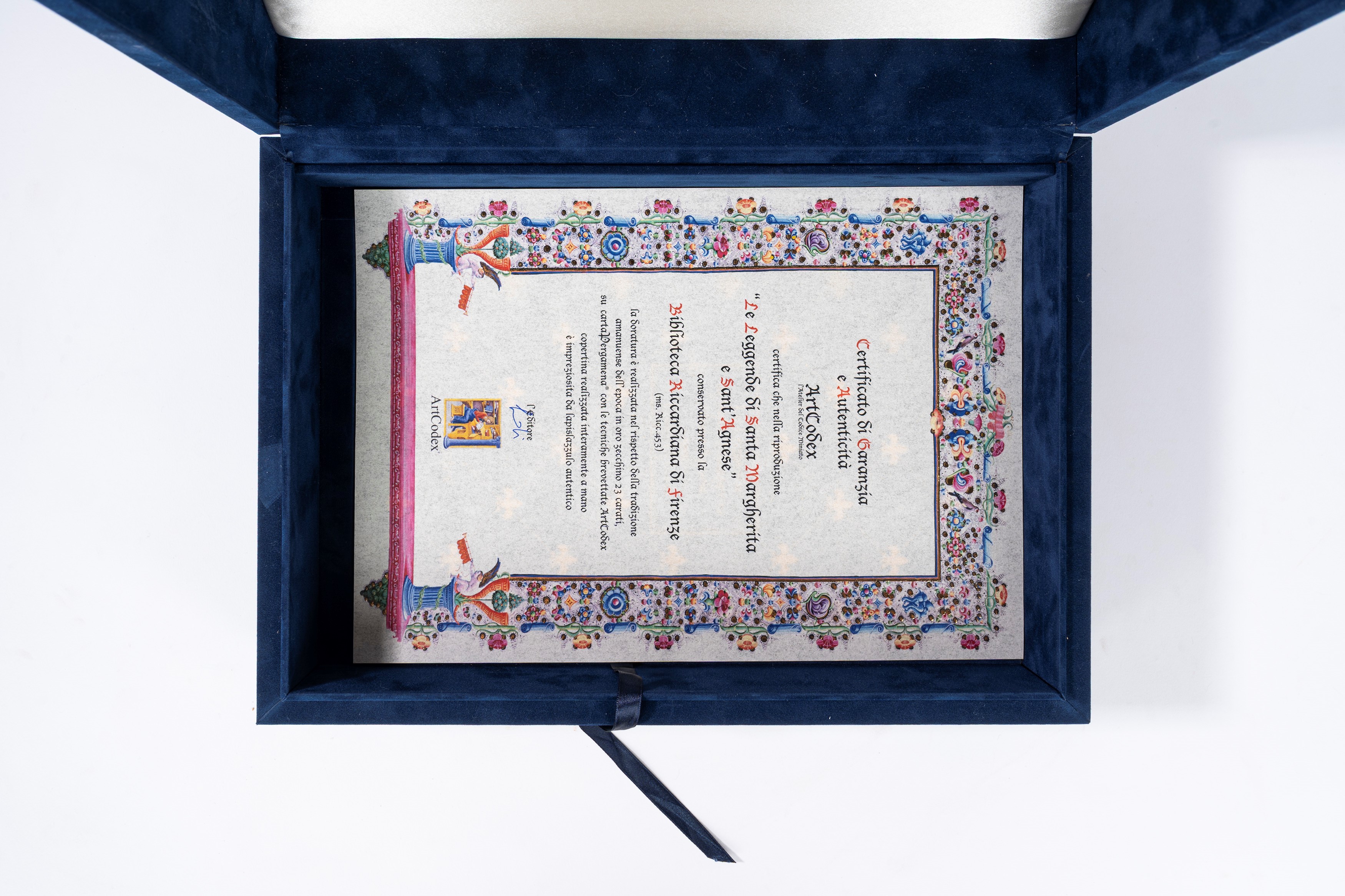 Copia 177 di 999. Artcodex, Modena, 2009. La leggenda della vita delle due sante ispirata ai modelli delle martiri bizantine. Il manoscritto è composto di due sezioni unite insieme probabilmente all’inizio del Trecento; solo la storia della Passione di Margherita di Antiochia è illustrata con immagini miniate che si pongono come commento visivo. Lettere filigranate scandiscono il testo e 33 miniature, oltre a due iniziali figurate. Legatura in velluto di seta, lapislazzuli, lamina argentata e dorata. Riproduzione integrale in oro zecchino 23Kt. L’opera e il commentario (a cura di Giovanna Lazzi) sono custoditi in un cofanetto blu con doppio scomparto.