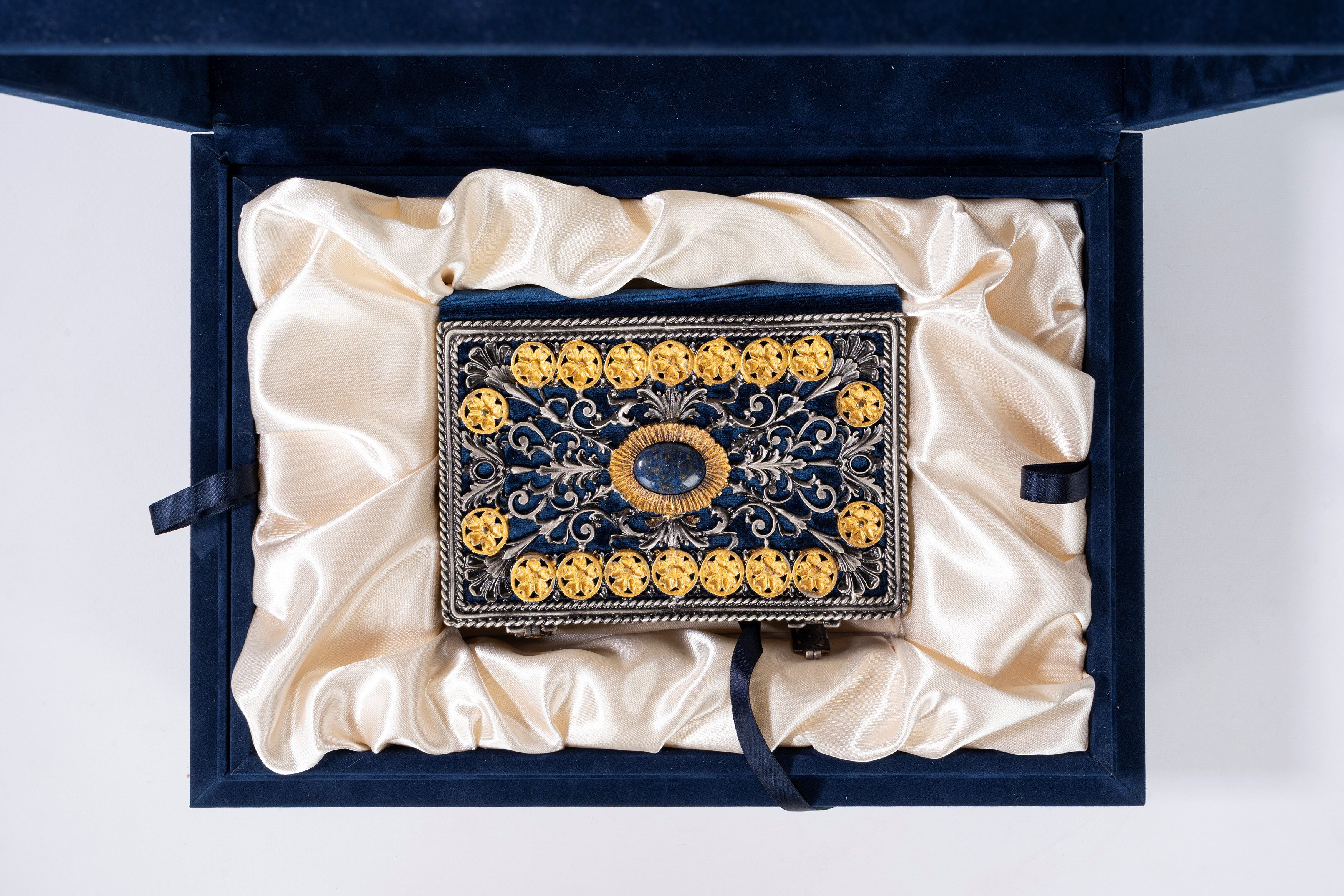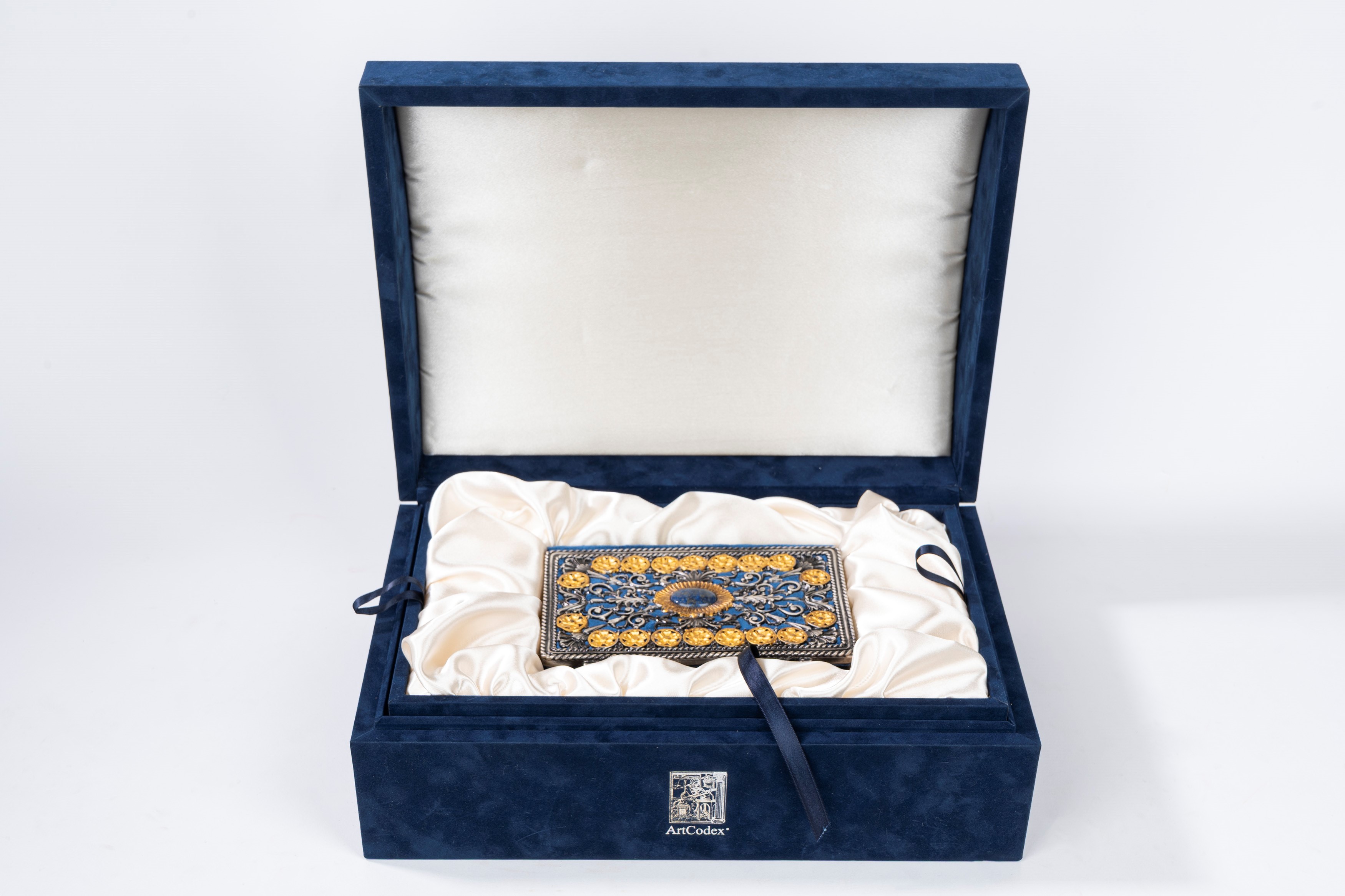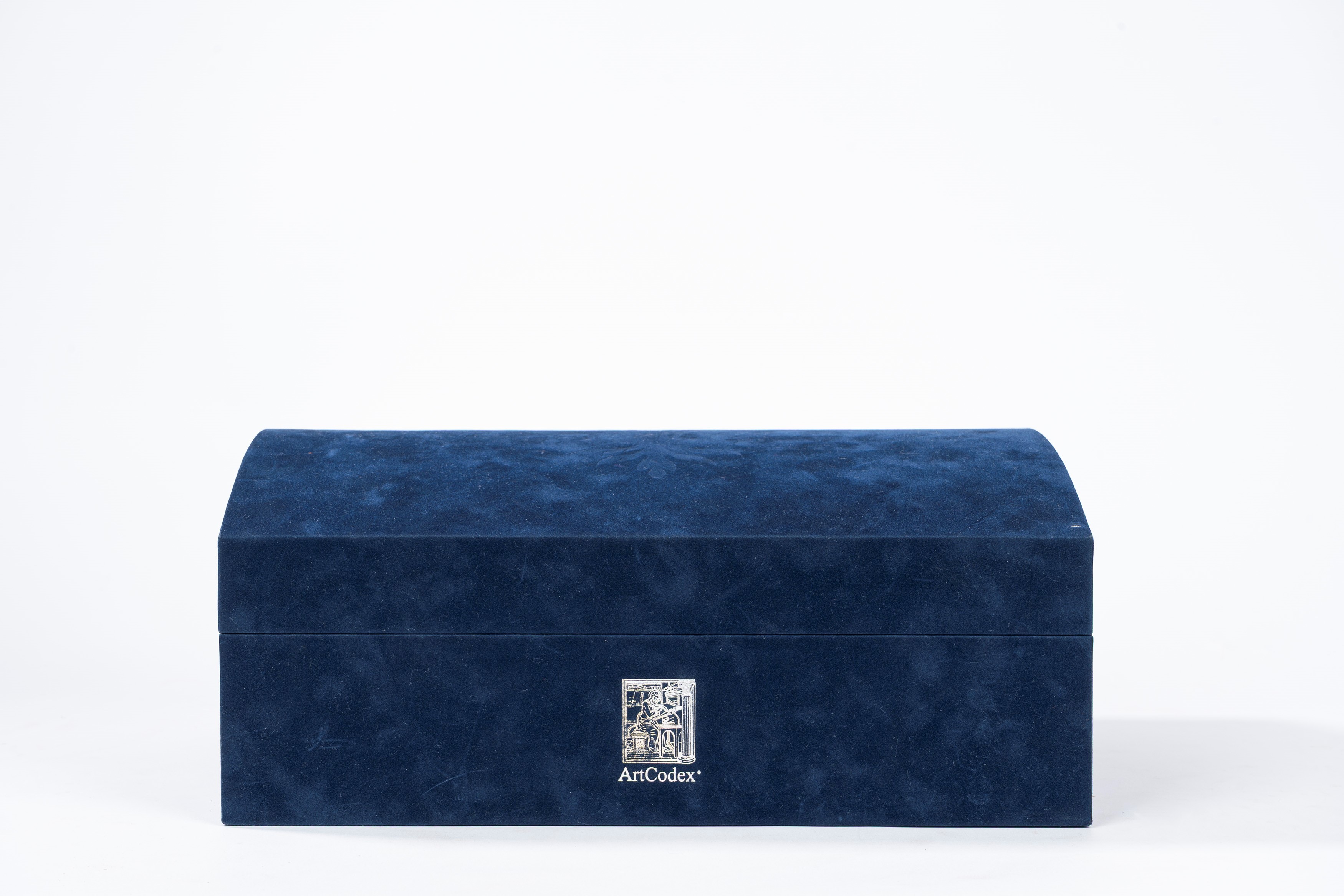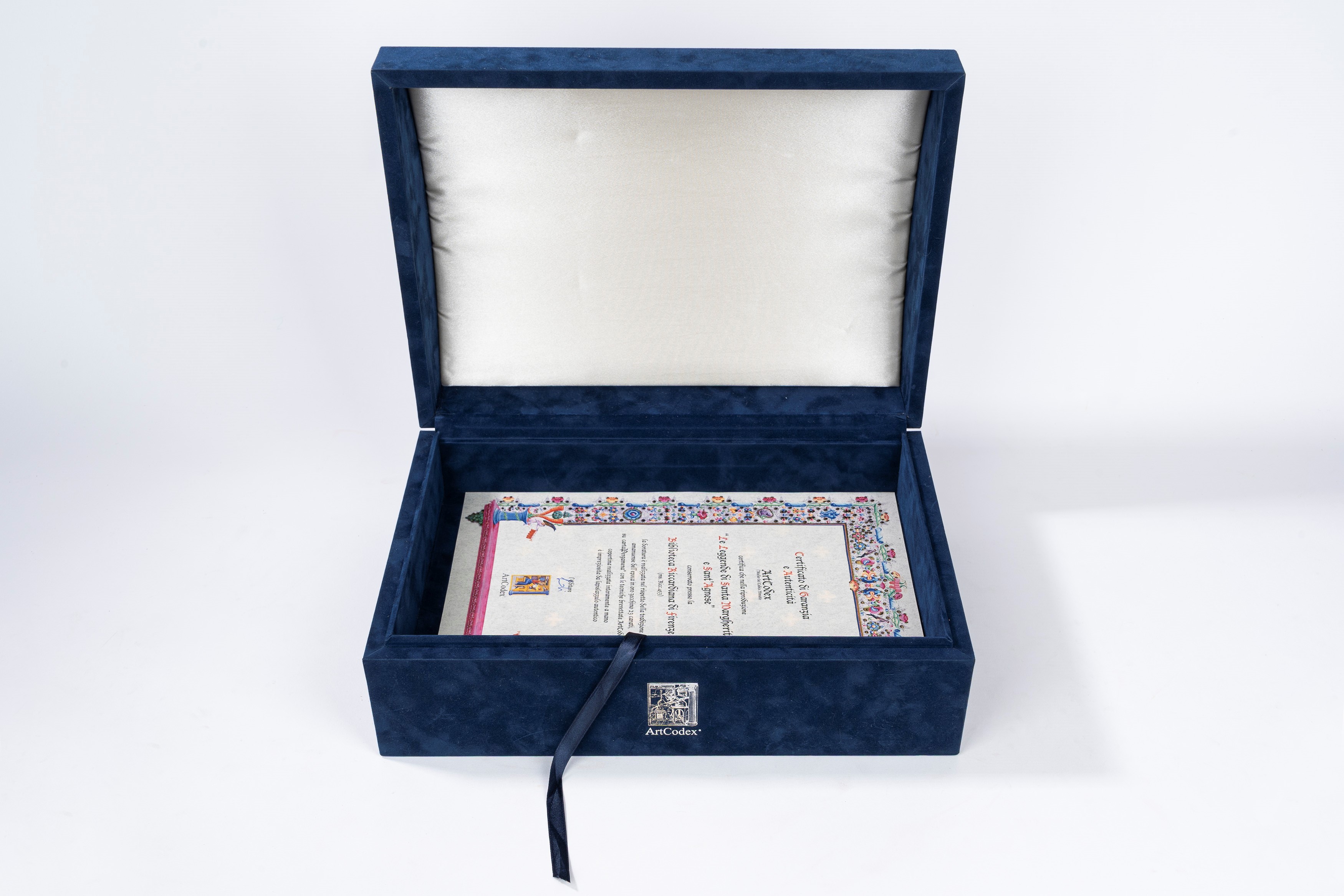 Copia 177 di 999. Artcodex, Modena, 2009. La leggenda della vita delle due sante ispirata ai modelli delle martiri bizantine. Il manoscritto è composto di due sezioni unite insieme probabilmente all’inizio del Trecento; solo la storia della Passione di Margherita di Antiochia è illustrata con immagini miniate che si pongono come commento visivo. Lettere filigranate scandiscono il testo e 33 miniature, oltre a due iniziali figurate. Legatura in velluto di seta, lapislazzuli, lamina argentata e dorata. Riproduzione integrale in oro zecchino 23Kt. L’opera e il commentario (a cura di Giovanna Lazzi) sono custoditi in un cofanetto blu con doppio scomparto.