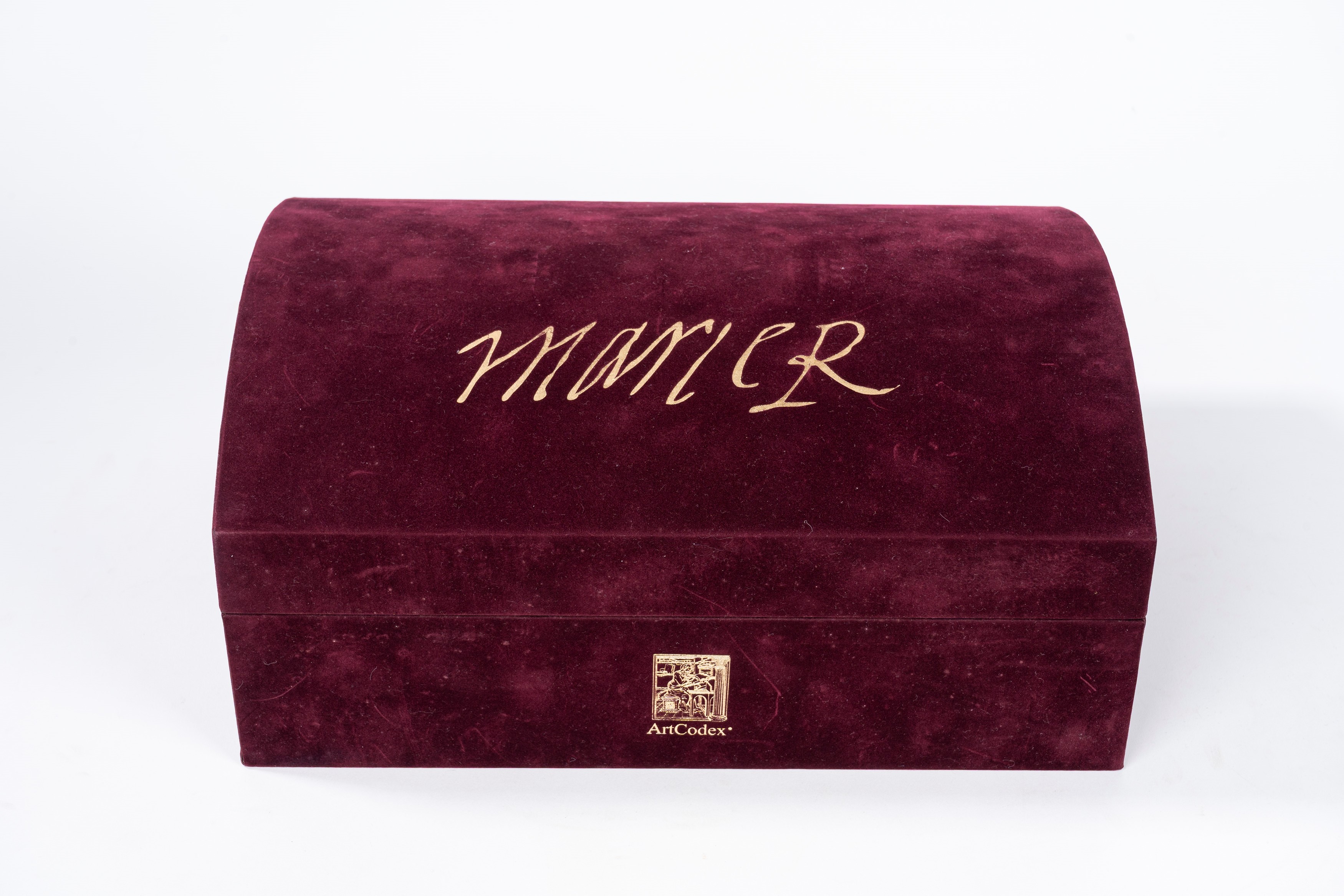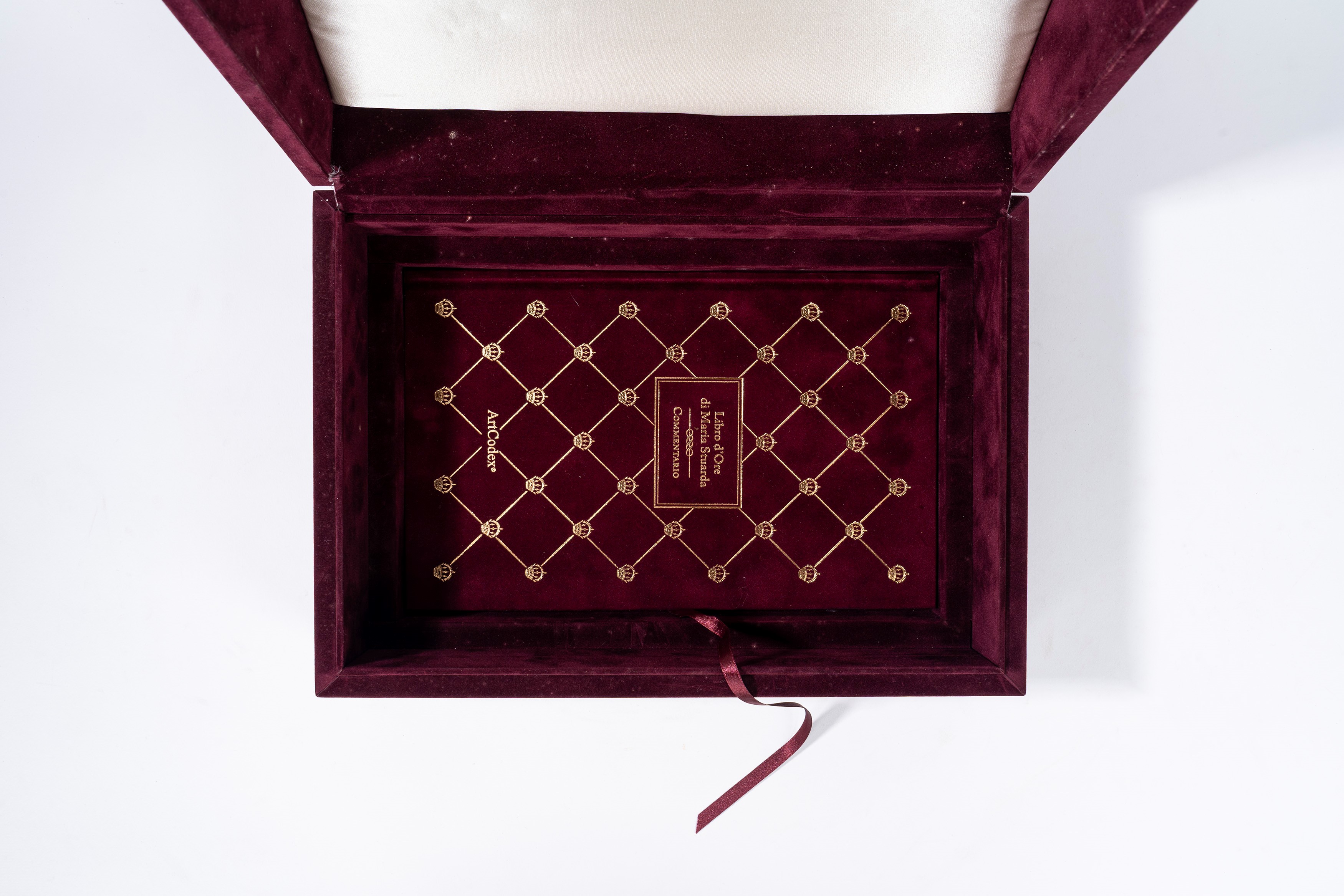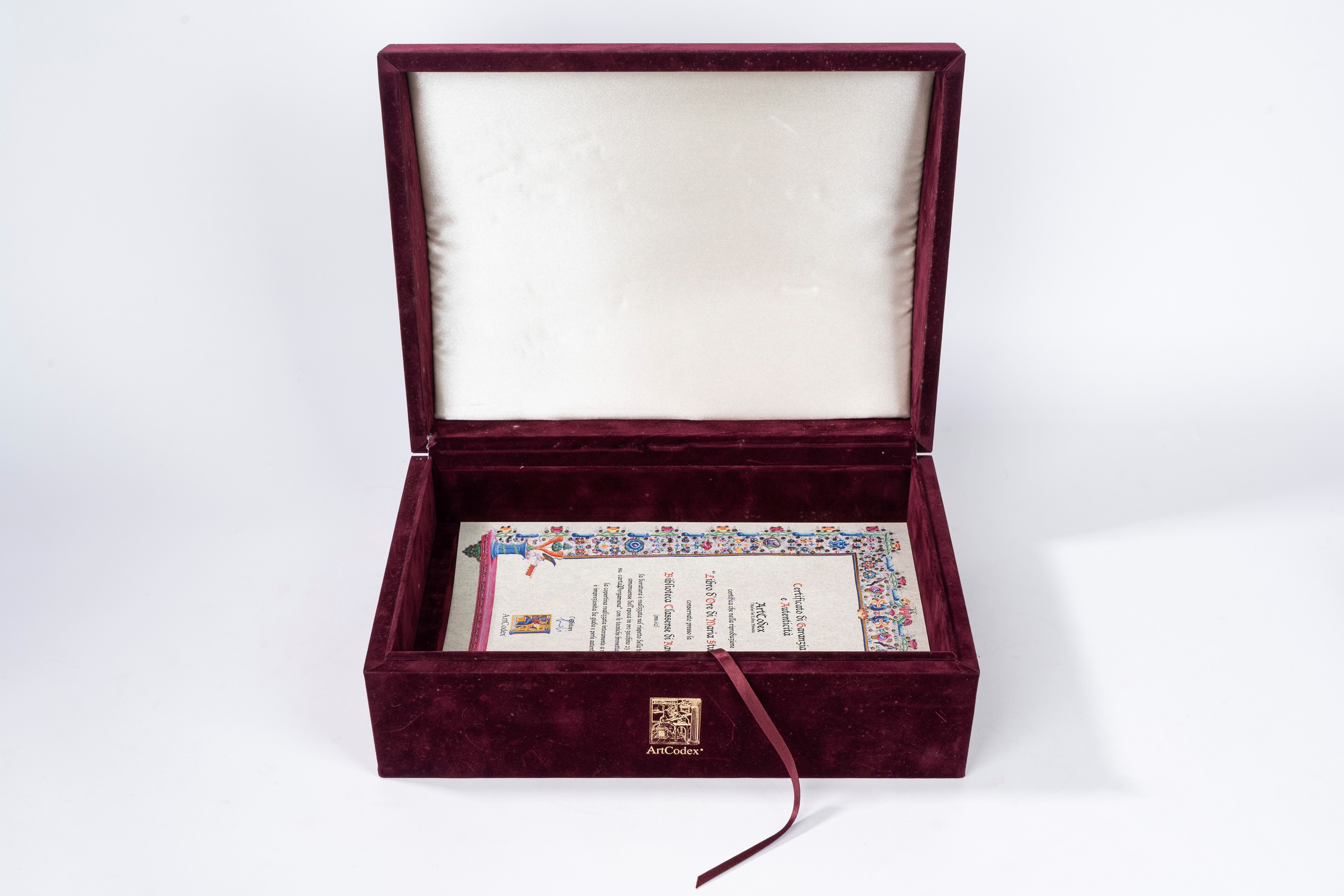 Copia n. 699 di 999. Riproduzione dettagliata a colori del codice originale, con riproduzione del mandato di esecuzione. Legatura in velluto rosso con decori in ottone e pietre dure, chiusa da fermagli. Entro cofanetto editoriale in velluto. Con un volume di commentario.