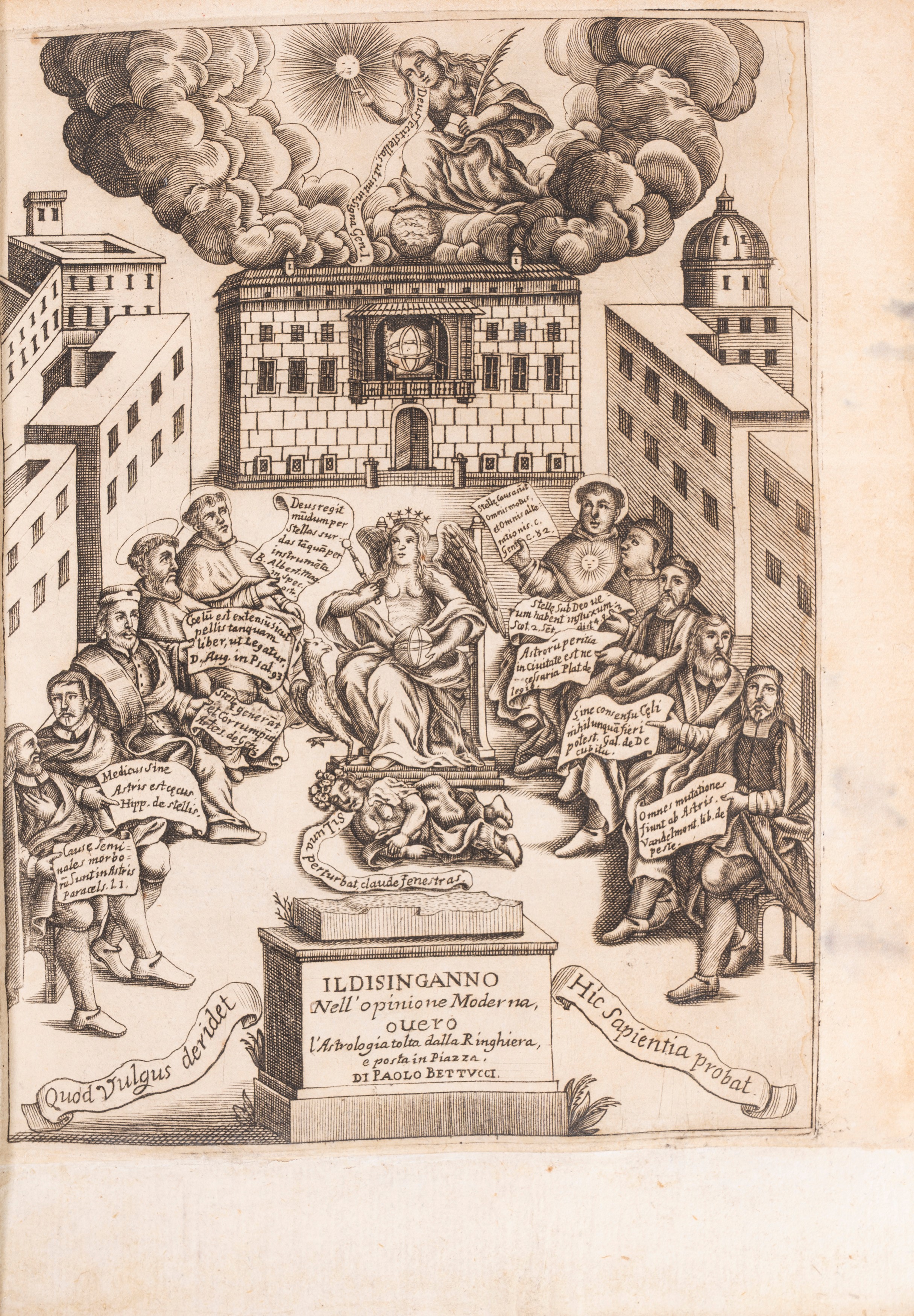 Il disinganno nell'opinione moderna overo L'Astrologia tolta dalla ringhiera e posta in Piazza, Con cui prova che l'Astrologia è una scienza data dal Sig. Iddio. E per ciò utilissima alla Repubblica…. In Napoli, con licenza de' Superiori, nella Stamparia di Francesco Benzi della Citta di Forlì, 1690. 4°, artistica antiporta allegorica incisa su rame. Legatura coeva in piena pergamena, titolo calligrafico.