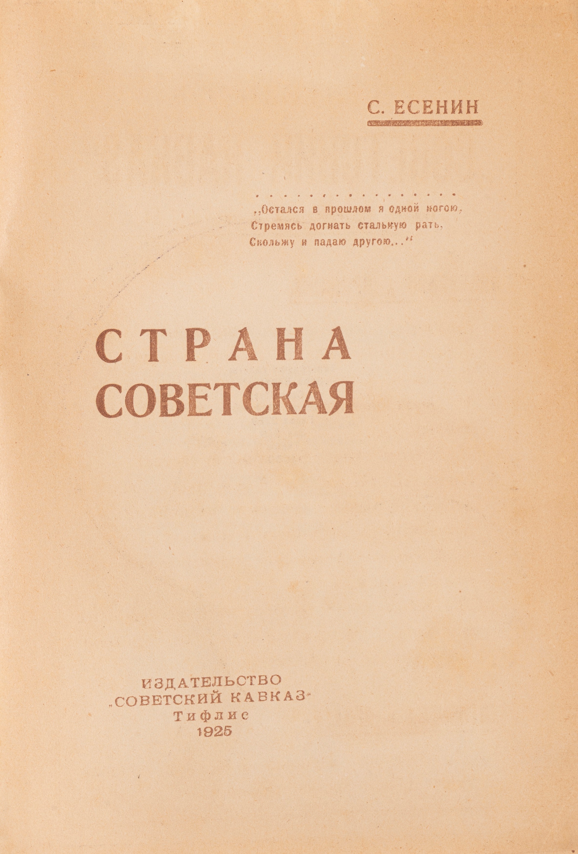 Tbilisi, Sovetskiy Kavkaz, 1925. In 8°. Esemplare in brossura editoriale. Copertina progettata da Zdanevich. Tiratura limitata di 5000 copie. Lievi bruniture. Alcuni fogli sono leggermente allentati.
