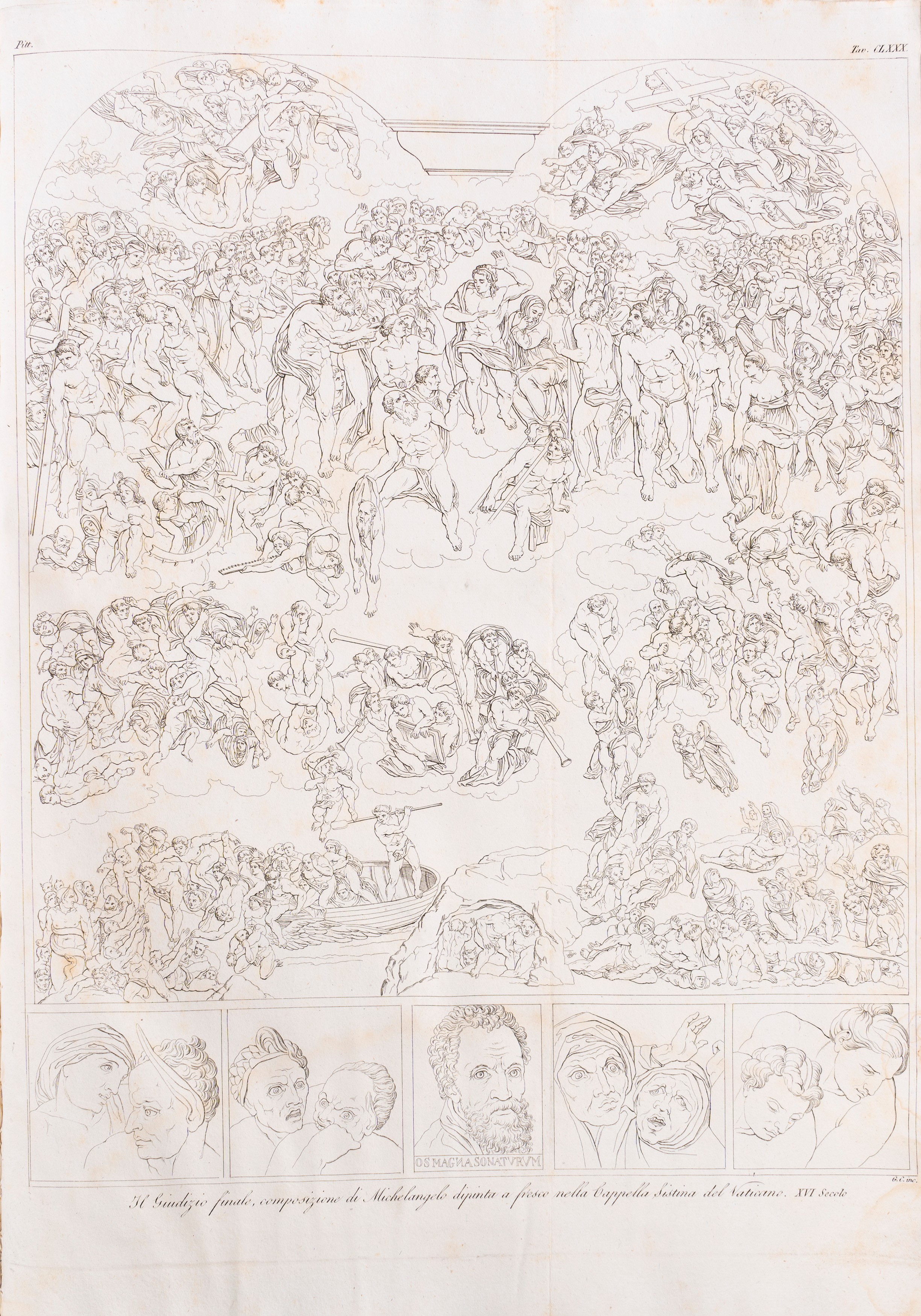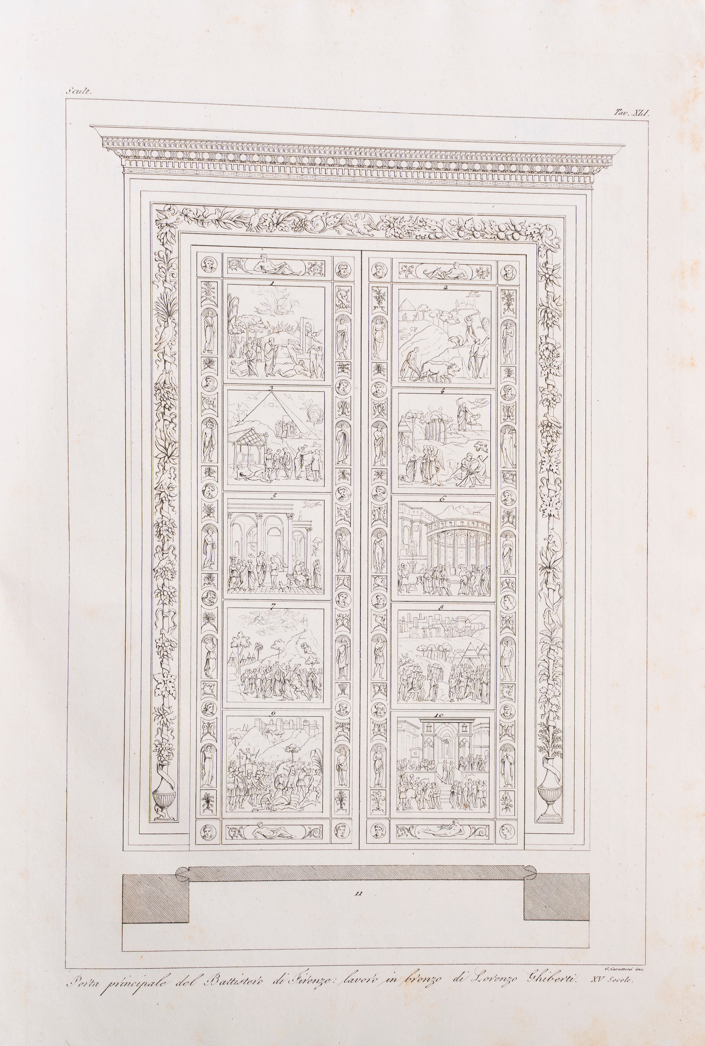 Milano. per Ranieri Fanfani, 1824-1825. In folio. Opera in 6 volumi. Legatura in mezza pelle. Dorso liscio con due tasselli recanti autore, titolo e numero del volume. Il secondo volume è corredato di 73 tavole d'architettura a piena pagina, mentre il quarto di 51 tavole di scultura (oltre la c. numerata XXVI, ci sono anche cc. di tavole numerate XXVI A, XXVI B e XXVI C). Il sesto volume presenta una sezione di 203 tavole di pittura a piena pagina. Lievi danni ai dorsi e ai piatti e leggere macchie di muffa.