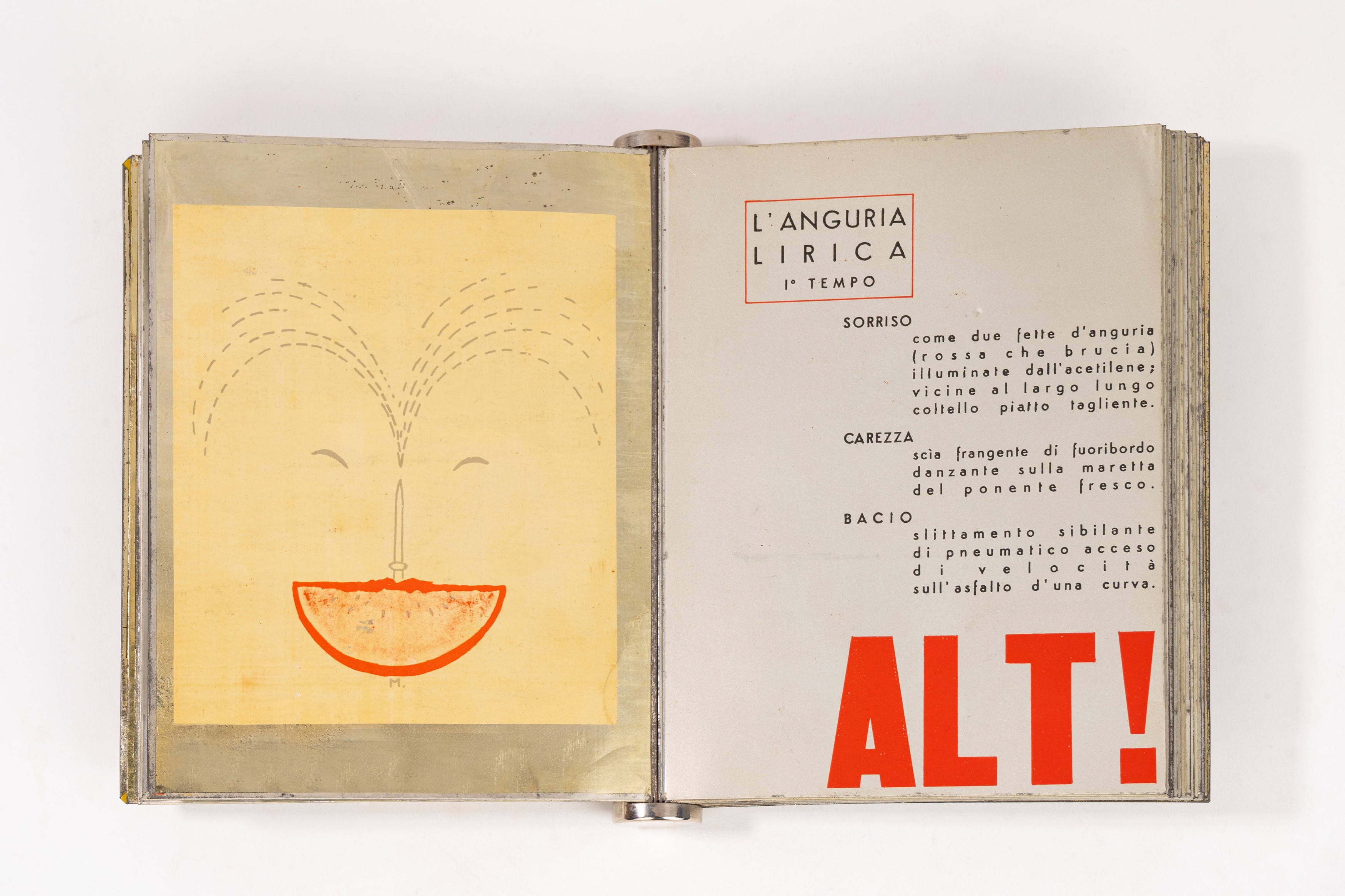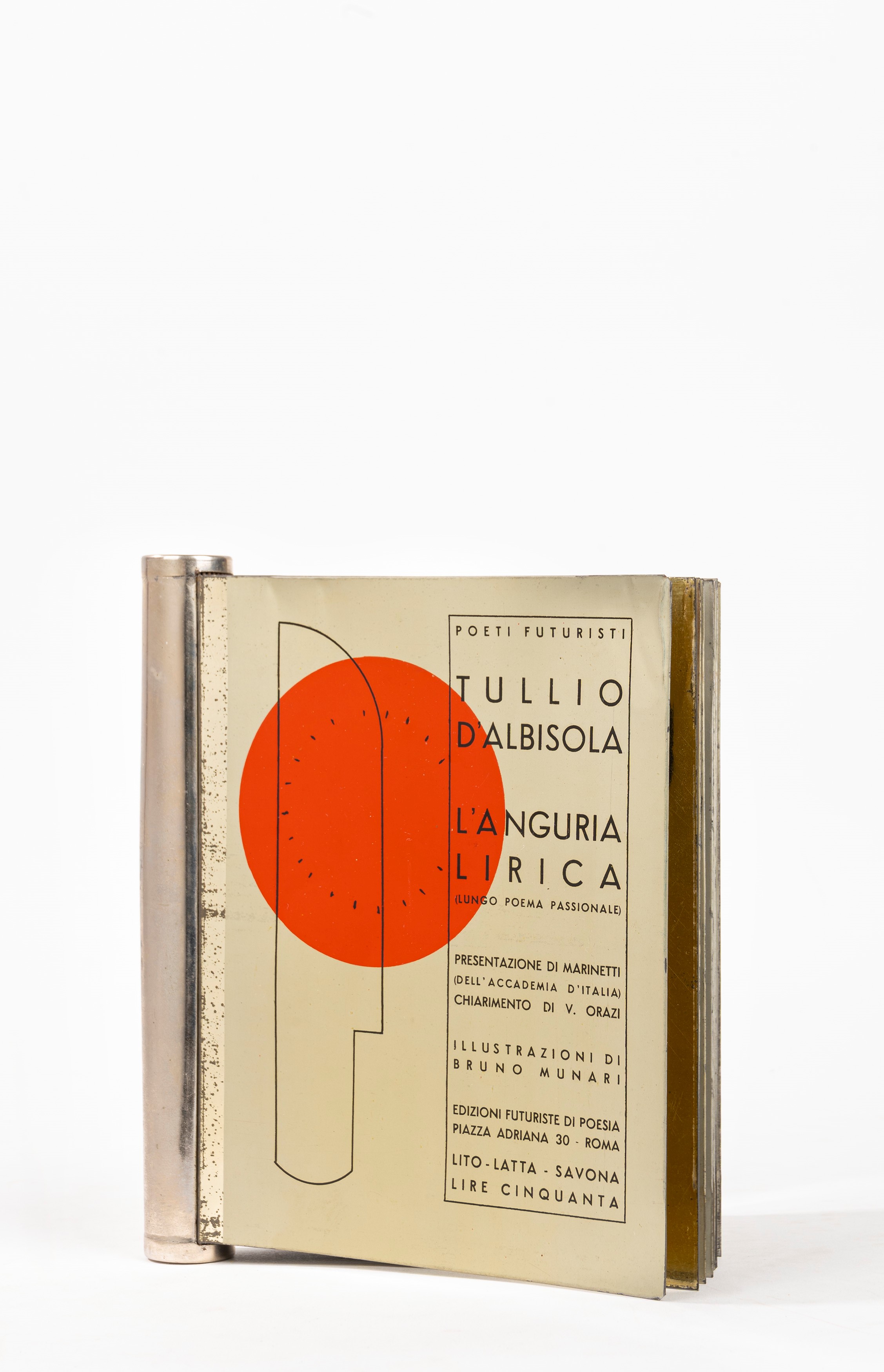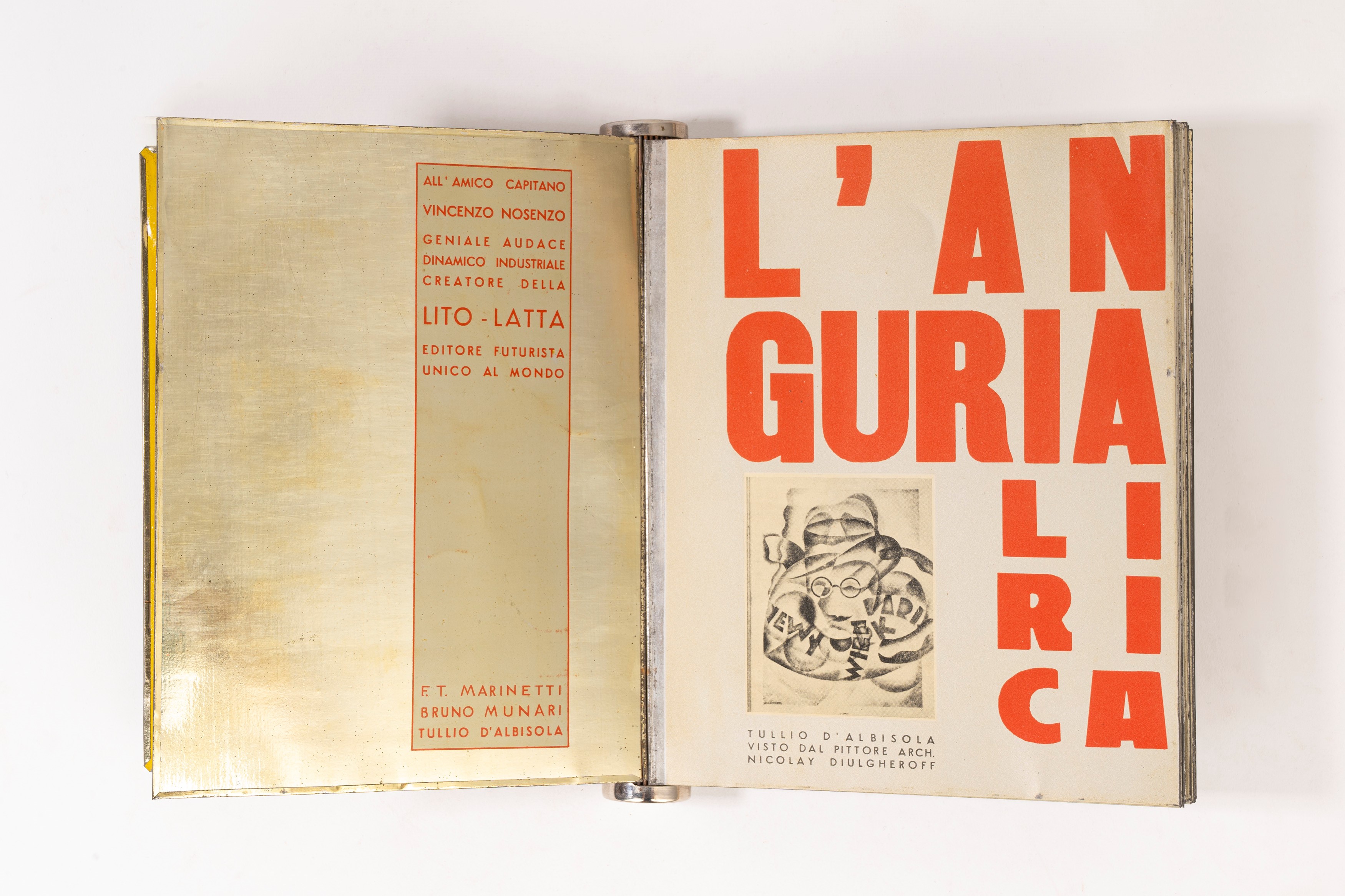 Edizioni Futuriste di Poesia (Roma), Lito-Latta Savona, 1934. Stampato su 21 fogli di metallo, con un ritratto di Diulgheroff, prefazione di Filippo Tommaso Marinetti e 12 litografie a piena pagina di Bruno Munari, legatura editoriale in metallo con dorso a cilindro, lievi ossidature, graffi e altri minimi difetti.